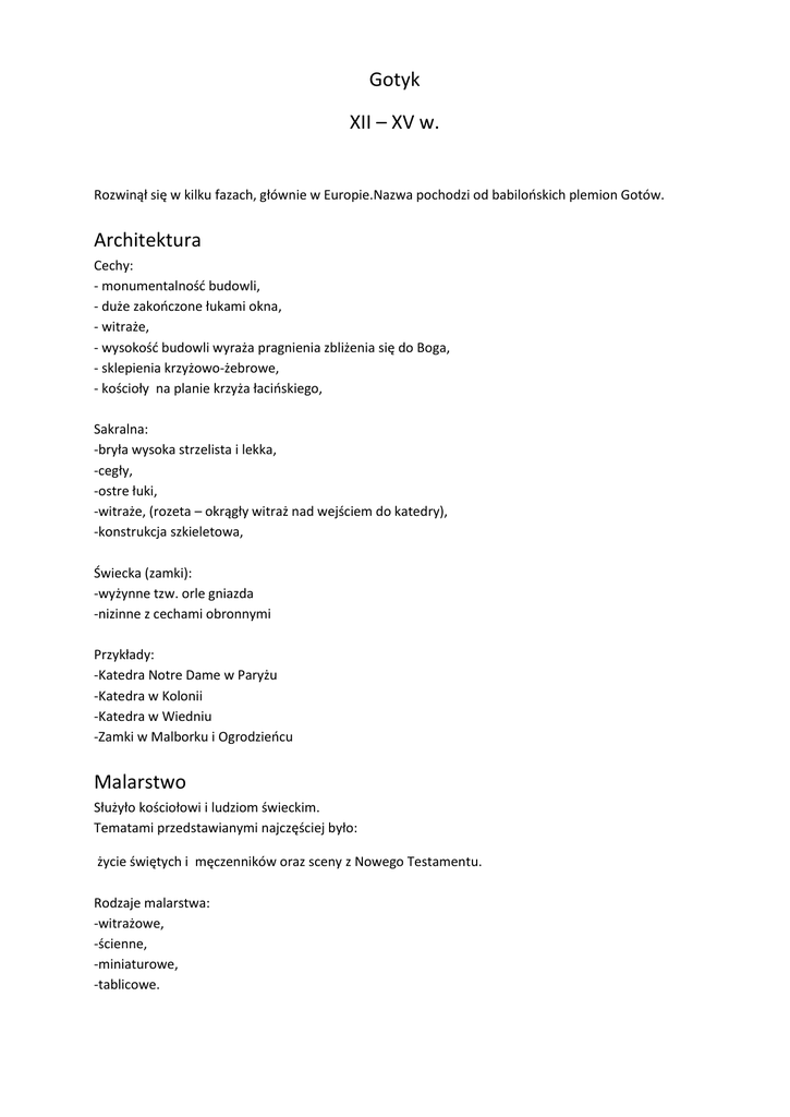 Gotyk XII – XV w. Rozwinął się w kilku fazach, głównie w Europie.Nazwa pochodzi od babilońskich plemion Gotów. Architektura Cechy: - monumentalność budowli, - duże zakończone łukami okna, - witraże, - wysokość budowli wyraża pragnienia zbliżenia się do Boga, - sklepienia krzyżowo-żebrowe, - kościoły na planie krzyża łacińskiego, Sakralna: -bryła wysoka strzelista i lekka, -cegły, -ostre łuki, -witraże, (rozeta – okrągły witraż nad wejściem do katedry), -konstrukcja szkieletowa, Świecka (zamki): -wyżynne tzw. orle gniazda -nizinne z cechami obronnymi Przykłady: -Katedra Notre Dame w Paryżu -Katedra w Kolonii -Katedra w Wiedniu -Zamki w Malborku i Ogrodzieńcu Malarstwo Służyło kościołowi i ludziom świeckim. Tematami przedstawianymi najczęściej było: życie świętych i męczenników oraz sceny z Nowego Testamentu. Rodzaje malarstwa: -witrażowe, -ścienne, -miniaturowe, -tablicowe. Rzeźba Materiałem był kamień i drewno. Najważniejszymi tematami są: pieta, krucyfiks, madonna z dzieciątkiem.