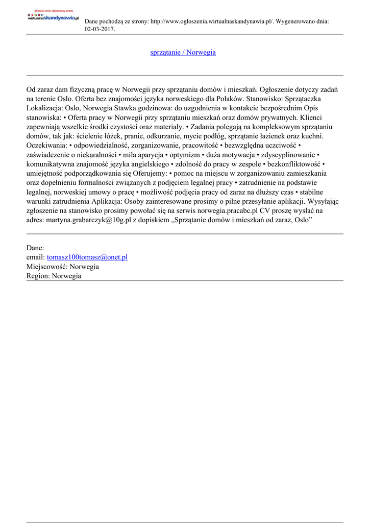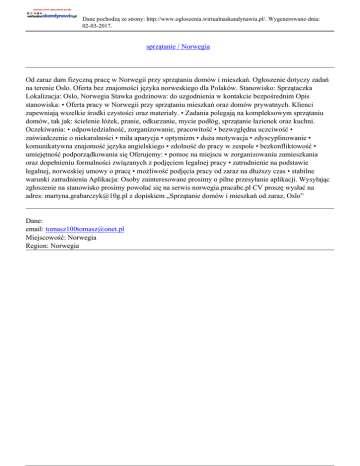 Dane pochodzą ze strony: http://www.ogloszenia.wirtualnaskandynawia.pl/. Wygenerowano dnia: 02-03-2017. sprzątanie / Norwegia Od zaraz dam fizyczną pracę w Norwegii przy sprzątaniu domów i mieszkań. Ogłoszenie dotyczy zadań na terenie Oslo. Oferta bez znajomości języka norweskiego dla Polaków. Stanowisko: Sprzątaczka Lokalizacja: Oslo, Norwegia Stawka godzinowa: do uzgodnienia w kontakcie bezpośrednim Opis stanowiska: • Oferta pracy w Norwegii przy sprzątaniu mieszkań oraz domów prywatnych. Klienci zapewniają wszelkie środki czystości oraz materiały. • Zadania polegają na kompleksowym sprzątaniu domów, tak jak: ścielenie łóżek, pranie, odkurzanie, mycie podłóg, sprzątanie łazienek oraz kuchni. Oczekiwania: • odpowiedzialność, zorganizowanie, pracowitość • bezwzględna uczciwość • zaświadczenie o niekaralności • miła aparycja • optymizm • duża motywacja • zdyscyplinowanie • komunikatywna znajomość języka angielskiego • zdolność do pracy w zespole • bezkonfliktowość • umiejętność podporządkowania się Oferujemy: • pomoc na miejscu w zorganizowaniu zamieszkania oraz dopełnieniu formalności związanych z podjęciem legalnej pracy • zatrudnienie na podstawie legalnej, norweskiej umowy o pracę • możliwość podjęcia pracy od zaraz na dłuższy czas • stabilne warunki zatrudnienia Aplikacja: Osoby zainteresowane prosimy o pilne przesyłanie aplikacji. Wysyłając zgłoszenie na stanowisko prosimy powołać się na serwis norwegia.pracabc.pl CV proszę wysłać na adres: [email protected] z dopiskiem „Sprzątanie domów i mieszkań od zaraz, Oslo” Dane: email: [email protected] Miejscowość: Norwegia Region: Norwegia
