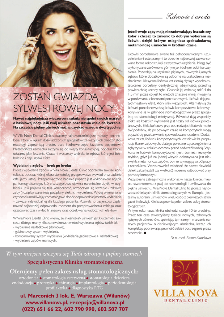 Zdrowie i uroda Jeżeli twoje zęby mają niezadowalający kształt czy kolor i chcesz to zmienić to dobrym wyborem są licówki, dzięki którym osiągniesz spektakularną metamorfozę uśmiechu w krótkim czasie. ZostAń GWiAZDą syLWEstRoWEJ NoCy Nawet najpiękniejsza wieczorowa suknia nie spełni twoich marzeń o baśniowej nocy, jeśli twój uśmiech pozostawia wiele do życzenia. Na szczęście piękny uśmiech można uzyskać nawet w dwa tygodnie. W Villa Nova Dental Clinic stosujemy najnowocześniejsze metody i technologie, które w rękach doświadczonych specjalistów ze wszystkich dziedzin stomatologii zapewniają proste, białe i zdrowe zęby każdemu pacjentowi. Metamorfoza uśmiechu zaczyna się od wizyty konsultacyjnej, podczas której ustalamy plan leczenia. Czasami wystarczy wybielanie zębów, które jest bezbolesne i daje szybki efekt. Wybielanie zębów – krok po kroku Proces wybielania zębów w Villa Nova Dental Clinic poprzedza zawsze konsultacja, podczas której lekarz stomatolog przeprowadza wywiad oraz badanie całej jamy ustnej. Przeprowadzone badanie poparte jest wykonaniem zdjęcia pantomograficznego, które szczegółowo ujawnia ewentualne ubytki w uzębieniu. Jeśli pojawia się taka konieczność, rozpoczyna się leczenie - zdrowe zęby (i dziąsła) warunkują pożądany efekt ich wybielania. Wyżej wymienione czynności umożliwiają stomatologowi dobór odpowiedniej metody wybielania – zawsze indywidualnej dla każdego pacjenta. Pozwala to pacjentowi zaplanować najbardziej odpowiedni moment do przeprowadzenia zabiegu oraz oszacować czas i wkład finansowy oraz oczekiwania widocznych efektów. W Villa Nova Dental Clinic wiemy, ze śnieżnobiały uśmiech jest kluczem do sukcesu, dlatego mamy kilka sprawdzonych metod wybielania zębów takich jak: - wybielanie nakładkowe (domowe), - gabinetowy system wybielania, - kombinowany system wybielania (wybielania gabinetowe+ nakładkowe) - wybielanie zębów martwych. Licówki porcelanowe zwane też pełnoceramicznymi uzupełnieniami estetycznymi to obecnie najbardziej zaawansowana forma rekonstrukcji estetycznych uzębienia. Mogą być wykonywane zarówno w górnym jak i dolnym odcinku uzębienia. Pozwalają na uzyskanie pięknych, równych i jasnych zębów, które dodatkowo są odporne na uszkodzenia mechaniczne. Klasyczna licówka jest cienką płytką z wysoko estetycznej porcelany dentystycznej obejmującą przednią powierzchnię korony zęba. Grubość jej waha się od 0,4 do 1,5 mm przez co jest to metoda znacznie mniej inwazyjna w porównaniu z koronami porcelanowymi. Licówki dają natychmiastowy efekt, który olśni wszystkich. Alternatywą dla licówek porcelanowych są licówki kompozytowe, które wykonywane są w gabinecie stomatologicznym przez specjalistę od stomatologii estetycznej. Również dają wspaniały efekt, ale koszt ich wykonania jest niższy od licówek porcelanowych. Efekt końcowy przy obu rodzajach licówek może być podobny, ale po pewnym czasie na kompozytach mogą pojawić się przebarwienia spowodowane osadem. Dodatkową zaletą licówek kompozytowych jest niewielka preparacja tkanek zębowych, dlatego polecane są szczególnie na zęby żywe w celu ich ochrony przed nadwrażliwością. Wykonanie licówek kompozytowych jest również niezwykle szybkie, gdyż już na jednej wizycie dokonywana jest niezwykła metamorfoza zębów, bo nie wymagają współpracy z technikiem. Warto również wiedzieć, że nawet niewielki defekt zęba (kształt czy wielkość) możemy odbudować przy pomocy kompozytu. Wszystkie te zabiegi można wykonać w naszej klinice, miejscu stworzonemu z pasji do stomatologii i umiłowania do piękna uśmiechu. Villa Nova Dental Clinic to jedna z najnowocześniejszych klinik stomatologicznych w Europie. Jesteśmy autorami uśmiechów wielu osób z pierwszych stron gazet i telewizji. Klinika zapewnia pełen zakres usług stomatologicznych. W tym roku nasza klinika obchodzi swoje 10-te urodziny. Przez ten czas stworzyliśmy tysiące nowych, zdrowych i pięknych uśmiechów, spełniając tym samym marzenia naszych pacjentów o olśniewającym uśmiechu, lecząc ich kompleksy, poprawiając pewność siebie i postrzeganie przez otoczenie. Dr n. med. Emma Kiworkowa W tym miejscu zaczyna się Twój zdrowy i piękny uśmiech Specjalistyczna Klinika stomatologiczna Oferujemy pełen zakres usług stomatologicznych: ortodoncja stomatologia estetyczna stomatologia dziecięca endodoncja protetyka chirurgia implantologia periodentologia profilaktyka diagnostyka RTG ul. Marconich 3 lok. E, Warszawa (Wilanów) www.villanova.pl, [email protected] (022) 651 66 22, 602 790 990, 602 507 707