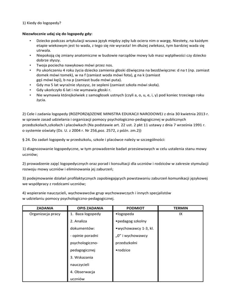 1) Kiedy do logopedy? Niezwłocznie udaj się do logopedy gdy: • • • • • • • Dziecko podczas artykulacji wsuwa język między zęby lub ociera nim o wargę. Niestety, na każdym etapie wiekowym jest to wada, z tego się nie wyrasta! Im dłużej zwlekasz, tym bardziej wada się utrwala. Niepokoją cię zmiany anatomiczne w budowie narządów mowy lub masz wątpliwości czy dziecko dobrze słyszy. Twoja pociecha nawykowo mówi przez nos. Po ukończeniu 4 roku życia dziecko zamienia głoski dźwięczna na bezdźwięczne: d na t (np. zamiast domek mówi tomek), w na f (zamiast woda mówi fota), g na k (zamiast gęś mówi kęś), b na p (zamiast buda mówi puta). Gdy ma 5 lat wyraźnie słyszysz, że sepleni (zamiast szkoła mówi skoła). Gdy ukończyło 6 lat i nie wymawia głoski r. Nie wymawia którejkolwiek z samogłosek ustnych (czyli a, o, u, e, i, y) pod koniec trzeciego roku życia. 2) Cele i zadania logopedy (ROZPORZĄDZENIE MINISTRA EDUKACJI NARODOWEJ z dnia 30 kwietnia 2013 r. w sprawie zasad udzielania i organizacji pomocy psychologiczno-pedagogicznej w publicznych przedszkolach,szkołach i placówkach (Na podstawie art. 22 ust. 2 pkt 11 ustawy z dnia 7 września 1991 r. o systemie oświaty (Dz. U. z 2004 r. Nr 256,poz. 2572, z późn. zm.2)) § 24. Do zadań logopedy w przedszkolu, szkole i placówce należy w szczególności: 1) diagnozowanie logopedyczne, w tym prowadzenie badań przesiewowych w celu ustalenia stanu mowy uczniów; 2) prowadzenie zajęć logopedycznych oraz porad i konsultacji dla uczniów i rodziców w zakresie stymulacji rozwoju mowy uczniów i eliminowania jej zaburzeń; 3) podejmowanie działań profilaktycznych zapobiegających powstawaniu zaburzeń komunikacji językowej we współpracy z rodzicami uczniów; 4) wspieranie nauczycieli, wychowawców grup wychowawczych i innych specjalistów w udzielaniu pomocy psychologiczno-pedagogicznej. ZADANIA Organizacja pracy OPIS ZADANIA 1. Baza logopedy PODMIOT •logopeda 2. Analiza •pedagog szkolny dokumentów: •wychowawcy 1-3, kl. - opinie poradni „0” i wychowawcy psychologiczno- przedszkolni pedagogicznej •rodzice 3. Wskazania nauczycieli 4. Obserwacja uczniów TERMIN IX 5. Badania przesiewowe 3-4-5 Badania przesiewowe latków • Arkusz badania •logopeda IX •pedagog • stomatolog • neurolog • specjalista z P Indywidualny plan • Plan terapii P-P •logopeda terapii Pedagogizacja • Opinia • Spotkanie • logopeda rodziców • Prelekcja • dyrektor szkoły • Wykład • nauczyciele IX X Terapia 1. Ćwiczenia słuchu terapia odbywa się • logopeda fonematycznego zgodnie z ustalonym • rodzice planem zajęć zgodnie • nauczyciele cały rok z rozporządzeniem 2. Ćwiczenia o pomocy artykulatorów, psychologiczno- fonacyjne i pedagogicznej oddechowe w grupach do czterech cały rok uczniów. śśś(szereg ciszący) 3. Ćwiczenia głosek w ssss (szereg syczący) izolacji: sz sz (szereg szumiący) wstępna faza terapii drdrdr, lll, kkk, ggg wstępna faza terapii 4. Utrwalanie głosek w sylabach se,sa so su sy - nagłos ese asa oso usu ysy - śródgłos es as os us ys - wygłos i odpowiedznio pozostałych głosek(szereg zasadnicza faza terapii szumiący zaczynamy w kolejniści od samogłosek a, o u y e) (pozostałe głoski wprowadzamy analogicznie, głoska r w izolacji na końcu) 5. Utrwalanie głosek w wierszyki wyrazach logopedyczne 6. Synteza wyrazów zgadnij, co z ćwiczoną głoską powiedziałam: s-m-o-k (analogicznie wszystkie głoski) 7. Wyodrębnianie Co słyszysz na ćwiczonej głoski w początku wyrazu? nagłosie wyrazu wychodzenie z terapii 8. Wyodrębnianie Co słyszysz na końcu ćwiczonej głoski w wyrazu? wygłosie wyrazu 9. Analiza wyrazu dzielenie wyrazu na (głoskowanie) zabawy sylaby, głoskowanie; sylabą i wyrazem zacznij kolejny wyraz głoską, która kończy poprzedni wyraz; dokończ: sa...mochód 6. Mowa spontaniczna rozwijanie zdań, opowiadanie twórcze, Ewaluacja odtwórcze -Pozwolić dziecku VI samemu poprowadzić zajęcia, by pokazało • logopeda wszystkie ćwiczenia • wychowawca jakie zapamiętało, by • nauczyciel samo wyszukiwało • rodzice wyrazy, na których będziemy ćwiczyć. - Przeprowadzić rozmowę z dzieckiem o jego zainteresowaniach, o planach na wakacje, aby sprawdzić jego wymowę podczas mowy spontanicznej. - Przeprowadzić z dzieckiem badanie przesiewowe i porównać jego wymowę z zapisem z badania przesiewowego z września.