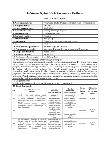 Państwowa Wyższa Szkoła Zawodowa w Raciborzu KARTA PRZEDMIOTU 1. Nazwa przedmiotu: Praktyczna nauka drugiego języka obcego: język angielski 2. Kod przedmiotu: FSC-4b 3. Okres ważności karty: 2015-2018 4. Forma kształcenia: studia pierwszego stopnia 5. Forma studiów: studia stacjonarne 6. Kierunek studiów: filologia 7. Profil studiów: praktyczny 8. Specjalność: filologia słowiańska-specjalizacja czeska 9. Semestr: 1,2,3,4 10. Jedn. prowadz. przedmiot: Studium Języków Obcych 11. Prowadzący przedmiot: mgr Iweta Draszczyk, mgr Małgorzata Skwarecka 12. Grupa przedmiotów: Nauka języka 13. Status przedmiotu: do wyboru 14. Język prowadzenia zajęć: polski/angielski 15. Przedmioty wprowadzające oraz wymagania wstępne: Kompetencje językowe charakterystyczne dla użytkownika na poziomie B1. Osoba posługująca się językiem na tym poziomie rozumie znaczenie głównych wątków przekazu zawartego w jasnych, standardowych wypowiedziach, które dotyczą znanych jej spraw i zdarzeń typowych dla pracy, szkoły, czasu wolnego itd. Potrafi radzić sobie z większością sytuacji komunikacyjnych, które mogą się zdarzyć podczas podróży w rejonie, gdzie mówi się danym językiem. Potrafi tworzyć proste, spójne wypowiedzi na tematy, które są jej znane, lub które ją interesują. Potrafi opisywać doświadczenia, wydarzenia, marzenia, nadzieje i aspiracje, krótko uzasadniając bądź wyjaśniając swoje opinie i plany. 16. Cel przedmiotu: Podniesienie kompetencji językowych z poziomu B1 do poziomu B2. 17. Efekty kształcenia: Ozn. 01 Opis efektu kształcenia Student: potrafi wykorzystać główne wątki przekazu zawartego w złożonych tekstach na tematy konkretne i abstrakcyjne; analizuje i interpretuje wybrane problemy językowe potrafi stosować zasady i reguły gramatyczne języka niemieckiego w akcie komunikacji 02 03 ma umiejętności językowe w zakresie dziedzin nauki i dyscyplin naukowych właściwych dla studiowanego kierunku studiów, zgodnie z wymaganiami określonymi dla poziomu B2 Europejskiego Systemu Opisu Metoda realizacji efektu kształcenia Metoda sprawdzenia efektu kształcenia czytanie ze zrozumieniem, analiza tekstu na podstawie materiału ćwiczeniowego wypowiedź pisemna na zadany temat (wypracowanie, esej, list, notatka etc.) wypowiedź ustna (referat/projekt/prez entacja)na zadany temat przygotowanie do egzaminu na podstawie ćwiczeń praktycznych, zadań domowych, testów sprawdzających ocena analizy i interpretacji tekstu: zadanie domowe, test sprawdzający, egzamin ocena wypowiedzi pisemnej (Karta Oceny) Forma prowadzenia zajęć Odniesienie do efektów dla kierunku studiów ćwiczenia K_U01 (++) ćwiczenia K_U13 (+++) ćwiczenia K_U15 (+++) ocena wypowiedzi ustnej (Karta Oceny) ocena umiejętności językowych: egzamin (Karta Oceny) Kształcenia Językowego 04 05 rozumie potrzebę uczenia się przez całe życie, dokonuje samooceny własnych kompetencji i doskonali umiejętności, wyznacza kierunki własnego rozwoju i kształcenia jest przygotowany do aktywnego uczestnictwa w grupach, organizacjach i instytucjach wykorzystujących język obcy w procesie komunikacji, potrafi porozumieć się z osobami będącymi i niebędącymi specjalistami w danej dziedzinie 18. Formy i wymiar zajęć: 19. Treści kształcenia: dyskusja ocena zaangażowania w dyskusji ćwiczenia K_K01 (++) dyskusja ocena zaangażowania w dyskusji ćwiczenia K_K04 (+++) Ćw. (30h+ 30h+30h+30h) Sem. 1 Tematyka: kłamstwa, reality TV, wizerunek osób publicznych, obraz samego siebie (selfimage), opis osoby, podróże, Australia, planowanie podróży po Polsce, komunikacja miejska; słownictwo i zwroty językowe typowe dla kierunku Filologia. Gramatyka: czasowniki statyczne i dynamiczne, pytanie o podmiot i pytanie o dopełnienie, czasy: Present Simple i Present Continuous, czasy: Present Perfect i Past Simple, czasowniki złożone (rozłączne i nierozłączne). Sem. 2 Tematyka: opis miasta/domu, zakwaterowanie, określanie podobieństw i różnic, zbiegi okoliczności, szczęście a pech, przesądy, wygrana na loterii, rozmowa telefoniczna, sprzedaż telefoniczna, dokonywanie zakupów przez telefon; słownictwo i zwroty językowe typowe dla kierunku Filologia. Gramatyka: czasowniki modalne wyrażające obowiązek, pozwolenie, zakaz (czas teraźniejszy i przeszły), czasowniki: make, let, allow, czasy przeszłe: Past Simple, Past Continuous i Past Perfect Simple. Sem.3 Tematyka: czynności oraz przybory biurowe, stereotypy biurowe, stworzenie i zaprezentowanie reklamy produktu, przeprowadzenie badania rynku, planowanie przyjęcia w biurze, rodzaje wakacji, rozmowy na lotnisku, rozmowa telefoniczna dotycząca informacji o lotach samolotów, planowanie wakacji rodzinnych, dyskutowanie o idealnym dniu wolnym, debata: różnice pomiędzy kobiecym a męskim sposobem myślenia, udzielanie rad, wywiad z mężczyzną zajmującym się domem (a househusband); słownictwo i zwroty językowe typowe dla kierunku Filologia. Gramatyka: przymiotniki (przedrostki negatywne), stopniowanie przymiotników, porównania rzeczownikowe, formy wyrażania przyszłości (plany a przewidywania). Sem.4 Tematyka: przygotowania do sto dziesiątych urodzin, rozmowa o rozterkach dotyczących pracy, najważniejsze wydarzenia w życiu, etapy życia, metafory, gazety, wywiad z dziennikarzem śledczym, prawo a porządek, relacje prasowe, wykroczenia drogowe, artykuł prasowy o włamywaczach, dyskusja: wady i zalety życia bez samochodu, filmowi rabusie, zakupy, opakowania, skargi, reklamacje, zakupoholizm, zakupy przez Internet, rozmowa o telefonach i rachunkach telefonicznych, planowanie centrum sklepowego, kwiz: ‘technofob’ czy ‘cybernauta’(technophobe or cybernaut); słownictwo i zwroty językowe typowe dla kierunku Filologia. Gramatyka: drugi i trzeci tryb warunkowy, przedimki, określniki, czas Present Perfect Continuous. 20. Egzamin: 21. Literatura podstawowa: tak (E-4) / zal.o 1/ Kerr P. , C. Jo