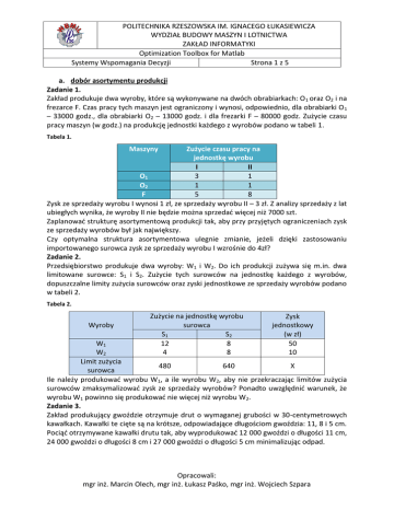 POLITECHNIKA RZESZOWSKA IM. IGNACEGO ŁUKASIEWICZA WYDZIAŁ BUDOWY MASZYN I LOTNICTWA ZAKŁAD INFORMATYKI Optimization Toolbox for Matlab Systemy Wspomagania Decyzji Strona 1 z 5 a. dobór asortymentu produkcji Zadanie 1. Zakład produkuje dwa wyroby, które są wykonywane na dwóch obrabiarkach: O 1 oraz O2 i na frezarce F. Czas pracy tych maszyn jest ograniczony i wynosi, odpowiednio, dla obrabiarki O 1 – 33000 godz., dla obrabiarki O2 – 13000 godz. i dla frezarki F – 80000 godz. Zużycie czasu pracy maszyn (w godz.) na produkcję jednostki każdego z wyrobów podano w tabeli 1. Tabela 1. Maszyny Zużycie czasu pracy na jednostkę wyrobu I II O1 3 1 O2 1 1 F 5 8 Zysk ze sprzedaży wyrobu I wynosi 1 zł, ze sprzedaży wyrobu II – 3 zł. Z analizy sprzedaży z lat ubiegłych wynika, że wyroby II nie będzie można sprzedać więcej niż 7000 szt. Zaplanować strukturę asortymentową produkcji tak, aby przy przyjętych ograniczeniach zysk ze sprzedaży wyrobów był jak największy. Czy optymalna struktura asortymentowa ulegnie zmianie, jeżeli dzięki zastosowaniu importowanego surowca zysk ze sprzedaży wyrobu I wzrośnie do 4zł? Zadanie 2. Przedsiębiorstwo produkuje dwa wyroby: W1 i W2. Do ich produkcji zużywa się m.in. dwa limitowane surowce: S1 i S2. Zużycie tych surowców na jednostkę każdego z wyrobów, dopuszczalne limity zużycia surowców oraz zyski jednostkowe ze sprzedaży wyrobów podano w tabeli 2. Tabela 2. Wyroby Zużycie na jednostkę wyrobu surowca S1 S2 12 8 4 8 Zysk jednostkowy (w zł) 50 10 W1 W2 Limit zużycia 480 640 X surowca Ile należy produkować wyrobu W1, a ile wyrobu W2, aby nie przekraczając limitów zużycia surowców zmaksymalizować zysk ze sprzedaży wyrobów? Ponadto uwzględnić warunek, że wyrobu W1 powinno się produkować nie więcej niż wyrobu W2. Zadanie 3. Zakład produkujący gwoździe otrzymuje drut o wymaganej grubości w 30-centymetrowych kawałkach. Kawałki te cięte są na krótsze, odpowiadające długościom gwoździa: 11, 8 i 5 cm. Pociąć otrzymywane kawałki drutu tak, aby wyprodukować 12 000 gwoździ o długości 11 cm, 24 000 gwoździ o długości 8 cm i 27 000 gwoździ o długości 5 cm minimalizując odpad. Opracowali: mgr inż. Marcin Olech, mgr inż. Łukasz Paśko, mgr inż. Wojciech Szpara POLITECHNIKA RZESZOWSKA IM. IGNACEGO ŁUKASIEWICZA WYDZIAŁ BUDOWY MASZYN I LOTNICTWA ZAKŁAD INFORMATYKI Optimization Toolbox for Matlab Systemy Wspomagania Decyzji Strona 2 z 5 b. zagadnienie transportowe Zadanie 4. Cztery piekarnie zlokalizowane na terenie miasta są zaopatrywane w mąkę z dwóch magazynów znajdujących się peryferiach. Zasoby mąki w magazynach wynoszą: w magazynie A – 130 t, w magazynie B – 200 t, a zapotrzebowanie piekarń wynosi odpowiednio: 80, 120, 70, 60 t. Koszty dostawy mąki do piekarni zależą tylko od odległości, które podano w tabeli 3. Tabela 3. Piekarnie 1 3 3 4 A 25 24 28 13 B 17 30 15 26 Wyznaczyć taki plan przewozów, który zapewni minimalizację kosztów dostaw mąki. Zadanie 5. Trzy cementownie: C1, C2 i C3 położone w różnych miejscowościach zaopatrują w cement cztery składy: S1, S2, S3 i S4 materiałów budowlanych. Zdolności produkcyjne każdej cementowni wynoszą 900t, natomiast zapotrzebowanie składów wynosi odpowiednio 500, 600, 700 i 800 t. Koszty transportu 1t cementu z cementowni do składów (w PLN) podano w tabeli 4. Magazyny Tabela 4. Odbiorcy S1 S2 S3 S4 C1 8 8 6 5 C2 8 4 2 3 C3 4 7 6 4 Wyznaczyć taki plan przewozów, który zapewni minimalizację kosztów dostawy cementu. c. zagadnienie sieciowe Zadanie 6. Pewne przedsięwzięcie, na które składa się 18 czynności o łącznym czasie trwania 200 h, zaplanować tak, aby trwało możliwie najkrócej. Czasy trwania poszczególnych czynności oraz ich następstwo w czasie przedstawiono w tabeli 5. Dostawcy Tabela 5. Czynności i-j 1-2 1-3 1-4 1-5 2-5 2-6 3-4 3-5 3-7 Czas tij 5 10 3 12 10 23 5 3 16 Czynności i-j 3-8 4-8 5-6 5-7 6-10 7-9 7-10 8-9 9-10 Czas tij 9 7 9 12 20 13 18 15 10 Opracowali: mgr inż. Marcin Olech, mgr inż. Łukasz Paśko, mgr inż. Wojciech Szpara POLITECHNIKA RZESZOWSKA IM. IGNACEGO ŁUKASIEWICZA WYDZIAŁ BUDOWY MASZYN I LOTNICTWA ZAKŁAD INFORMATYKI Optimization Toolbox for Matlab Systemy Wspomagania Decyzji Strona 3 z 5 Zbudować siatkę czynności dla przedstawionego przedsięwzięcia. Określić, jaki jest najkrótszy czas wykonania całego przedsięwzięcia przy optymalnym zorganizowaniu pracy i jaka jest kolejność wykonywania działań. Określić ścieżkę krytyczną, czyli maksymalny czas realizacji całego przedsięwzięcia oraz kolejność wykonywania tych czynności. Zadanie 7. Sporządzić wykres sieciowy przedsięwzięcia składającego się z czynności A-N zgodnie z tabelą 6. Tabela 6. należy wykonać należy wykonać przed czynnością czynność: czynność: A FiM I C B E J D, G i B C D K HiJ D E L G, D i B E Ł A, L i K F M E G FiM N I oraz Ł H C Przyjmując, że czasy trwania czynności A-N wynoszą kolejno: 7, 10, 8, 5, 7, 2, 12, 12, 10, 7, 13, 10, 10, 8, 3 dni wyznaczyć najwcześniejszy możliwy termin zakończenia przedsięwzięcia oraz ścieżkę krytyczną. Odpowiedzieć na pytania: a) czy termin końcowy zmieni się jeżeli czynność I (ze względu na chwilowy brak środków) rozpocznie się o 10 dni później, b) czy termin końcowy zmieni się jeżeli czas trwania czynności J można będzie skrócić o 3 dni. d. zagadnienia najkrótszej drogi Zadanie 8. Prywatna firma przewozowa ma zaplanować przebieg linii autobusowej z Krakowa (punkt 1) do Paryża (punkt 9), tak aby zapewnić jej największą frekwencję. Badania rynku wykazały, że frekwencja na danej linii zależy w bezpośredni sposób od atrakcyjności trasy przejazdu. Na rysunku 1. przedstawiono możliwe warianty przebiegu trasy wraz ze spodziewaną liczbą pasażerów na każdym z etapów. przed czynnością Opracowali: mgr inż. Marcin Olech, mgr inż. Łukasz Paśko, mgr inż