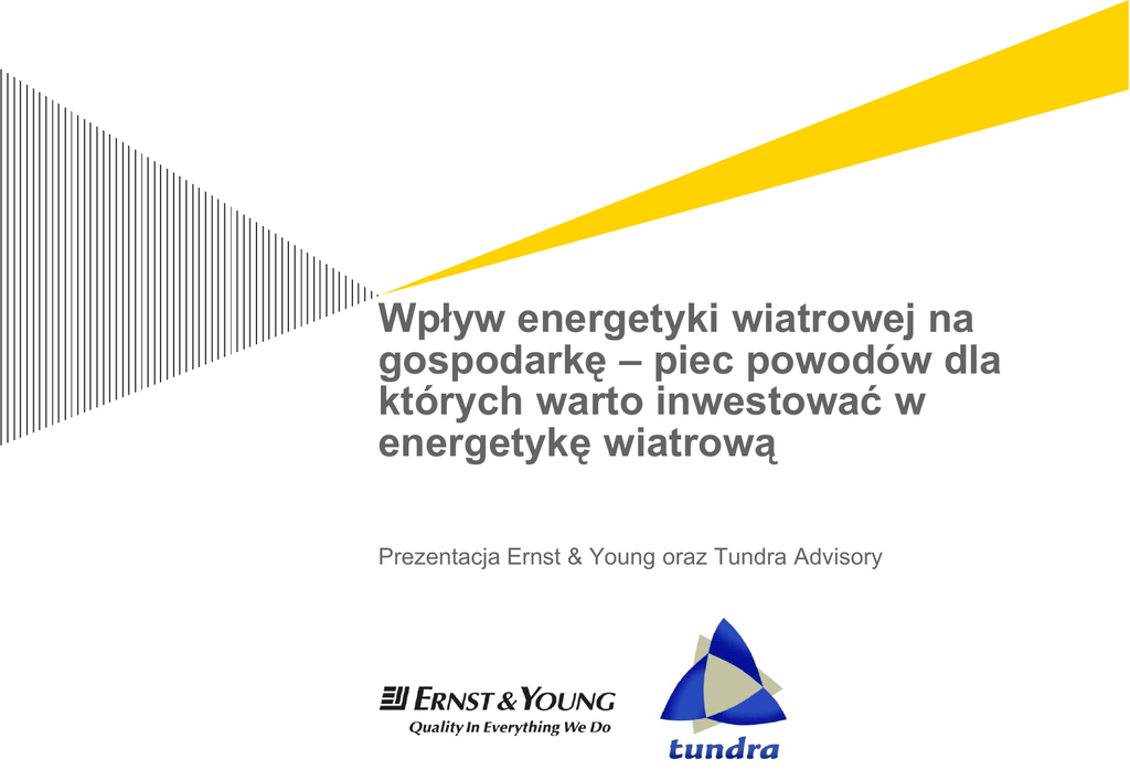 Wpływ energetyki wiatrowej na gospodarkę – piec powodów dla których warto inwestować w energetykę wiatrową Prezentacja Ernst & Young oraz Tundra Advisory Wstęp ► Zapomnijmy na chwile o efekcie ekologicznym, bo jest on udowodniony ponad wszelka wątpliwość – chcemy pokazać ile naprawdę kosztuje wsparcie energetyki wiatrowej i jakie ekonomiczne, wymierne korzyści otrzymujemy w zamian za to wsparcie ► Chcemy udowodnić na konkretnych liczbach, ze wsparcie energetyki wiatrowej nie kosztuje aż tak dużo jak to się powszechnie uważa, a daje znacznie więcej bezpośrednich korzyści niż się powszechnie sądzi ► Pokażemy piec konkretnych argumentów dlaczego warto inwestować w energetykę wiatrową i udzielać jej wsparcia Strona 1 Wstępu ciąg dalszy ► Prezentacja powstała na podstawie analizy przeprowadzonej przez Ernst & Young we współpracy z PSEW oraz EWEA ► Dokument został przygotowany m.in. w oparciu o ankiety przeprowadzone wśród: ► ► Strona 2 przedsiębiorstw sektora energetyki wiatrowej reprezentujących ok. 35% mocy zainstalowanej w Polsce 53 gmin, z czego 35 gmin na których terytorium posadowiono ok. 40% zainstalowanych mocy w Polsce Raport „Wpływ energetyki wiatrowej na wzrost gospodarczy w Polsce” powstał przy wsparciu: PLN/MWh Ile kosztuje wsparcie energetyki wiatrowej 500 400 300 Koszt wsparcia farm wiatrowych dla odbiorców grupy taryfowej G w 2011 roku 476 9 10 6 20 210 21 Koszty związane z systemem wsparcia farm wiatrowych 201 200 100 0 Źródło: opracowanie własne na podstawie danych ARE, TGE, Rozporządzenia OZE Strona 3 Składowe kosztu dla odbiorcy końcowego Koszt wsparcia farm wiatrowych to 6 PLN/MWh czyli 1,2% kosztu odbiorcy końcowego z grupy taryfowej G Koszty wsparcia OZE: wpływ na koszty MWh vs. skala inwestycji Koszty wsparcia OZE (PLN/MWh) 6 farmy wiatrowe 6 3 1 5 21 pozostałe OZE 13 przyrost mocy w 2011 roku [MW] przyrost mocy 20072011 [MW] Farmy wiatrowe 436 1 443 Elektorownie na biomasę 54 359 Elektrownie na biogaz 20 68 Elektrownie wodne 14 23 n/d * n/d * Współspalanie biomasy * Inwestycje w instalacje współspalania biomasy polegają zwykle na przystosowaniu istniejących mocy do współspalania, a nie budowie nowych mocy. Strona 4 PLN/MWh Jednostkowy koszt energii w energetyce wiatrowej jednym z najniższych wśród OZE Szacunkowy jednostkowy koszt energii wytworzonej w nowych źródłach mocy w 2011 roku en. konwencjonalna i atomowa energetyka odnawialna 1 400 1 200 ► 1 091 1 000 800 600 713 466 400 393 463 484 200 0 * uwzględnia wpływ dodatkowych przychodów z kogeneracji i sprzedaży ciepła. Źródło: opracowanie własne Strona 5 ► 487 282 314 304 Wysokość jednostkowego kosztu energii elektrycznej (ok. 466 PLN) w lądowych farmach wiatrowych należy do jednych z najniższych wśród źródeł energii odnawialnej w Polsce. Relatywnie niskie koszty wsparcia dają efekt w realnym przyroście nowych mocy wytwórczych, produkujących energię po kosztach konkurencyjnych w stosunku do innych technologii OZE Energetyka wiatrowa jako czynnik zmniejszający koszty i zwiększający bezpieczeństwo energetyczne ► Uniknięcie kosztu CO2 ► Energetyka wiatrowa poprawia mix paliwowy, wykorzystując krajowe zasoby paliwowe (wiatr), czyli cos jak gaz łupkowy tylko już dziś (tu i teraz) Mix paliwowy EU-27 0,8 Mg CO2/MWh 6,5 EUR/Mg CO2 (średnia emisyjność polskiej elektroenergetyki) (cena uprawnienia EUA) Inne 1% Paliwa ciekłe 2% koszt CO2 ok. 20 PLN/MWh ► Koszt wsparcia (6 PLN/MWh) Koszt utrzymania rezerwy w systemie Paliwa stałe 26% OZE 21% Gaz OZE 3% 7% Paliwa stałe 88% Źródło: Eurostat (2009) Strona 6 Atom 27% Mix paliwowy Polski Paliwa ciekłe 2% vs. ► Gaz 23% Inwestycje w energetykę wiatrową są wyższe niż w wielu innych sektorach polskiej gospodarki 5 297 5 001 5 000 4 733 4 000 3 430 2 878 3 000 2 873 2 621 2 393 1 757 2 000 1 645 1 470 1 327 1 124 1 000 882 552 478 Produkcja wyrobów farmaceutycznych 6 000 Produkcja wyrobów tytoniowych mln PLN Nakłady w sektorze energetyki wiatrowej w 2011 r. w porównaniu do średniej wartości rocznych nakładów inwestycyjnych w wybranych sektorach przemysłu w latach 2009-10* (w mln PLN) Produkcja komputerów Produkcja mebli Produkcja urządzeń elektrycznych Produkcja maszyn i urządzeń Produkcja metali Produkcja papieru i wyrobów z papieru Produkcja chemikaliów i wyrobów chemicznych Produkcja wyrobów z gumy i tworzyw sztucznych Produkcja wyrobów z metali Energetyka wiatrowa Produkcja pojazdów samochodowych Produkcja koksu i ropy naftowej Górnictwo Produkcja artykułów spożywczych 0 Źródło: Opracowanie własne na podstawie wyników ankiety, Ernst & Young, 2012a oraz danych GUS (cykliczne publikacje z serii „Biuletyn Statystyczny”) Strona 7 Blisko 30% wartości inwestycji w energetyce wiatrowej pozostaje w Polsce Nakłady inwestycyjne na 1 MW mocy w energetyce wiatrowej (w tys. PLN/MW) Źródło: Opracowanie własne na podstawie wyników ankiety, Ernst & Young, 2012a Strona 8 Wartość inwestycji w sektorze energetyki wiatrowej do 2020 Nakłady inwestycyjne w mln PLN Prognozowana wartość inwestycji w sektorze energetyki wiatrowej w latach 2011-2020 13 766 14 000 12 000 10 000 10 041 8 000 6 000 4 000 2 000 2 878 713 364 0 414 Nakłady inwestycyjne pozostające w regionie inwestycji Pozostała część nakładów inwestycyjnych pozostająca w kraju Nakłady inwestycyjne trafiające za granicę Źródło: Opracowanie własne na podstawie wyników ankiety, Ernst & Young, 2012a oraz szacunków IEO, 2009 Strona 9 ► 1 743 1 982 ► Przy takich nakładach, kwota inwestycji pozostająca w kraju może wzrosnąć od ok. 779 mln PLN w 2011 r. do ok. 3 725 mln PLN w 2020 r. Przedstawione kwoty nie uwzględniają potencjalnego rozwoju przemysłu związanego z energetyką wiatrową - w takim przypadku większa część nakładów na każdy MW mocy mogłaby pozostać w Polsce. Energetyka wiatrowa stymulatorem rozwoju lokalnych