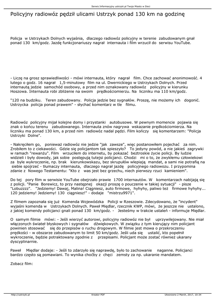 Serwis Informacyjny ustrzyki.pl Twoje Miasto w Sieci Policyjny radiowóz pędził ulicami Ustrzyk ponad 130 km na godzinę Policja w Ustrzykach Dolnych wyjaśnia, dlaczego radiowóz policyjny w terenie zabudowanym gnał ponad 130 km/godz. Jazdę funkcjonariuszy nagrał internauta i film wrzucił do serwisu YouTube. - Liczę na grosz sprawiedliwości - mówi internauta, który nagrał film. Chce zachować anonimowość. 4 lutego o godz. 16 nagrał 1,5-minutowy film na ul. Dwernickiego w Ustrzykach Dolnych. Przed internautą jedzie samochód osobowy, a przed nim oznakowany radiowóz policyjny w kierunku Hoszowa. Internauta robi zbliżenie na swoim prędkościomierzu. Na liczniku ma 110 km/godz. "120 na budziku. Teren zabudowany. Policja jedzie bez sygnałów. Proszę, nie możemy ich Ustrzycka policja ponad prawem" - słychać komentarz w tle filmu. dogonić. Radiowóz policyjny mijał kolejne domy i przystanki autobusowe. W pewnym momencie pojawia się znak o końcu terenu zabudowanego. Internauta znów nagrywa wskazanie prędkościomierza. Na liczniku ma ponad 130 km, a przed nim radiowóz nadal pędzi. Film kończy się komentarzem: "Policja Ustrzyki Dolne". - Nakręciłem go, ponieważ radiowóz nie jedzie "jak zawsze", więc postanowiłem pojechać za nim. Zrobiłem to z ciekawości. Gdzie się policjantom tak spieszyło? To jedyny powód, a nie jakieś zagrywki w ramach "rewanżu". Film wrzuciłem do internetu, by pokazać beztroskie życie policji. By ludzie widzieli i były dowody, jak sobie postępują tutejsi policjanci. Chodzi mi o to, że zwykłemu człowiekowi za byle wykroczenie, np. brak kierunkowskazu, bez skrupułów wlepiają mandat, a sami nie potrafią na siebie spojrzeć - tłumaczy internauta, dlaczego nagrał jazdę policyjnego radiowozu. I przypomina zdanie z Nowego Testamentu: "Kto z was jest bez grzechu, niech pierwszy rzuci kamieniem". Do tej pory film w serwisie YouTube obejrzało prawie 1700 internautów. W komentarzach nabijają się z policji. "Panie Borewicz, to przy następnej okazji proszę o pouczenie w takiej sytuacji" - pisze "Lobuzzzz". "Jedziemy! Dawaj, Malina! Ciągniesz, auto firmowe, hyhyhy, paliwo też firmowe hyhyhy... 120 jedziemy! Jedziemy! 130 ciągniesz!" - dodaje "mistrzu9971". Z filmem zapoznała się już Komenda Wojewódzka Policji w Rzeszowie. Zdecydowano, że "incydent" wyjaśni komenda w Ustrzykach Dolnych. Paweł Międlar, rzecznik KWP, mówi, że jeszcze nie ustalono, z jakiej komendy policjanci gnali ponad 130 km/godz. - Jesteśmy w trakcie ustaleń - informuje Międlar. O samym filmie mówi: - Jeśli wierzyć autorowi, policyjny radiowóz nie był uprzywilejowany. Nie miał włączonych świateł błyskowych i sygnałów dźwiękowych. W związku z tym kierujący nim policjant powinien stosować się do przepisów o ruchu drogowym. W filmie jest mowa o przekroczeniu prędkości - w obszarze zabudowanym to limit 50 km/godz. Jeśli uda się ustalić, kto popełnił wykroczenie, będzie potraktowany zgodnie z przepisami. Policjant może zostać również ukarany dyscyplinarnie. Paweł Międlar dodaje: - Jeśli to zdarzyło się naprawdę, było to zachowanie naganne. Policjanci bardzo często są pomawiani. To wynika choćby z chęci zemsty za np. ukaranie mandatem. Zobacz film: http://ustrzyki.pl Kreator PDF Utworzono 2 March, 2017, 10:34 Serwis Informacyjny ustrzyki.pl Twoje Miasto w Sieci Informacja: http://rzeszow.gazeta.pl/ Skomentuj to na FORUM DYSKUSYJNYM Wydawca portalu ustrzyki.pl nie ponosi odpowiedzialności za treść komentarzy zamieszczanych przez użytkowników. Osoby zamieszczające wypowiedzi naruszające prawo lub prawem chronione dobra osób trzecich mogą ponieść z tego tytułu odpowiedzialność karną lub cywilną. http://ustrzyki.pl Kreator PDF Utworzono 2 March, 2017, 10:34