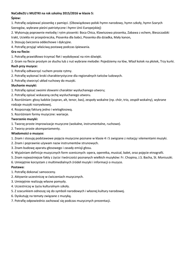 NaCoBeZU z MUZYKI na rok szkolny 2015/2016 w klasie 5: Śpiew: 1. Potrafię zaśpiewad piosenkę z pamięci. (Obowiązkowo polski hymn narodowy, hymn szkoły, hymn Szarych Szeregów, wybrane pieśni patriotyczne i hymn Unii Europejskiej) 2. Wykonuję poprawnie melodię i rytm piosenki: Boca Chica, Klawiszowa piosenka, Zabawa z echem, Bieszczadzki trakt, Uciekła mi przepióreczka, Piosenka dla babci, Piosenka dla dziadka, Mały kanon, 3. Stosuję dwiczenia oddechowe i dykcyjne. 4. Potrafię przyjąd właściwą postawę podczas śpiewania. Gra na flecie: 1. Potrafię prawidłowo trzymad flet i wydobywad na nim dźwięki. 2. Gram na flecie prostym ze słuchu lub z nut wybrane melodie: Pojedziemy na łów, Wlazł kotek na płotek, Trzy kurki. Ruch przy muzyce: 1. Potrafię odtworzyd ruchem proste rytmy. 2. Potrafię wykonad kroki charakterystyczne dla regionalnych taoców ludowych. 3. Potrafię stworzyd układ ruchowy do muzyki. Słuchanie muzyki: 1. Potrafię opisad swoimi słowami charakter wysłuchanego utworu; 2. Potrafię opisad wskazaną cechę wysłuchanego utworu. 3. Rozróżniam: głosy ludzkie (sopran, alt, tenor, bas), zespoły wokalne (np. chór, trio, zespół wokalny), wybrane rodzaje muzyki rozrywkowej. 4. Rozpoznaję fakturę jedno i wielogłosową. 5. Rozróżniam formy muzyczne: wariacje. Tworzenie muzyki: 1. Tworzę proste improwizacje muzyczne (wokalne, instrumentalne, ruchowe). 2. Tworzy proste akompaniamenty. Wiadomości o muzyce: 1. Znam i stosuję podstawowe pojęcia muzyczne poznane w klasie 4 i 5 związane z notacją i elementami muzyki. 2. Znam i poprawnie używam nazw instrumentów strunowych. 3. Znam budowę aparatu głosowego i zasady emisji głosu. 4. Wyjaśniam definicje muzycznych form scenicznych: opera, operetka, musical, balet, oraz pojęcie etnografii. 5. Znam najważniejsze fakty z życia i twórczości poznanych wielkich muzyków: Fr. Chopina, J.S. Bacha, St. Moniuszki. 6. Umiejętnie korzystam z multimedialnych źródeł muzyki i informacji o muzyce. Postawa: 1. Potrafię dokonad samooceny. 2. Aktywnie uczestniczę w dwiczeniach muzycznych. 3. Umiejętnie realizuję własne pomysły. 4. Uczestniczę w życiu kulturalnym szkoły. 5. Z szacunkiem odnoszę się do symboli narodowych i własnej kultury narodowej. 6. Dyskutuję na tematy związane z muzyką. 7. Potrafię odpowiednio zachowad się podczas muzycznych prezentacji.