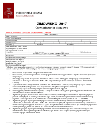 ZIMOWISKO 2017 Oświadczenie obozowe PROSZĘ WYPEŁNIĆ CZYTELNIE DRUKOWANYMI LITERAMI DANE OSOBOWE* Imię i nazwisko Adres zameldowania Numer telefonu Numer PESEL Uczelnia Wydział Kierunek Imię, nazwisko, adres i numer telefonu osoby, z którą należy się kontaktować w razie wypadku Imię i nazwisko Adres Telefon kontaktowy INFORMACJE DOTYCZĄCE STANU ZDROWIA Grupa krwi Grupa …. /Rh ….. Rozpoznane choroby/alergie Dolegliwości lub objawy, które występują: drgawki, omdlenia, inne (jakie?) Przyjmowane leki (na stałe) *) Podane przez uczestnika dane osobowe podlegają ochronie przewidzianej w ustawie z dnia 29 sierpnia 1997 roku o ochronie danych osobowych (Dz. U. 1997 nr 133 poz. 883 wraz z późniejszymi poprawkami) 1. Oświadczam że posiadam ubezpieczenie zdrowotne. 2. Oświadczam, że informacje zawarte w niniejszym oświadczeniu są prawdziwe i zgodne ze stanem prawnym i faktycznym. 3. Deklaruję swój udział w wyjeździe Zimowisko 2017 — obóz rekracyjno- integracyjny w Liptovskim Mikulasu, na Słowacji w dniach 05-11.02.201r. organizowanym przez Samorząd Studencki Politechniki Łódzkiej. 4. Zapoznałem/am się z regulaminem Zimowisk 2017 Politechniki Łódzkiej, który znajduje się na stronie www.obozy.lodz.pl/Regulamin oraz który zostanie odczytany na odprawie obozowej. 5. Zobowiązuję się do przestrzegania postanowień organizatorów wyjazdu. 6. Ponoszę pełną odpowiedzialność cywilną i karną za wszelkie szkody jakie spowoduję swoim działaniem lub zaniechaniem w trakcie działania Obozu. 7. Wyrażam zgodę na przetwarzanie moich danych osobowych zawartych w Formularzu Rejestracyjnym dla potrzeb niezbędnych w realizacji obozu oraz jego celów przez Samorząd Studencki Politechniki Łódzkiej (zgodnie z Ustawą z dnia 29.08.1997 roku o Ochronie Danych Osobowych DZ.U. nr 133 poz.883) 8. Wyrażam zgodę na wykorzystanie mojego wizerunku uwidocznionego na filmach oraz fotografiach z Zimowiska, w dniach 05.02.2017 – 11.02.2017 do celów związanych z przedstawieniem relacji z Zimowiska oraz w celach promocyjnych Zimowiska. Zgoda na wykorzystanie wizerunku może być cofnięta (wyłącznie w formie pisemnej), jednak nie później niż 7 dni od daty zakończenia Zimowiska. 9. Wyrażam zgodę na wykorzystanie mojego numeru telefonu komórkowego oraz adresu mailowego w celu informowania mnie o przebiegu obozu w trakcie jego trwania oraz akcjach promocyjnych Samorządu Studenckiego po zakończeniu obozu. .............................................................. miejscowość, data ................................................................... podpis