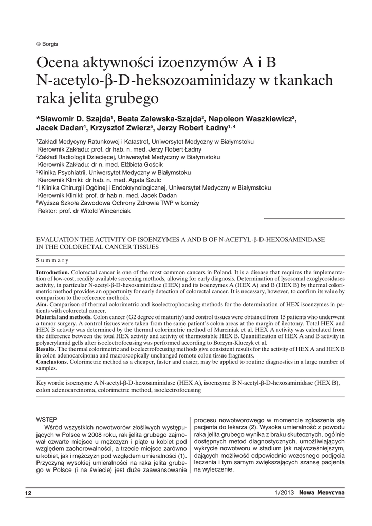 © Borgis Ocena aktywności izoenzymów A i B N-acetylo-β-D-heksozoaminidazy w tkankach raka jelita grubego *Sławomir D. Szajda1, Beata Zalewska-Szajda2, Napoleon Waszkiewicz3, Jacek Dadan4, Krzysztof Zwierz5, Jerzy Robert Ładny1, 4 Zakład Medycyny Ratunkowej i Katastrof, Uniwersytet Medyczny w Białymstoku Kierownik Zakładu: prof. dr hab. n. med. Jerzy Robert Ładny 2 Zakład Radiologii Dziecięcej, Uniwersytet Medyczny w Białymstoku Kierownik Zakładu: dr n. med. Elżbieta Gościk 3 Klinika Psychiatrii, Uniwersytet Medyczny w Białymstoku Kierownik Kliniki: dr hab. n. med. Agata Szulc 4 I Klinika Chirurgii Ogólnej i Endokrynologicznej, Uniwersytet Medyczny w Białymstoku Kierownik Kliniki: prof. dr hab n. med. Jacek Dadan 5 Wyższa Szkoła Zawodowa Ochrony Zdrowia TWP w Łomży Rektor: prof. dr Witold Wincenciak 1 EVALUATION THE ACTIVITY OF ISOENZYMES A AND B OF N-ACETYL-b-D-HEXOSAMINIDASE IN THE COLORECTAL CANCER TISSUES Summary Introduction. Colorectal cancer is one of the most common cancers in Poland. It is a disease that requires the implementation of low-cost, readily available screening methods, allowing for early diagnosis. Determination of lysosomal exoglycosidases activity, in particular N-acetyl-β-D-hexosaminidase (HEX) and its isoenzymes A (HEX A) and B (HEX B) by thermal colorimetric method provides an opportunity for early detection of colorectal cancer. It is necessary, however, to confirm its value by comparison to the reference methods. Aim. Comparison of thermal colorimetric and isoelectrophocusing methods for the determination of HEX isoenzymes in patients with colorectal cancer. Material and methods. Colon cancer (G2 degree of maturity) and control tissues were obtained from 15 patients who underwent a tumor surgery. A control tissues were taken from the same patient’s colon areas at the margin of ileotomy. Total HEX and HEX B activity was determined by the thermal colorimetric method of Marciniak et al. HEX A activity was calculated from the difference between the total HEX activity and activity of thermostable HEX B. Quantification of HEX A and B activity in polyacrylamid gells after isoelectrofocusing was performed according to Borzym-Kluczyk et al. Results. The thermal colorimetric and isoelectrofocusing methods give consistent results for the activity of HEX A and HEX B in colon adenocarcinoma and macroscopically unchanged remote colon tissue fragments. Conclusions. Colorimetric method as a cheaper, faster and easier, may be applied to routine diagnostics in a large number of samples. Key words: isoenzyme A N-acetyl-β-D-hexosaminidase (HEX A), isoenzyme B N-acetyl-β-D-hexosaminidase (HEX B), colon adenocarcinoma, colorimetric method, isoelectrofocusing WSTĘP Wśród wszystkich nowotworów złośliwych występujących w Polsce w 2008 roku, rak jelita grubego zajmował czwarte miejsce u mężczyzn i piąte u kobiet pod względem zachorowalności, a trzecie miejsce zarówno u kobiet, jak i mężczyzn pod względem umieralności (1). Przyczyną wysokiej umieralności na raka jelita grubego w Polsce (i na świecie) jest duże zaawansowanie 12 procesu nowotworowego w momencie zgłoszenia się pacjenta do lekarza (2). Wysoka umieralność z powodu raka jelita grubego wynika z braku skutecznych, ogólnie dostępnych metod diagnostycznych, umożliwiających wykrycie nowotworu w stadium jak najwcześniejszym, dających możliwość odpowiednio wczesnego podjęcia leczenia i tym samym zwiększających szansę pacjenta na wyleczenie. 1/2013 Nowa Medycyna Ocena aktywności izoenzymów A i B N-acetylo-β-D-heksozoaminidazy w tkankach raka jelita grubego Nasze badania stwarzają szansę na zaproponowanie jako markera raka jelita grubego N-acetylo-β-D-heksozoaminidazy (HEX) oraz jej izoenzymów A (HEX A) i B (HEX B), których wzrost aktywności w płynach ustrojowych mógłby świadczyć o pojawieniu się i rozwoju choroby nowotworowej (2-5). HEX to najaktywniejsza egzoglikozydaza o największej wartości diagnostycznej wśród egzoglikozydaz lizosomalnych przebadanych przez nas w raku jelita grubego (2-5). Wyniki badania aktywności HEX, HEX A i HEX B w surowicy krwi i moczu chorych na raka jelita grubego sugerują możliwość wykorzystania oznaczenia aktywności HEX, HEX A i HEX B w rozpoznaniu raka jelita grubego we wczesnej fazie jego rozwoju (4). Stosowana przez nas metoda oznaczania izoenzymów HEX w płynach biologicznych oparta na denaturacji cieplnej HEX A stwarza niebezpieczeństwo częściowej denaturacji również HEX B, co może wpływać na wyniki oznaczania obu izoenzymów HEX. Dlatego w tym samym materiale tkankowym, równolegle do oznaczenia kolorymetrycznego, oznaczyliśmy aktywności HEX A i B referencyjną metodą elektroogniskowania. W metodzie referencyjnej zastosowaliśmy materiał tkankowy, ponieważ nie było możliwe przeprowadzenie izoelektroogniskowania izoenzymów HEX w płynach biologicznych. MATERIAŁ I METODY Materiał badany stanowiły fragmenty okrężnicy (0,3-0,5 g) pobrane z gruczolakoraka jelita grubego o stopniu dojrzałości komórkowej G2 od 15 chorych w wieku od 39 do 82 lat (średnia 68,39 ± 11,34 lat). Fragmenty tkanki niezmienione nowotworowo pobrano od tych samych pacjentów ze skraju nacięć jelita oddalonych o ok. 5 cm od zmiany nowotworowej podczas tych samych zabiegów operacyjnych wykonanych w I Klinice Chirurgii Ogólnej i Endokrynologicznej Uniwersytetu Medycznego w Białymstoku. Na przeprowadzenie badań uzyskano zgodę Lokalnej Komisji Bioetycznej (RI-003/300/2006). Fragmenty tkanek opłukiwano wodą z kranu, a następnie, zawieszano w oziębionym 0,15 M KCl zawierającym 0,2% trytonu X-100, w stosunku wagowo--objętościowym 1:9 i homogenizowano przy pomocy homogenizatora nożowego ULTRA-TURRAX T8 IKA-Werke w naczyniach obłożonych lodem. Homogenaty wirowano przy 10 000 x g w ciągu 30 min w temperaturze +4°C. Płyn nadosadowy przechowywano w temperaturze -80°C. HEX A i HEX B oznaczano metodą termiczn