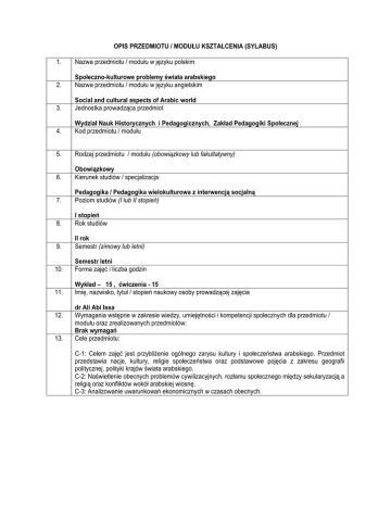 OPIS PRZEDMIOTU / MODUŁU KSZTAŁCENIA (SYLABUS) 1. Nazwa przedmiotu / modułu w języku polskim 2. Społeczno-kulturowe problemy świata arabskiego Nazwa przedmiotu / modułu w języku angielskim 3. Social and cultural aspects of Arabic world Jednostka prowadząca przedmiot 4. Wydział Nauk Historycznych i Pedagogicznych, Zakład Pedagogiki Społecznej Kod przedmiotu / modułu 5. Rodzaj przedmiotu / modułu (obowiązkowy lub fakultatywny) 6. Obowiązkowy Kierunek studiów / specjalizacja 7. Pedagogika / Pedagogika wielokulturowa z interwencją socjalną Poziom studiów (I lub II stopień) 8. I stopień Rok studiów 9. II rok Semestr (zimowy lub letni) 10. Semestr letni Forma zajęć i liczba godzin 11. Wykład – 15 , ćwiczenia - 15 Imię, nazwisko, tytuł / stopień naukowy osoby prowadzącej zajęcia 12. 13. dr Ali Abi Issa Wymagania wstępne w zakresie wiedzy, umiejętności i kompetencji społecznych dla przedmiotu / modułu oraz zrealizowanych przedmiotów: Brak wymagań Cele przedmiotu: C-1: Celem zajęć jest przybliżenie ogólnego zarysu kultury i społeczeństwa arabskiego. Przedmiot przedstawia nacje, kultury, religie społeczeństwa oraz podstawowe pojęcia z zakresu geografii politycznej, polityki krajów świata arabskiego. C-2: Naświetlenie obecnych problemów cywilizacyjnych, rozłamu społecznego między sekularyzacją a religią oraz konfliktów wokół arabskiej wiosnę. C-3: Analizowanie uwarunkowań ekonomicznych w czasach obecnych. 14. Zakładane efekty kształcenia: EK_01 ma uporządkowaną wiedzę na temat wychowania i kształcenia, jego filozoficznych, społeczno-kulturowych i historycznych podstaw EK_02 ma podstawową wiedzę o rodzajach więzi społecznych i o rządzących nimi prawidłowościach, potrafi wyjaśnić mechanizmy socjalizacyjne i edukacyjne zachodzące w przestrzeni kultury EK_03 ma świadomość poziomu swojej wiedzy i umiejętności, rozumie potrzebę ciągłego dokształcania się zawodowego i rozwoju osobistego, dokonuje samooceny własnych kompetencji i doskonali umiejętności, wyznacza kierunki własnego rozwoju i kształcenia potrafi dokonać obserwacji i interpretacji zjawisk społecznych; EK_04 analizuje ich powiązania z wybranym obszarem działalności edukacyjnej 15. K_W03 K_W06 K_K01 K_U01 Treści programowe: Wstęp do kultury i społeczeństwa świata arabskiego Bliski Wschód – historia, geografia, religie i Kultura.Ekspansja islamu na terenach arabskich. Dżihad i krucjaty. Świat arabski w okresie kolonialnym. Świat arabski w okresie postkolonialnym – Sytuacja współczesna i perspektywy na najbliższą przyszłość. Problem Izraelski (Egipt, Jordania, Syria, Liban i Palestyna). Kwestia palestyńska, jako nadrzędny problem nacjonalizmu arabskiego. Okupacja Jerozolimy, jako nadrzędny doktrynalny problem islamu. Relacje między państwem Izrael a autorytarnymi rządami państw arabskich. Autorytaryzm - na przykładzie Egiptu Bogactwa naturalne Egiptu. Egipt po okresie kolonialnym i po 30 latach rządów autorytarnych. Nurty islamistyczne stanowiące zaplecze rządów totalitarnych (Sufizm – Salafizm). Mniejszość religijna jako zaplecze rządów totalitarnych ? Demokracja - między ujęciem zachodnim a muzułmańskim: "Oporność autorytaryzmu" i Perspektywy demokratyzacji. Islam a demokracja. Wolne media ”al-Jazeera” Kultura społeczeństw muzułmańskich. Wartości muzułmańskie. Wartości Zachodnie. Islam polityczny – od upadku kalifatu osmańskiego do współczesnego cywilizacyjnego odrodzenia muzułmańskiego w świecie arabskim – ruchy reformatorskie. Bracia Muzułmanie. Ekstremizm – Terroryzm. Rola rządów wobec terroryzmu – oblicza „teorii spiskowych” Zachód a Islam polityczny (Algieria – Gaza – Egipt). Religia a sekularyzm w świecie arabskim. Waga nurtu laickiego. Środowisko laickie jako zaplecze rządów totalitarnych. Islamiści jako środowisko zacofanych – „laicyści” jako środowisko wykształconych. Rozum a objawienie. Problem mniejszości religijnych. Szyici. Chrześcijanie. Druzowie. Alawici. Problemy ekonomiczny - Islam a sprawiedliwość społeczna – podział bogactw. Ekonomiczna doktryna islamu a problemy współczesnego świata arabskiego. Czy bogactwa naturalne są zbawieniem czy też przekleństwem Bliskiego Wschodu. Bogaty Półwysep Arabski i biedna reszta świata arabskiego 16. Zalecana literatura (podręczniki) Literatura podstawowa 17. 1. Danecki J., Podstawowe wiadomości o islamie, Warszawa 1997. 2. Hitti P., Dzieje Arabów , Warszawa 1969. 3. Nowotarski B., Jak budować demokracje. Studia nad konsolidacją nowych demokracji w XX i XXI wieku, Warszawa 2012 4. Said E., Orientalizm, Warszawa 1991. 5. Zdanowski J., Współczesna muzułmańska myśl społeczno-polityczna. Nurt Braci Muzułmanów, Warszawa 2009 6. Bracia Muzułmanie. Neo-orientalizm a mit islamskiego radykalizmu, Praca zbiorowa - red. Mariusz Turowski, „As-Salam. Wydanie specjalne”, 2011. 7. Ekonomia Muzułmańska, praca zbiorowa, Wrocław, ISNI, w redakcji (przewidywana data wydania: kwiecień 2014). Literatura uzupełniająca 1. Abi Issa A., Ekstremizm według źródłowych tekstów Sunny, „As-Salam”, nr 3, 2011. 2. Abi Issa A., „O szerzeniu wiary mieczem”, w: Nowoczesność–Europa–islam, Wrocław, ISNI 2012 3. Lewis B., Arabowie w historii, Szczecin 1995. 4. McFaul M., “Democracy Promotion as a World Value,” Washington Quarterly, Winter 2004/2005. Forma zaliczenia poszczególnych komponentów przedmiotu / modułu, sposób sprawdzenia osiągnięcia zamierzonych efektów kształcenia: ćwiczenia: zaliczenie na ocenę na podstawie aktywności na zajęciach K_W03, K_W06, K_K01 wykład: zaliczenie na podstawie obecności na wykładzie K_W03, K_W06 wykład + ćwiczenia: Kolokwium. K_W03, K_K01, K_U01 Kryteria oceny: - ocena bardzo dobra: Student ma uporządkowaną wiedzę o procesach socjalizacyjnych i wychowawczych i edukacyjnych w przestrzeni kultury arabskiej. Rozumie specy