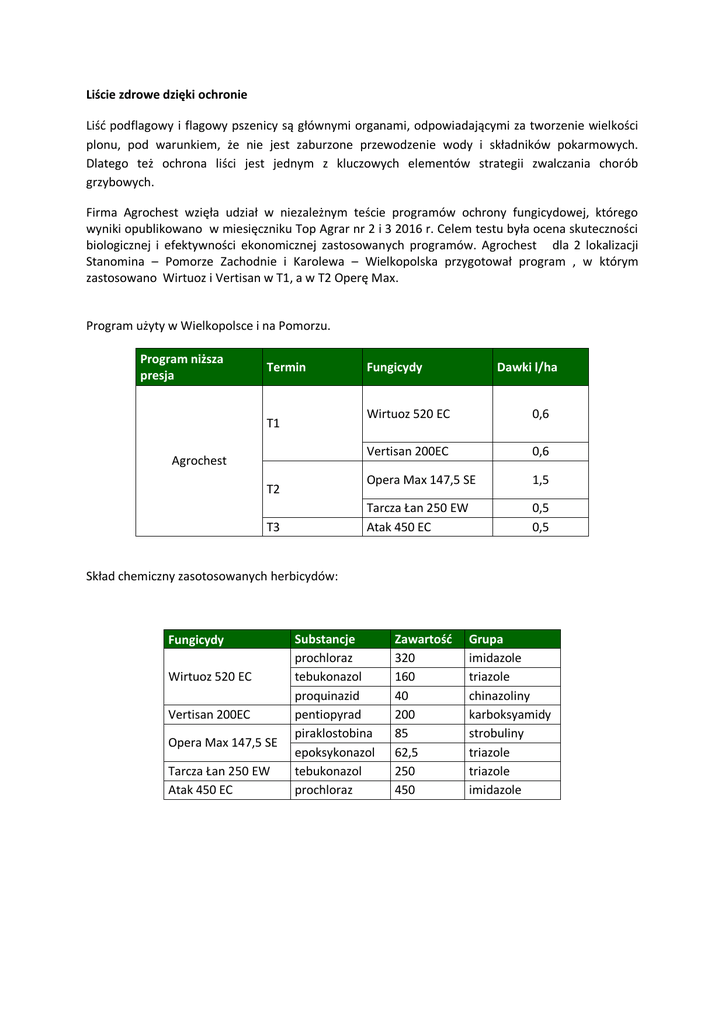 Liście zdrowe dzięki ochronie Liść podflagowy i flagowy pszenicy są głównymi organami, odpowiadającymi za tworzenie wielkości plonu, pod warunkiem, że nie jest zaburzone przewodzenie wody i składników pokarmowych. Dlatego też ochrona liści jest jednym z kluczowych elementów strategii zwalczania chorób grzybowych. Firma Agrochest wzięła udział w niezależnym teście programów ochrony fungicydowej, którego wyniki opublikowano w miesięczniku Top Agrar nr 2 i 3 2016 r. Celem testu była ocena skuteczności biologicznej i efektywności ekonomicznej zastosowanych programów. Agrochest dla 2 lokalizacji Stanomina – Pomorze Zachodnie i Karolewa – Wielkopolska przygotował program , w którym zastosowano Wirtuoz i Vertisan w T1, a w T2 Operę Max. Program użyty w Wielkopolsce i na Pomorzu. Program niższa presja Termin T1 Agrochest T2 T3 Fungicydy Dawki l/ha Wirtuoz 520 EC 0,6 Vertisan 200EC 0,6 Opera Max 147,5 SE 1,5 Tarcza Łan 250 EW Atak 450 EC 0,5 0,5 Skład chemiczny zasotosowanych herbicydów: Fungicydy Wirtuoz 520 EC Vertisan 200EC Opera Max 147,5 SE Tarcza Łan 250 EW Atak 450 EC Substancje prochloraz tebukonazol proquinazid pentiopyrad piraklostobina epoksykonazol tebukonazol prochloraz Zawartość 320 160 40 200 85 62,5 250 450 Grupa imidazole triazole chinazoliny karboksyamidy strobuliny triazole triazole imidazole Fungicydy użyte w przeprowadzonych próbach do ochrony liścia flagowego (T2) Wyniki sktuteczności programów przedstawiają się nastepująco. Plonowanie pszenicy w Wielkopolsce (Karolew) Wyniki masy tysiąca ziaren. Autorski program Agrochestu oparty zarówno o starsze związki chemiczne – triazole i imidazol jak i najnowsze z grupy karboksyamidów i strobiluryn skutkował zwiększeniem plonowania w obu lokalizacjach oraz znaczną poprawą parametrów jakościowych. Dziękujemy Redakcji TopAgrar oraz pani dr Zuzannie Sawińskiej z Uniwersytetu Przyrodniczego w Poznaniu za możliwość udziału w teście, który pozwolił ocenić nasz program na tle innych rozwiązań polecanych rolnikom. Źródło: Top Agrar nr 2/3 , 2016 r.