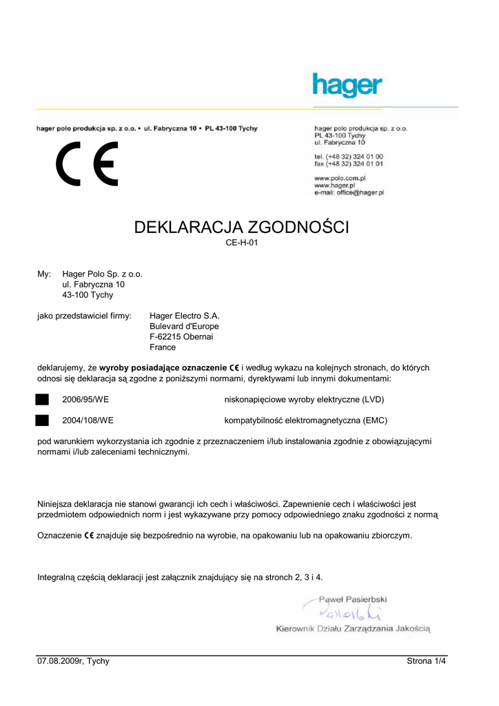 Deklaracja zgodności CE Hager CE-H-01