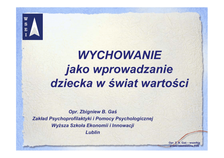 WYCHOWANIE jako wprowadzanie dziecka w świat wartości Opr. Zbigniew B. Gaś Zakład Psychoprofilaktyki i Pomocy Psychologicznej Wyższa Szkoła Ekonomii i Innowacji Lublin Opr. Z. B. Gaś – wszelkie prawa zastrzeżone 1/26 Podstawowe zagadnienia: Na czym polega istota wychowania i co mu zagraża? Relacja między zadaniami rozwojowymi a potrzebami Korygująca rola wartości w zaspokajaniu potrzeb Wartości chrześcijańskie jako podstawa wychowania Normy jako drogi realizacji wartości Warunki skutecznego wprowadzania w świat wartości i norm Opr. Z. B. Gaś – wszelkie prawa zastrzeżone 2/26 Kontrowersje wokół istoty wychowania „Trzeba jasno zdać sobie sprawę z tego, co to jest WYCHOWANIE i jak należy je przeprowadzać, bo obecnie panuje pod tym względem rozbieżność poglądów” Arystoteles Opr. Z. B. Gaś – wszelkie prawa zastrzeżone 3/26 Wychowanie jako formowanie bogatego człowieczeństwa To proces wspomagania wychowanka w rozwoju, ukierunkowanym na osiąganie pełnej dojrzałości. Tak rozumiany kontakt wychowawczy: angażuje dwie osoby: wychowawcę (przede wszystkim rodzica, ale także nauczyciela, duszpasterza, sąsiada, starszego kolegę) oraz wychowanka (w różnym wieku), pozostające w osobowej relacji, współdziałające w osiąganiu celów wychowawczych. Opr. Z. B. Gaś – wszelkie prawa zastrzeżone 4/26 Obszary dojrzewania •ODPOWIEDZIALNOŚĆ • ZDROWIE I SPRAWNOŚĆ •SKUTECZNOŚĆ W ROLACH SPOŁECZNYCH Dojrzałość fizyczna Dojrzałość psychiczna Dojrzałość społeczna Dojrzałość duchowa •SYSTEM WARTOŚCI I POCZUCIE SENSU ISTNIENIA Opr. Z. B. Gaś – wszelkie prawa zastrzeżone 5/26 Zadania rozwojowe (B. Varenhorst) doświadczanie fizycznej dojrzałości seksualnej reorganizacja systemu wartości rozwijanie indywidualności i toŜsamości wyrastanie z egocentryzmu kształtowanie zobowiązań społecznych uzyskanie autonomii Opr. Z. B. Gaś – wszelkie prawa zastrzeżone 6/26 Hierarchia potrzeb Transcendencja: pomoc innym w samorealizacji Samorealizacja: osobisty rozwój Potrzeby estetyczne: piękno, forma, równowaga itp. Potrzeby poznawcze: wiedza, znaczenie, samoświadomość Potrzeby szacunku (uznania): osiągnięcia, odpowiedzialność, reputacja Potrzeby przynaleŜności i miłości: rodzina, uczucia, związki z rówieśnikami Potrzeby bezpieczeństwa: opieka, porządek, prawo, granice, stabilność itp. Potrzeby biologiczne: powietrze, jedzenie, picie, schronienie, sen, seks itp. Opr. Z. B. Gaś – wszelkie prawa zastrzeżone 7/26 Wartości • • • • Wartości to wszystko to: co uchodzi za waŜne i cenne dla jednostki i społeczeństwa jest godne poŜądania, łączy się z pozytywnymi przeŜyciami stanowi jednocześnie cel dąŜeń ludzkich. Wartości obejmują więc zarówno elementy świata materialnego, jak i duchowego. Opr. Z. B. Gaś – wszelkie prawa zastrzeżone 8/26 Normy To powinności, nakazy i zakazy wskazujące sposoby i metody realizowania nadrzędnych wartości. Są one podstawowym spoiwem każdej wspólnoty ludzkiej, porządkują życie społeczne, zapewniają ludziom poczucie bezpieczeństwa. Ze względu na realizowane wartości normy można podzielić na: teologiczne – gdzie nadrzędną wartością jest DOBRO, czyli wszelkie działania człowieka określa obowiązek czynienia dobra formalne – gdzie nadrzędną wartością jest OBOWIĄZEK, czyli właściwe działanie to bezwzględne realizowanie nakazów obowiązku Opr. Z. B. Gaś – wszelkie prawa zastrzeżone 9/26 Wartości chrześcijańskie jako podstawa wychowania godność osoby świętość życia ludzkiego centralna rola rodziny opartej na małżeństwie znaczenie wykształcenia wolność myśli, słowa wolność głoszenia własnych poglądów wolność wyznawania religii ochrona prawna jednostek i grup współpraca wszystkich na rzecz wspólnego dobra praca pojmowana jako dobro osobiste i społeczne władza polityczna pojmowana jako służba, podporządkowana prawu i rozumowi, a ograniczona przez prawa osoby i narodów (Jan Paweł II: Wartości chrześcijańskie duchowym fundamentem Europy) Opr. Z. B. Gaś – wszelkie prawa zastrzeżone 10/26 4 kroki wprowadzania wychowanka w świat wartości 1. 2. 3. 4. Rozpoznawanie wartości Rozumienie wartości Akceptowanie wartości Respektowanie wartości Opr. Z. B. Gaś – wszelkie prawa zastrzeżone 11/26 Krok 1 – rozpoznawanie wartości istotą tego kroku jest nabywanie umiejętności rozpoznawania tego, co jest wartością i odróżniania od tego, co nie jest wartością. dokonuje się głównie przez obserwację zachowań osób znaczących, a więc przede wszystkim: rodziców, nauczycieli, rówieśników, autorytetów społecznych itp. Opr. Z. B. Gaś – wszelkie prawa zastrzeżone 12/26 Krok 2 – rozumienie wartości istotą tego kroku jest rozumowa analiza istoty danej wartości, z możliwością dokonania bilansu zysków i strat dokonuje się głównie w drodze intelektualnej analizy własnych doświadczeń i obserwacji świata zewnętrznego Opr. Z. B. Gaś – wszelkie prawa zastrzeżone 13/26 Krok 3 – akceptowanie wartości istotą tego kroku jest przyjęcie, że wartości praktykowane przez innych są szansą na godne życie i uzyskanie poczucia przynależności do grupy dokonuje się głównie w drodze doświadczania wzmocnień zewnętrznych za przyjmowanie wartości obowiązujących w danej grupie społecznej Opr. Z. B. Gaś – wszelkie prawa zastrzeżone 14/26 Krok 4 – respektowanie wartości istotą tego kroku jest przyjęcie wartości jako podstawy norm przestrzeganych we własnym zachowaniu dokonuje się głównie w drodze doświadczania wewnętrznych wzmocnień za prowadzenie osobiście satysfakcjonującego i społecznie akceptowanego stylu życia Opr. Z. B. Gaś – wszelkie prawa zastrzeżone 15/26 Wybrane zagrożenia dla budowania systemu wartości redefinicja wartości np. WOLNOŚĆ -> samowola MIŁOŚĆ -> seks DOBRO/ZŁO -> mniejsze zło OTWARTOŚĆ -> bezkrytycyz