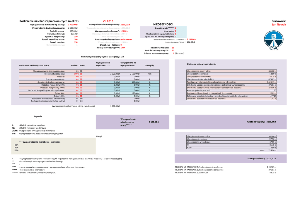 Rozliczenie należności pracowniczych za okres: Pracownik: Jan Nowak VII 2015 Wynagrodzenie minimalne wg ustawy: 1 750,00 zł Wynagrodzenie brutto wg umowy: 2 500,00 zł Wynagrodzenie brutto skorygowane: Dodatki, premie Stawka godzinowa: Ryczałt za nadgodziny: Ryczałt za godziny nocne: Ryczałt za dyżur: Okres rozliczeniowy: 2 500,00 zł 500,00 zł 15,63 zł 350 100 150 1 Wynagrodzenie minimalne skorygowane: 1 750,00 zł Wynagrodzenie urlopowe*: Stawka godzinowa minimalna: Ilość dni roboczych: Koszty uzyskania przychodu Wynagrodzenie dzienne: Chorobowe - ilość dni: Rodzaj chorobowego***: Ilość dni roboczych pracujących: Proporcja obecność/nieobecność: NIEOBECNOŚCI: Brak aktywności****** 0 120,00 zł 10,94 zł 20 podstawowe 125,00 zł 0 100% 20 Urlop płatny: 0 Nieobecność nieusprawiedliwiona: 0 Łączna ilość dni roboczych bez pracy: 0 Średni przychód pracownika ( z 12 miesięcy) ** Stawka chorobowa / dzień: ** Ilość dni w miesiącu: Ilość dni roboczych wg KP: Dzienna norma czasu pracy: 3 200,00 zł 106,67 zł 31 20 8 (dla etatu) Nominalny miesięczny wymiar czasu pracy: 160 Rozliczenie ewidencji czasu pracy Godzin Skorygowany miesięczny czas pracy: Rzeczywisty czas pracy: Przestój: Praca w porze nocnej: Godziny niedzielno-świąteczne: Dodatek: Nadgodziny 50%: Dodatek: Nadgodziny 100%: Dodatek: Nadgodziny średniotygodniowe: Dyżur 50%: Dyżur 100%: Rozliczenie nieobecności (chorobowe) Rozliczenie nieobecności (urlop płatny) 0 160 0 0 0 0 0 0 0 0 0 0 Minut : : : : : : : : : : Wynagrodzenie cząstkowe****: 00 00 00 00 00 00 00 00 00 00 dni dni Uwzględniane do wynagrodzenia: 2 500,00 zł 0,00 zł 0,00 zł 0,00 zł 0,00 zł 0,00 zł 0,00 zł 0,00 zł 0,00 zł Wynagrodzenie całość (praca + inne świadczenia): 2 500,00 zł 0,00 zł 0,00 zł 350,00 zł 0,00 zł 0,00 zł 0,00 zł 150,00 zł 0,00 zł 0,00 zł 0,00 zł Szczegóły: WR R R R R R R R Obliczenie netto wynagrodzenia: Ubezpieczenie emerytalne: Ubezpieczenie rentowe: Ubezpieczenie chorobowe: Ubezpieczenie obciążenia ZUS: Podstawa wymiaru składki na ubezpieczenie zdrowotne: Składka na ubezpieczenie zdrowotne do pobrania z wynagrodzenia: Składka na ubezpieczenie zdrowotne do odliczenia od podatku: Koszty uzyskania przychodu: Podstawa obliczenia zaliczki na podatek dochodowy: Zaliczka na podatek dochodowy przed odliczeniem składki zdrowotnej: Zaliczka na podatek dochodowy do pobrania: 341,60 zł 52,50 zł 85,75 zł 479,85 zł 3 020,15 zł 271,81 zł 234,06 zł 111,25 2 909 zł 477,29 243 zł 3 500,00 zł Legenda: R: RG: UWM: WR: Wynagrodzenie miesięczne za pracę*****: składnik zastąpiony ryczałtem składnik rozliczony godzinowo uwzględniono wynagrodzenie minimalne wynagrodzenie na podstawie rzeczywistych godzin Uwagi: *** Wynagrodzenie chorobowe - wartości: 80% 90% 100% * ** *** **** ***** ****** Kwota do wypłaty: 2 505,34 zł 3 500,00 zł Ubezpieczenie emerytalne Ubezpieczenie rentowe Ubezpieczenie wypadkowe FP FGŚP suma: - wynagrodzenie urlopowe rozliczone wg KP (wg średniej wynagrodzenia za ostatnie 3 miesiące) - za dzień roboczy (8h) -do celów wyliczenia wynagrodzenia chorobowego - suma rzeczywistego czasu pracy i wynagrodzenia za urlop oraz chorobowe - bez składnika za chorobowe -dni bez zatrudnienia, urlop bezpłatny itp.. 341,60 zł 227,50 zł 67,55 zł 85,75 zł 3,50 zł 725,90 zł Koszt pracodawcy 4 225,90 zł PRZELEW NA RACHUNEK ZUS: ubezpieczenie społeczne PRZELEW NA RACHUNEK ZUS: ubezpieczenie zdrowotne PRZELEW NA RACHUNEK ZUS: FPiFGSP 1 202,25 zł 271,81 zł 89,25 zł