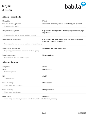Rejse Almen Almen - Essentielle Engelsk Polsk Can you help me, please? At spørge efter hjælp Możesz mi pomóc? [form.:] Może Pan(i) mi pomóc? Do you speak English? Czy mówisz po angielsku? [form.:] Czy mówi Pan(i) po angielsku? At spørge efter om en person snakker engelsk Do you speak _[language]_? Czy mówisz po _ [nazwa języka] _? [form.:] Czy mówi Pan(i) po _ [nazwa języka] _? At spørge efter om en person snakker et bestemt sprog I don't speak_[language]_. At tydeliggøre at du ikke snakke et bestemt sprog Nie mówię po _ [nazwa języka] _. I don't understand. At forklare at du ikke forstår noget Nie rozumiem. Almen - Samtale Engelsk Polsk Hello! Almindelig hilsen Dzień dobry! Hi! Uformel hilsen Cześć! Good Morning! Hilsen brugt om morgenen Dzień dobry! Good Evening! Hilsen brugt om aftenen Dobry wieczór! Good Night! Dobranoc! Hilsen brugt når man tager afsted om aftenen/natten eller før man går i seng Side 1 02.03.2017 Rejse Almen How are you? Jak się masz? [form.:] Jak się Pan(i) ma? Venlig småsnak om hvordan den anden person har det Good, thank you. Venligt svar til 'Hvordan har du det?' Dobrze, dziękuję. What’s your name? At spørge efter den anden persons navn Jak się nazywasz? [form.:] Jak się Pan(i) nazywa? My name is ___. At fortælle en dit navn Nazywam się ___. Where are you from? At spørge efter nogens oprindelse Skąd pochodzisz? [form.:] Skąd Pan(i) pochodzi? I am from___. At svare på din oprindelse Pochodzę z ___. How old are you? At spørge efter nogens alder Ile masz lat? [form.:] Ile ma Pan(i) lat? I am___years old. At svare på din alder Mam ___ lat(a). Yes Positivt svar Tak No Negativt svar Nie Please Et fyldeord som tilføjer et positivt præg Proszę Here you go! Brugt når man giver noget til en Proszę bardzo! Thank you. At takke nogen Dziękuję. Side 2 02.03.2017 Rejse Almen Thank you very much. At takke nogen meget med varme Dziękuję bardzo. You're welcome. At svare venligt på et "tak" Proszę bardzo! / Nie ma za co! I am sorry. At undskylde for noget Przepraszam. Excuse me. At få ens opmærksomhed Przepraszam. It's OK. At svare på en undskyldning hvis du accepterer den Nic się nie stało. No problem. At svare på en undskyldning hvis du accepterer den Nie ma sprawy. Watch out! At gøre en opmærksom på fare Uwaga! I am hungry. Brugt når du er sulten Jestem głodny/-a. I am thirsty. Brugt når du er tørstig Chce mi się pić. I am tired. Brugt når du er træt Jestem zmęczony/-a. I am sick. Brugt når du er syg Źle się czuję. I don't know. Du kender ikke svaret på et spørgsmål Nie wiem. It was nice meeting you. Miło było cię poznać. [form.:] Miło było Panią/Pana poznać. Venlig fravel frase efter det første møde Side 3 02.03.2017 Rejse Almen Goodbye! At sige farvel Do widzenia! Almen - Klager Engelsk Polsk I would like to make a complaint. En venlig måde at starte din klage på Chciał(a)bym złożyć skargę. Who is in charge here? At finde ud af hvem der er ansvarlig Kto tu rządzi? This is totally unacceptable! At vise din utilfredshed meget stærkt To jest absolutnie niedopuszczalne! I want my money back! At spørge efter en tilbagebetalelse Żądam zwrotu pieniędzy! We have been waiting for over an hour. At klage over meget lange ventetider Czekamy ponad godzinę. Almen - At bande Engelsk Polsk This food tastes like crap! To jedzenie smakuje jak gówno! Uhøflig måde at vise man er utilfreds med sit mad på This drink tastes like piss! Ten napój/drink smakuje jak szczyny! Uhøflig måde at vise man er utilfreds med sin drink på This place is a shithole! To miejsce to obrzydliwa nora! Uhøflig måde at vise man er utilfreds med et sted på This car is a wreck! Uhøflig måde at vise man er utilfreds med en bil på Ten samochód to wrak! The service sucks! Obsługa jest do dupy! Uhøflig måde at vise man er utilfreds med servicen på Side 4 02.03.2017 Rejse Almen This is a total rip-off! At klage uforskammet over en høj pris To jest totalne zdzierstwo! That is bullshit! Gówno prawda! Uforskammet måde at vise tvivl over noget en sagde You are a stupid moron! Kretyn/Kretynka! At fornærme en person ved at kritisere hans/hendes intelligens You don't know shit! Gówno wiesz! At fornærme en person ved at kritisere hans/hendes viden Piss off! Odwal się! At fortælle en person på en uforskammet måde at han/hun skal gå med det samme Let's settle this outside! At spørge en person om at slås udenfor et sted Załatwmy to na zewnątrz! Side 5 Powered by TCPDF (www.tcpdf.org) 02.03.2017