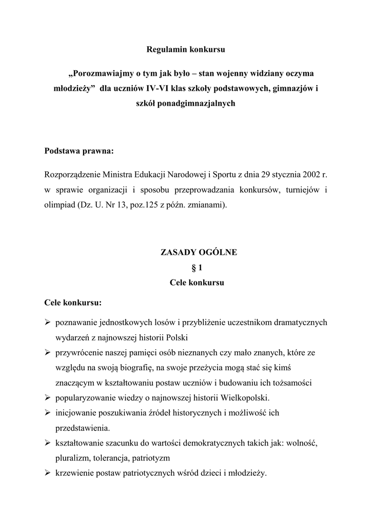 Regulamin konkursu „Porozmawiajmy o tym jak było – stan wojenny widziany oczyma młodzieży” dla uczniów IV-VI klas szkoły podstawowych, gimnazjów i szkół ponadgimnazjalnych Podstawa prawna: Rozporządzenie Ministra Edukacji Narodowej i Sportu z dnia 29 stycznia 2002 r. w sprawie organizacji i sposobu przeprowadzania konkursów, turniejów i olimpiad (Dz. U. Nr 13, poz.125 z późn. zmianami). ZASADY OGÓLNE §1 Cele konkursu Cele konkursu: poznawanie jednostkowych losów i przybliżenie uczestnikom dramatycznych wydarzeń z najnowszej historii Polski przywrócenie naszej pamięci osób nieznanych czy mało znanych, które ze względu na swoją biografię, na swoje przeżycia mogą stać się kimś znaczącym w kształtowaniu postaw uczniów i budowaniu ich tożsamości popularyzowanie wiedzy o najnowszej historii Wielkopolski. inicjowanie poszukiwania źródeł historycznych i możliwość ich przedstawienia. kształtowanie szacunku do wartości demokratycznych takich jak: wolność, pluralizm, tolerancja, patriotyzm krzewienie postaw patriotycznych wśród dzieci i młodzieży. promowanie osiągnięć uczniów i nauczycieli. §2 Organizator 1. Organizatorem konkursu jest Muzeum Powstania Poznańskiego –Czerwiec 1956, oddział Wielkopolskiego Muzeum Niepodległości w Poznaniu. Adres: Muzeum Powstania Poznańskiego – Czerwiec 1956 ul. Św. Marcin 80/82 (Zamek) 61-809 Poznań Tel. 61 852 94 64 [email protected] 2. Szczegółowe informacje na temat konkursu można uzyskać u Kingi Przyborowskiej tel. 61 852 94 64 ([email protected]) i Marii Skrzypczak tel. 61 852 94 64 ([email protected]). §3 Czas trwania konkursu 1. Konkurs rozpoczyna się 1 października 2016 roku i trwa do 30 listopada 2016 roku. §4 Warunki uczestnictwa w konkursie 1. Konkurs jest konkursem tematycznym. 2. Konkurs ma charakter otwarty i skierowany jest do uczniów: - klas IV – VI szkół podstawowych, gimnazjów i szkół ponadgimnazjalnych z terenu Wielkopolski 3. Konkurs organizowany jest w trzech kategoriach: - szkoły podstawowe - gimnazja - szkoły ponadgimnazjalne 3. Udział w konkursie jest bezpłatny. 4. Prace konkursowe muszą być pracami własnymi, nigdzie wcześniej niepublikowanymi, nieprzedstawianymi na innych konkursach. Nadesłanie pracy jest jednoznaczne ze złożeniem deklaracji o powyższym fakcie. 5. Udział w konkursie jest jednoznaczny z nieodpłatnym przekazaniem praw do wykorzystania prac na następujących polach eksploatacji: druku na dowolnej liczbie publikacji i w dowolnym nakładzie, używania w Internecie oraz w innych formach utrwaleń nadających się do rozpowszechnienia, a także prezentowania Wielkopolskie prac Muzeum na wystawach Niepodległości organizowanych w Poznaniu w przez celu popularyzowania wiedzy o historii najnowszej. Uczestnik wyraża również zgodę na pierwsze publiczne wykorzystanie pracy. 6. Osoby nadsyłające prace konkursowe wyrażają zgodę na przetwarzanie przez Organizatora Konkursu swoich danych osobowych (ustawa o ochronie danych osobowych z dnia 19 sierpnia 1997 roku) w celach konkursowych 7. Prace nie spełniające zadań uczestnictwa nie będą brane po uwagę przez Komisję Konkursową. §5 Zadanie konkursu 1. Zadaniem uczestnika konkursu jest przygotowanie samodzielnie lub pod kierunkiem nauczyciela (opiekuna naukowego) indywidulanej pracy w formie reportażu, która powinna: - być zatytułowana inaczej niż konkurs - mieć formę wywiadu z osobą pamiętającą okres stanu wojennego - mieć twórczy charakter - opierać się na źródłach historycznych (np. wspomnienia, pamiętniki, listy, dokumenty rodzinne– zdjęcia) poprzez te źródła wzbogacać relacje głównego bohatera/bohaterów opisując losy w okresie stanu wojennego, -zawierać bibliografię z podaniem wykorzystanych źródeł historycznych - mogą być w formie nagrania dźwiękowego wzbogaconego prezentacją, w formie prezentacji, w formie nagrania filmowego, w formie tekstu z załącznikami. - prace w formie maszynopisu nie mogą przekraczać 20 stron tekstu znormalizowanego (czcionka 12, Time New Roman, interlinia 1,15) podana liczba stron dotyczy tekstu bez załączników. - zawierać metryczkę, zgodnie ze wzorem (załącznik nr 1 do regulaminu - przygotowana praca może mieć formę biografii, eseju, opowiadania wywiadu itp. Można ją wzbogacić o zdjęcia, dokumenty itp. 2. Prace przygotowane przez zespoły autorskie, zgłaszane wcześniej w innych konkursach opublikowane w całości lub w części przed rozstrzygnięciem konkursu, skopiowane z Internetu nie zostaną zakwalifikowane do konkursu. §6 Przebieg konkursu 1. Uczestnik zgłasza swój udział w konkursie poprzez - wypełnienie formularza zgłoszeniowego zgodnie z wzorem (załącznik nr 2 do Regulaminu) i przesłanie go do organizatora Muzeum Powstania Poznańskiego – Czerwiec 1956 ul. Św. Marcin 80/82 (Zamek) 61-809 Poznań tel. 61 852 94 64 [email protected] - lub wypełnienie elektronicznego formularza dostępnego na stronie internetowej wmn.poznan.pl bądź pocztą elektroniczną. 2. Prace należy dostarczyć do 30 listopada 2016 roku 3. Do zgłoszenia należy dołączyć metryczkę pracy. 4. Prace nadsyłane po terminie nie będą oceniane (decyduje data wpłynięcia do Muzeum). 5. Organizator nie odpowiada za zniszczenie prac w trakcie przewozu. §7 Ocena prac konkursowych 1. O wyłonieniu zwycięscy konkursu zdecyduje Komisja Konkursowa. 2. Komisja zostanie powołana przez organizatora konkursu czyli Muzeum Powstania Poznańskiego – Czerwiec 1956 i wyłoni zwycięskie prace w trzech kategoriach wiekowych: Szkoły podstawowe – klasy IV – VI Gimnazja Szkoły ponadgimnazjalne 3. Spośród zgłoszonych do konkursu prac komisja wybierze minimum 12 prac (3 w każdej kategorii wiekowej). 4. Kryteria oceny ustalone zostają w następujący sposób: 1) Trafność doboru tematu pracy 2) Jakość wykonania 3) Oryginalność 4) Stopień trudności wykonania 5. Decyzje komisji konkursowej są o