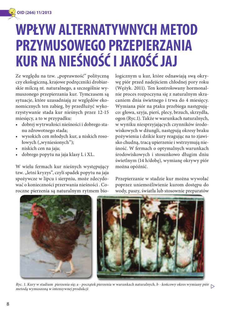 OID (266) 11/2013 KJL WPŁYW ALTERNATYWNYCH METOD PRZYMUSOWEGO PRZEPIERZANIA KUR NA NIEŚNOŚĆ I JAKOŚĆ JAJ Ze względu na tzw. „poprawność” polityczną czy ekologiczną, krajowe podręczniki drobiarskie milczą nt. naturalnego, a szczególnie wymuszonego przepierzania kur. Tymczasem są sytuacje, które uzasadniają ze względów ekonomicznych ten zabieg, by przedłużyć wykorzystywanie stada kur nieśnych przez 12-15 miesięcy, a to w przypadku: • dobrej wytrwałości nieśności i dobrego stanu zdrowotnego stada; • wysokich cen młodych kur, a niskich rosołowych („wyniesionych”); • niskich cen na jaja; • dobrego popytu na jaja klasy L i XL. W wielu fermach kur nieśnych występujący tzw. „letni kryzys”, czyli spadek popytu na jaja spożywcze w lipcu i sierpniu, może zdecydować o konieczności przerwania nieśności . Coroczne pierzenia są naturalnym rytmem bio- logicznym u kur, które odnawiają swą okrywę piór przed nadejściem chłodnej pory roku (Wężyk. 2011). Ten kontrolowany hormonalnie proces rozpoczyna się z naturalnym skracaniem dnia świetnego i trwa do 4 miesięcy. Wymiana piór na ptaku przebiega następująco: głowa, szyja, pierś, plecy, brzuch, skrzydła, ogon (Ryc.1). Także w warunkach naturalnych, w wyniku niesprzyjających czynników środowiskowych w dżungli, następują okresy braku pożywienia i dzikie kury reagując na to zjawisko chudną, tracą upierzenie i wstrzymują nieśność. W fermach o optymalnych warunkach środowiskowych i stosunkowo długim dniu świetlnym (14 h/dobę), wymianę okrywy piór można opóźnić. Przepierzanie w stadzie kur można wywołać poprzez uniemożliwienie kurom dostępu do wody, paszy, światła lub stosownie preparatów Ryc. 1. Kury w stadium pierzenia się; a - początek pierzenia w warunkach naturalnych, b - końcowy okres wymiany piór metodą wymuszoną w intensywnej produkcji 8 OID (266) 11/2013 KJL hormonalnych (tyroksyny, progesteronu i methaliburu). Wraz z rozwojem różnych metod produkcji jaj i mięsa drobiowego, pojawili się ich krytycy, należący do różnych grup ekologicznych, upatrując w nich przyczyn zaburzenia w dobrostanie ptaków. Niektóre ze stosowanych metod stały się przedmiotem ostrych polemik między tzw. obrońcami praw zwierząt, a konsumentami, producentami i naukowcami. Jednym z tematów dyskusji jest stosowanie wymuszonego przepierzania kur, mającego na celu przedłużenie ich życia i okresu produkcyjnego. Wymuszane przepierzanie niosek jest znane i stosowane od dawna w różnych częściach świata (Szuman, 1975), jednakże krytykowane jest przez organizacje tzw. „dobrostanowców” („welfarystów”), ze względu na stosowane w nich bodźce (Damme i Hildebrand, 2002). Ornitologom wiadomo, że przepierzanie jest naturalnym procesem u dzikich ptaków, występującym po okresie reprodukcji i wymiana piór trwa około czterech miesięcy. Wskazówką, że rozpoczyna się ten proces jest osłabienie sił fizycznych kury i początek wypadania piór oraz zaprzestanie nieśności. Aby przyspieszyć wypadanie starych piór, należy go zgrać z programem odrastania nowych piór i szybkiego wznowienia produkcji jaj. Zabieg ten znany jako program wymuszonego przepierzania, nie powinien trwać dłużej niż 6-8 tygodni (Garcia, 2004). U kur nieśnych wymuszone przepierzanie ma na celu „odmłodzenie” organizmu nioski, która po stracie nawet do 30% swej masy ciała wraca do masy ciała młódki z początku nieśności, a także wywołanie u niej przerwy w produkcji jaj, w czasie której nastąpi regeneracja dróg rodnych i ich przygotowanie do nowego cyklu produkcyjnego (Garcia, 2004). Najczęściej stosowaną metodą wymuszonego przepierzenia było pozbawienie kur paszy, co obciążało koszty chowu i zwiększało skuteczność tego za10 biegu. Metoda ta jest m. in. powszechnie stosowana w Brazylii, gdzie obejmuje ponad 22 mln kur/rok i przyczynia się do zwiększenia ilości i opłacalności produkcji jaj. W USA 90% kur poddawanych jest wymuszonemu przepierzaniu pomiędzy 60 a 80 tygodniem życia (Bell, 2003). Gdy wymuszone przepierzanie przeprowadzone jest prawidłowo, w drugim cyklu produkcyjnym następuje poprawa zewnętrznego i wewnętrznego stanu fizycznego kury, jakości skorupy i masy jaj, w porównaniu do końcowego okresu pierwszego cyklu nieśności. Wg Garcia (2005), produkcja w drugim cyklu nieśności jest 5 - 10% niższa niż w pierwszym, a wymuszone przepierzanie najlepiej przeprowadzić, gdy stado niosek osiągnie około 70 tygodnia życia. Metody wymuszonego przepierzania Wg Liobet (1989) metody przepierzania dzielą się generalnie na trzy grupy: a.farmakologiczne, b.zarządzania chowem kur, c.żywieniowe. Metody farmakologiczne polegają na podawaniu kurom niektórych leków, takich jak 2 amino-5, nitrohiazole, progesteron, substancji hamujących owulację - jak octan chlormadinonu lub innych produktów, które wywołują u ptaków wymianę okrywy piór i okresową przerwę w nieśności. Stosowanie tych metod jest jeszcze w fazie doświadczalnej ze względu na trudności z ich stosowaniem jak i na możliwość wpływu pozostałości tych substancji na zdrowie ludzi. Wymuszone przepierzanie kur różnymi metodami zarządzania chowu polegają na wywoływaniu u ptaków różnych sytuacji stresowych, powodujących szybkie przerwanie produkcji jaj. Najczęściej skraca się długość dnia świetlnego z równoczesną rezygnacją ze sztucznego światła przez okres 14 dni i uniemożliwieniem OID (266) 11/2013 KJL dostępu do wody pitnej przez 3 ostatnie doby. Ten ostatni zabieg jest o tyle niebezpieczny, że ptaki wydalają do kało-moczu metabolity, które mogą powodować zatrucia. Każdy ośrodek badawczy zaleca w tym przypadku do wykorzystania inną metodę zarządzania chowem. Najbardziej popularną, o nazwie „Konwencjonalna Metoda Przepierzania Kur”, opracował Uniwersytet Kalifornia ( Molino i Garcia, 2012). W okresie przed przep
