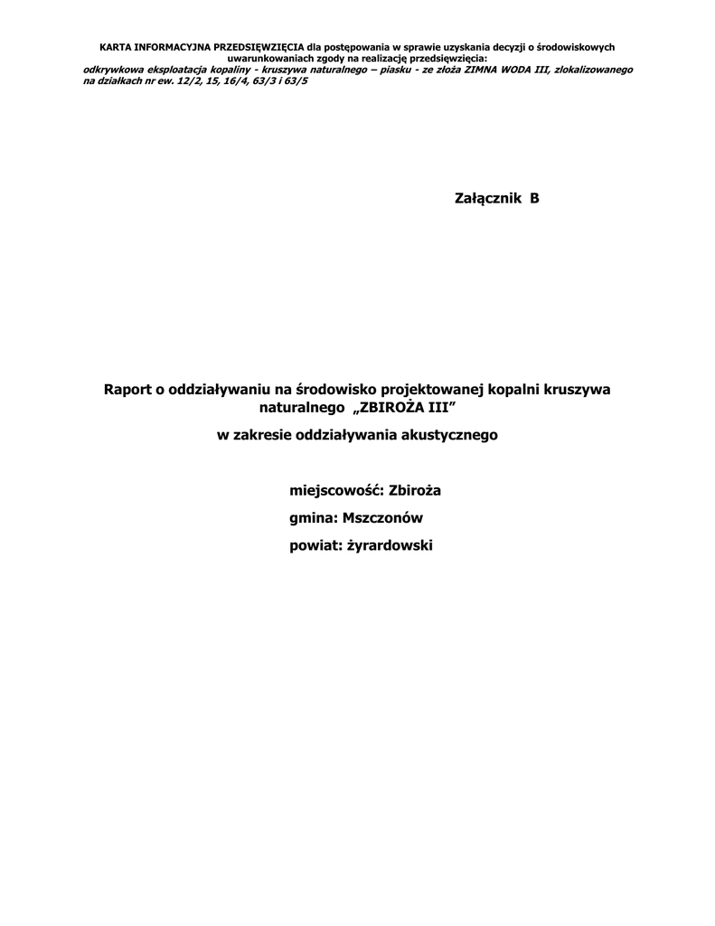 KARTA INFORMACYJNA PRZEDSIĘWZIĘCIA dla postępowania w sprawie uzyskania decyzji o środowiskowych uwarunkowaniach zgody na realizację przedsięwzięcia: odkrywkowa eksploatacja kopaliny - kruszywa naturalnego – piasku - ze złoża ZIMNA WODA III, zlokalizowanego na działkach nr ew. 12/2, 15, 16/4, 63/3 i 63/5 Załącznik B Raport o oddziaływaniu na środowisko projektowanej kopalni kruszywa naturalnego „ZBIROŻA III” w zakresie oddziaływania akustycznego miejscowość: Zbiroża gmina: Mszczonów powiat: żyrardowski KARTA INFORMACYJNA PRZEDSIĘWZIĘCIA dla postępowania w sprawie uzyskania decyzji o środowiskowych uwarunkowaniach zgody na realizację przedsięwzięcia: odkrywkowa eksploatacja kopaliny - kruszywa naturalnego – piasku - ze złoża ZIMNA WODA III, zlokalizowanego na działkach nr ew. 12/2, 15, 16/4, 63/3 i 63/5 1. Metodyka oceny........................................................................................ 2. Wymagania akustyczne.............................................................................. 3. Analiza oddziaływania inwestycji na środowisko - faza budowy 4. Analiza oddziaływania inwestycji na środowisko - faza eksploatacji 4.1. Charakterystyka źródeł hałasu...................................................... 4.1.1. Założenia eksploatacyjne ............................. 4.1.2. Ruchome źródła hałasu................................................... 4.2. Analiza przewidywanych warunków akustycznych w środowisku - pora dnia. 4.2.1. Dane wejściowe do analizy........................................... 4.2.2. Ocena warunków akustycznych w środowisku................. 5. Wnioski końcowe.......................................................................................... II. ZAŁĄCZNIKI Nr H1. Dane wejściowe do obliczeń akustycznych dla pory dnia. III. RYSUNKI Nr H1. Plan sytuacyjny terenu i otoczenia projektowanej kopalni kruszywa naturalnego Zimna Woda III z rozmieszczeniem źródeł hałasu i wartościami równoważnego poziomu dźwięku A LA eq D w punktach obserwacji. Pora dnia. Nr H2. Mapa akustyczna terenu i otoczenia projektowanej kopalni kruszywa naturalnego Zimna Woda III z izoliniami równoważnego poziomu dźwięku A LA eq D 50 ÷ 55 dB. Pora dnia KARTA INFORMACYJNA PRZEDSIĘWZIĘCIA dla postępowania w sprawie uzyskania decyzji o środowiskowych uwarunkowaniach zgody na realizację przedsięwzięcia: odkrywkowa eksploatacja kopaliny - kruszywa naturalnego – piasku - ze złoża ZIMNA WODA III, zlokalizowanego na działkach nr ew. 12/2, 15, 16/4, 63/3 i 63/5 1. Metodyka oceny Analizę oddziaływania projektowanej kopalni kruszywa naturalnego Zimna Woda III gm. Mszczonów na środowisko w zakresie emisji hałasu została opracowana na podstawie: 1 ustawy z dnia 27 kwietnia 2001 r. Prawo ochrony środowiska (Dz. U. z 2013 r., poz. 1232, z późn. zm.); 2 rozporządzenia Ministra Środowiska z dnia 14 czerwca 2007 r. w sprawie dopuszczalnych poziomów hałasu w środowisku (Dz. U. z 2014, t.j., poz.112); 3 instrukcji ITB nr 311 “Metoda prognozowania hałasu emitowanego z obszarów dużych źródeł powierzchniowych” ITB Warszawa 1991 r.; 4 instrukcji nr 338/96 Instytutu Techniki Budowlanej p.t.: "Metoda określania emisji i imisji hałasu w środowisku oraz program komputerowy HPZ_2001_ITB"; 5 dyrektywę 2002/49/WE Parlamentu Europejskiego i Rady z dnia 25 czerwca 2002 r. odnoszącą się do oceny i zarządzania poziomem hałasu w środowisku; 6 Polską Normę PN-ISO 9613-2 Akustyka. Tłumienie dźwięku podczas propagacji w przestrzeni otwartej. Ogólna metoda obliczania. 7 planu sytuacyjnego terenu i otoczenia projektowanej inwestycji w skali 1: 1000; 8 założeń projektowych i eksploatacyjnych inwestora. Obliczenia akustyczne (emisji hałasu do środowiska) przeprowadzono przy pomocy programu komputerowego HPZ’2001 Windows. Obliczone poziomy hałasu porównano z wartościami dopuszczalnymi określonymi w rozporządzeniu Ministra Środowiska z dnia 14 czerwca 2007 r. w sprawie dopuszczalnych poziomów hałasu w środowisku (Dz. U. z 2014, t.j., poz.112). Obliczenia emisji hałasu i zasięgów jego oddziaływania wykonano dla pory dnia. Obliczenia akustyczne wykonano dla punktów obserwacji zlokalizowanych w środowisku – w pobliżu obiektów podlegających ochronie akustycznej. Obliczenia akustyczne emisji hałasu do środowiska przeprowadzono również dla obszaru o wymiarach: 340 x 460 m, w siatce o kroku 5 x 5 m – na poziomie 4 m. KARTA INFORMACYJNA PRZEDSIĘWZIĘCIA dla postępowania w sprawie uzyskania decyzji o środowiskowych uwarunkowaniach zgody na realizację przedsięwzięcia: odkrywkowa eksploatacja kopaliny - kruszywa naturalnego – piasku - ze złoża ZIMNA WODA III, zlokalizowanego na działkach nr ew. 12/2, 15, 16/4, 63/3 i 63/5 2. Wymagania akustyczne Wymagania akustyczne, dotyczące dopuszczalnych poziomów hałasu w środowisku, określa rozporządzenie Ministra Środowiska z dnia 14 czerwca 2007 r. w sprawie dopuszczalnych poziomów hałasu w środowisku (Dz. U. z 2014, t.j., poz.112). Teren projektowanej kopalni kruszywa naturalnego Zimna Woda III gm. Mszczonów od strony zachodniej i północnej graniczy z terenami rolnymi, od strony wschodniej z terenem kopalni Zimna Woda, a od strony południowej z zabudową zagrodową, za którą znajduje się droga krajowa nr 50. Między terenem kopalni, a drogą krajową znajduje się zabudowa zagrodowa. Zabudowa ta podlega ochronie akustycznej wg punktu 3 załącznika do cyt. wyżej rozporządzenia - tereny zabudowy zagrodowej. Dopuszczalne wartości poziomu hałasu w środowisku - wyrażone równoważnym poziomem dźwięku A, dla terenów zabudowy zagrodowej, wynoszą: - w porze dnia tj. w godzinach 600 ÷ 2200 - 55 dB, - w porze nocy tj. w godzinach 2200 ÷ 600 - 45 dB. Dopuszczalne wartości równoważnego poziomu dźwięku A dotyczą: - 8 najniekorzystniejszych godzin w ciągu dnia. Projektowana kopalnia Zimna Woda III będzi