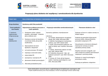 Propozycja planu działania sied współpracy i samokształcenia dla dyrektorów TEMAT SIECI ROLA DYREKTORA W PROMOCJI I BUDOWANIU WIZERUNKU SZKOŁY Grupa docelowa Dyrektorzy szkół i/lub przedszkoli Temat spotkania i czas trwania Najważniejsze problemy poruszane w czasie spotkania 1. Spotkanie organizacyjne. Integracja grupy 1. Omówienie celów i założeo projektu „sieciowego”. Ustalenie planu działania sieci. (4 godz. dydaktyczne) 2. Dyskusja na temat roli dyrektora w promocji szkoły, jak ją sobie wyobrażamy. 3. Wprowadzenie do teorii. Spotkanie z ekspertem: co to jest promocja i PR szkoły? reputacja a wizerunek szkoły etyka działao PR wewnętrzny i zewnętrzny PR planowanie działao promocyjnych 4. Warsztaty prowadzone przez Propozycje materiałów samokształceniowych Scenariusz spotkania z koordynatorem Literatura: 1. Jan Fazlagid, Marketingowe zarządzanie szkołą, wyd. CODN, Warszawa 2003. 2. D. Dolioski, Psychologiczne mechanizmy reklamy, wyd. GWP, Gdaosk 2010. 3. D. Asslet, Jak przemawiad publicznie i nie wyjśd na idiotę, wyd. Czytelnik, Warszawa 1994. 4. R. Cialdini, Wywieranie wpływu na ludzi, wyd. GWP, Gdaosk 1996. 5. M. Podzielska, Nauczyciel – lider. Jak budowad autorytet?, wyd. WSiP, Warszawa 2009. 6. P. Fortuna, M. Torój, Jak byd lepszym szefem. Inspiracje psychologiczne, wyd. Difin, Warszawa 2009. Planowane działania w sieci Dyskusja na forum nt. wyboru tematu na kolejne zajęcia. Dzielenie się pomysłami dotyczącymi promocji szkoły, ciekawą literaturą, pomysłami związanymi z PR. Wyszukiwanie w Internecie ciekawych inspiracji do rozmowy na temat sposobów promocji szkoły. Wspólne tworzenie netografii, czyli zbioru linków do zasobów internetowych związanych z promocją szkoły. Dyskusja nt. nowych technologii w promowaniu szkoły. Dyskusja po spotkaniu z ekspertem. System doskonalenia nauczycieli oparty na ogólnodostępnym kompleksowym wspomaganiu szkół Projekt współfinansowany przez Unię Europejską w ramach Europejskiego Funduszu Społecznego 2. Wizerunek dyrektora (4 godz. dydaktyczne) eksperta (np. znany w środowisku dziennikarz): przygotowywanie materiałów dla lokalnej prasy w celach promocyjnych, kontakty z dziennikarzami. 1. Ekspozycja publiczna dyrektora – jak wyglądad, jak się zachowywad, aby jak najlepiej reprezentowad placówkę? 2. Wystąpienia publiczne – jak się przygotowad, jak przemawiad ? (techniki w zależności od rodzaju wystąpienia) 3. Krótkie warsztaty prowadzone przez eksperta nt. zasad precedencji. Wspólne ustalenie, kto poprowadzi kolejny warsztat. Scenariusz spotkania z koordynatorem Literatura: 1. M. Podzielska, Nauczyciel – lider. Jak budowad autorytet?, wyd. WSiP, Warszawa 2009. 2. Przywództwo w szkole, pod red. J. Michalak, wyd. IMPULS, Kraków 2007. 3. R. Gut, Cechy osobowe dyrektora szkoły a styl zarządzania, wyd. CODN, Warszawa 2009. 4. Propozycja ceremoniału szkolnego dla szkół i placówek oświatowych w województwie świętokrzyskim, Kielce 2006. http://kuratorium.kielce.pl/ Wymiana plików i materiałów na temat wizerunku dyrektora, zasad precedencji, wystąpieo publicznych. Dyskusja na temat spotkania z zaproszonym ekspertem. Wspólne ustalenie, kto poprowadzi kolejny warsztat. Czasopisma: Dyrektor Szkoły Sedno. Magazyn Dyrektora Szkoły Miesięcznik Dyrektora Szkoły 3. Media Relations (4 godz. dydaktyczne) 1. Spotkanie z ekspertami: dziennikarzem i rzecznikiem prasowym. 2. Dyskusja panelowa z ekspertami m. in. na temat: Scenariusz spotkania z koordynatorem Dyskusja na forum o spotkaniu z ekspertami. Pozycje zaproponowane przez ekspertów Dyskusja na forum o lokalnym rynku System doskonalenia nauczycieli oparty na ogólnodostępnym kompleksowym wspomaganiu szkół Projekt współfinansowany przez Unię Europejską w ramach Europejskiego Funduszu Społecznego 3. 4. 1. 4. Współpraca szkoły ze środowiskiem lokalnym 2. (4 godz. dydaktyczne) 3. 4. 5. zasady współpracy z dziennikarzami. jak informowad o sytuacjach trudnych i kryzysowych? jak kształtowad pozytywny wizerunek szkoły w mediach? Rozmowa uczestników sieci na temat szkolnej polityki medialnej. Praca w grupach nad konkretnymi problemami, np. jak przygotowad „dobry” komunikat prasowy? Prezentacja „dobrych praktyk”: uczestnicy sieci przedstawiają sprawdzone formy współpracy ze środowiskiem lokalnym. Praca w grupach nad konkretnymi problemami, np. jak współpracowad z rodzicami? jak – z samorządem lokalnym? jak – z ośrodkiem kultury? Dyskusja: razem czy osobno? Na ile wspólne działania szkół, wspólne przedsięwzięcia mogą poprawid współpracę ze środowiskiem lokalnym? Bank pomysłów: planujemy wspólne działania szkół na rzecz środowiska lokalnego Spotkanie z wójtem, burmistrzem, prezydentem, innymi przedstawicielami środowiska Ustawa: prawo prasowe J. Leszczyoska, Zarządzanie sytuacją kryzysową w szkole, Wyd. Raabe, Warszawa 2009. Nowa szkoła. Skuteczne zarządzanie w praktyce kierownik wydania Joanna Szczęsna, Wyd. Raabe, Warszawa Scenariusz spotkania z koordynatorem Literatura: Jan Fazlagid, Marketingowe zarządzanie szkołą, wyd. CODN, Warszawa 2003. Joanna Szczęsna Nowa szkoła. Skuteczne zarządzanie w praktyce, Wyd. Raabe, Warszawa medialnym; czasopismach, telewizji lokalnej, internetowych serwisach i portalach informacyjnych. Badania fokusowe: jaki obraz szkoły i nauczycieli wyłania się z lokalnych serwisów i portali informacyjnych. Wymiana opinii na temat spotkania z przedstawicielami środowiska lokalnego Dyskusja na forum na temat wspólnych przedsięwzięd czy ogólnie – współpracy ze środowiskiem lokalnym Strony internetowe: http://otwartaszkola.men.gov.pl/ System doskonalenia nauczycieli oparty na ogólnodostępnym kompleksowym wspomaganiu szkół Projekt współfinansowany przez Unię Europejską w ramach Europejskiego Funduszu Społecznego lokalnego, w celu np. konsultacji pomysłów wypracowanych podczas „sieciowych” spotkao (np. wspólnych