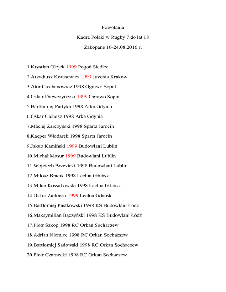 Powołania Kadra Polski w Rugby 7 do lat 18 Zakopane 16-24.08.2016 r. 1.Krystian Olejek 1999 Pogoń Siedlce 2.Arkadiusz Korusewicz 1999 Juvenia Kraków 3.Atur Ciechanowicz 1998 Ogniwo Sopot 4.Oskar Drewczyńczki 1999 Ogniwo Sopot 5.Bartłomiej Partyka 1998 Arka Gdynia 6.Oskar Cichosz 1998 Arka Gdynia 7.Maciej Żarczyński 1998 Sparta Jarocin 8.Kacper Włodarek 1998 Sparta Jarocin 9.Jakub Kamiński 1999 Budowlani Lublin 10.Michał Mosur 1999 Budowlani Lublin 11.Wojciech Brzezicki 1998 Budowlani Lublin 12.Miłosz Bracik 1998 Lechia Gdańsk 13.Milan Kossakowski 1998 Lechia Gdańsk 14.Oskar Zieliński 1999 Lechia Gdańsk 15.Bartłomiej Pustkowski 1998 KS Budowlani Łódź 16.Maksymilian Bączyński 1998 KS Budowlani Łódź 17.Piotr Szkop 1998 RC Orkan Sochaczew 18.Adrian Niemiec 1998 RC Orkan Sochaczew 19.Bartłomiej Sadowski 1998 RC Orkan Sochaczew 20.Piotr Czarnecki 1998 RC Orkan Sochaczew 21.Krystian Mechecki 1999 RC Orkan Sochaczew Rezrwa: 1.Konrad Konarzewski 1998 Rugby Team Olsztyn 2.Antony Boska 1998 Ogniwo Sopot 3.Paweł Szymański 1998 Ogniwo Sopot 4.Norbert Okoniewski 1998 RC Orkan Sochaczew 5.Kamil Brzozowski 1998 KS Budowlani Łódź