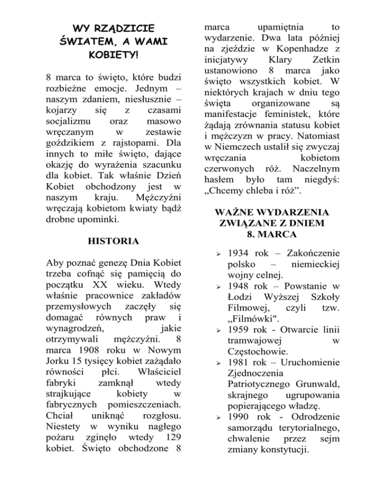 WY RZĄDZICIE ŚWIATEM, A WAMI KOBIETY! 8 marca to święto, które budzi rozbieżne emocje. Jednym – naszym zdaniem, niesłusznie – kojarzy się z czasami socjalizmu oraz masowo wręczanym w zestawie goździkiem z rajstopami. Dla innych to miłe święto, dające okazję do wyrażenia szacunku dla kobiet. Tak właśnie Dzień Kobiet obchodzony jest w naszym kraju. Mężczyźni wręczają kobietom kwiaty bądź drobne upominki. HISTORIA Aby poznać genezę Dnia Kobiet trzeba cofnąć się pamięcią do początku XX wieku. Wtedy właśnie pracownice zakładów przemysłowych zaczęły się domagać równych praw i wynagrodzeń, jakie otrzymywali mężczyźni. 8 marca 1908 roku w Nowym Jorku 15 tysięcy kobiet zażądało równości płci. Właściciel fabryki zamknął wtedy strajkujące kobiety w fabrycznych pomieszczeniach. Chciał uniknąć rozgłosu. Niestety w wyniku nagłego pożaru zginęło wtedy 129 kobiet. Święto obchodzone 8 marca upamiętnia to wydarzenie. Dwa lata później na zjeździe w Kopenhadze z inicjatywy Klary Zetkin ustanowiono 8 marca jako święto wszystkich kobiet. W niektórych krajach w dniu tego święta organizowane są manifestacje feministek, które żądają zrównania statusu kobiet i mężczyzn w pracy. Natomiast w Niemczech ustalił się zwyczaj wręczania kobietom czerwonych róż. Naczelnym hasłem było tam niegdyś: „Chcemy chleba i róż”. WAŻNE WYDARZENIA ZWIĄZANE Z DNIEM 8. MARCA 1934 rok – Zakończenie polsko – niemieckiej wojny celnej. 1948 rok – Powstanie w Łodzi Wyższej Szkoły Filmowej, czyli tzw. „Filmówki". 1959 rok - Otwarcie linii tramwajowej w Częstochowie. 1981 rok – Uruchomienie Zjednoczenia Patriotycznego Grunwald, skrajnego ugrupowania popierającego władzę. 1990 rok - Odrodzenie samorządu terytorialnego, chwalenie przez sejm zmiany konstytucji. NA WESOŁO – PRZYSŁOWIA I CYTATY O KOBIETACH „Bez kobiety mężczyzna jest tylko półczłowiekiem.” „Kobieta brzydka, to której uroda jest ukryta.” taka, „Zacną kobietę poznać po tym, co robi, zacnego mężczyznę po tym, czego nie robi.” „Nigdy nie zaprzeczaj kobiecie, za chwilę ona sama sobie zaprzeczy.” „Jeżeli skrzywdzona kobieta uśmiecha się wobec krzywdziciela, to albo nie ma wstydu, albo jest pewna, że się dobrze zemścić potrafi.” „Kobieta jest twierdzą, mężczyzna jej więźniem.” „Kobieta podobna jest do cienia - kiedy ją ścigasz – ucieka; jeśli ty uciekasz - idzie za tobą.” „Idealną żoną jest każda kobieta, która ma idealnego męża.” J Ż, A J