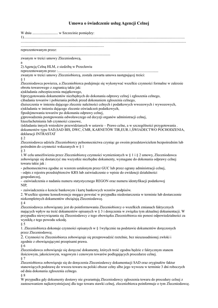 Umowa o świadczenie usług Agencji Celnej W dniu ............................ w Szczecinie pomiędzy: 1)........................................................................................................................... ..................................................... ..................................................................................................................................................................................... ........................................................................................... reprezentowanym przez: .................................................................................................. zwanym w treści umowy Zleceniodawcą, a 2) Agencją Celną HLM, z siedzibą w Przecławiu reprezentowanym przez :.............................................................................................................. zwanym w treści umowy Zleceniobiorcą, została zawarta umowa następującej treści: §1 Zleceniodawca powierza, a Zleceniobiorca podejmuje się wykonywać wszelkie czynności formalne w zakresie obrotu towarowego z zagranicą takie jak: a)składania zabezpieczenia majątkowego, b)przygotowania dokumentów niezbędnych do dokonania odprawy celnej i zgłoszenia celnego, c)badania towarów i pobierania próbek przed dokonaniem zgłoszenia celnego, d)uiszczenia w imieniu dającego zlecenie należności celnych i podatkowych wwozowych i wywozowych, e)składania w imieniu dającego zlecenie oświadczeń podatkowych, f)podejmowania towarów po dokonaniu odprawy celnej, g)prowadzenia postępowania odwoławczego od decyzji organów administracji celnej, h)uszlachetniania lub czynności czasowe, i)składania innych wniosków przewidzianych w ustawie – Prawo celne, a w szczególności przygotowania . dokumentów typu SAD,SAD BIS, DWC, CMR, KARNETÓW TIR,EUR.1,ŚWIADECTWO POCHODZENIA, deklaracji INTRASTAT §2 Zleceniodawca udziela Zleceniobiorcy pełnomocnictwa czyniąc go swoim przedstawicielem bezpośrednim lub pośrednim do czynności wskazanych w § 1 §3 1.W celu umożliwienia przez Zleceniobiorcę czynności wymienionych w § 1 i § 2 umowy, Zleceniodawca zobowiązuje się dostarczyć mu wszystkie niezbędne dokumenty, wymagane do dokonania odprawy celnej towaru takie jak : - pełnomocnictwa zgodne ze wzorem ustalonym przez GUC lub przez ograny administracji celnej, - odpis z rejestru przedsiębiorców KRS lub zaświadczenie o wpisie do ewidencji działalności gospodarczej, - -zaświadczenia o nadaniu numeru statystycznego REGON oraz numeru identyfikacji podatkowej NIP, - zaświadczenia o koncie bankowym i kartę bankowych wzorów podpisów. 2. Wszelkie ujemne konsekwencje mogące powstać w przypadku niedostarczenia w terminie lub dostarczenie niekompletnych dokumentów obciążają Zleceniodawcę. §4 Zleceniodawca zobowiązany jest do poinformowania Zleceniobiorcy o wszelkich zmianach faktycznych mających wpływ na treść dokumentów opisanych w § 3 i doręczenia w związku tym aktualnej dokumentacji. W przypadku niewywiązania się Zleceniodawcy z tego obowiązku Zleceniobiorca nie ponosi odpowiedzialności za wynikłą z tego powodu szkodę. §5 1. Zleceniobiorca dokonuje czynności opisanych w § 1wyłącznie na podstawie dokumentów doręczonych przez Zleceniodawcę. 2. Czynności te Zleceniobiorca zobowiązuje się przeprowadzić rzetelnie, bez nieuzasadnionej zwłoki i zgodnie z obowiązującymi przepisami prawa. §6 Zleceniodawca zobowiązuje się doręczać dokumenty, których treść zgodna będzie z faktycznym stanem ilościowym, jakościowym, wagowym i cenowym towarów podlegających procedurze celnej. §7 Zleceniobiorca zobowiązuje się do doręczenia Zleceniodawcy dokumentacji SAD oraz oryginałów faktur stanowiących podstawę do wwozu towaru na polski obszar celny albo jego wywozu w terminie 3 dni roboczych od dnia dokonania zgłoszenia celnego. §8 W przypadku gdy dokumenty dostawy nie gwarantują Zleceniodawcy zgłoszenia towaru do procedury celnej z zastosowaniem najkorzystniejszej dla tego towaru stawki celnej, zleceniobiorca poinformuje o tym Zleceniodawcę. §9 Zleceniobiorca nie ponosi odpowiedzialności wynikającej z różnic pomiędzy stanem (ilościowym i jakościowym) towaru zgłoszonego do procedury celnej z upoważnienia Zleceniodawcy a stanem tego towaru wynikającym z dokumentów doręczonych przez Zleceniodawcę. § 10 Zleceniodawca ponosi odpowiedzialność za dotrzymanie wszelkich terminów związanych z procedurą celną a wynikających z przepisów prawa; szczególności za terminowe dostarczenie towaru do miejsca odprawy celnej. § 11 Zleceniobiorca udzieli na rzecz Zleceniodawcy gwarancji zapłaty odroczonych należności celnych przywozowych jak i tranzytowych zawartych w zgłoszeniu celnym SAD powstałych w skutek dopuszczenia towaru Zleceniodawcy do obrotu (art.74 WKC) lub tranzytu (T1) ,z wyłączeniem artykułów alkoholowych, tytoniowych oraz sprzętu elektronicznego. § 12 Zleceniodawca zobowiązuje się do spełnienia obowiązków wynikających z prowadzonej procedury celnej w tym do przedstawienia towaru do odprawy celnej w miejscu przeznaczenia oraz dokonania zapłaty całości należności celnych i innych opłat, o których mowa w §11 w terminie wskazanym przez Zleceniobiorcę dokonanych czynnościach zleceniodawca zobowiązuje się niezwłocznie, za pośrednictwem faksu a następnie pisemnie powiadomić Zleceniobiorcę. § 13 1.W przypadku opóźnienia w spełnieniu choćby jednego z obowiązków wskazanych w 12 umowy Zleceniodawca zobowiązuje się do zapłaty odsetek umownych w wysokości 0,5% powstałego długu celnego, za każdy dzien. zwłoki w zapłacie. 2. W przypadku zapłaty przez Zleceniodawcę kwoty odpowiadającej wartości przyszłej należności celnej przed dokonaniem zgłoszenia celnego. Zleceniobiorca nie będzie pobierał prowizji z tytułu udzielonej przez siebie na rzecz Zleceniodawcy gwarancji. § 14 1.Zleceniodawca zobow