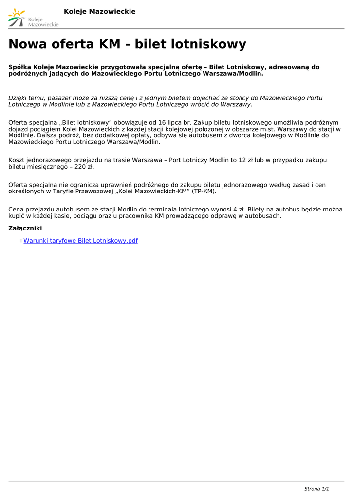 Koleje Mazowieckie Nowa oferta KM - bilet lotniskowy Spółka Koleje Mazowieckie przygotowała specjalną ofertę – Bilet Lotniskowy, adresowaną do podróżnych jadących do Mazowieckiego Portu Lotniczego Warszawa/Modlin. Dzięki temu, pasażer może za niższą cenę i z jednym biletem dojechać ze stolicy do Mazowieckiego Portu Lotniczego w Modlinie lub z Mazowieckiego Portu Lotniczego wrócić do Warszawy. Oferta specjalna „Bilet lotniskowy” obowiązuje od 16 lipca br. Zakup biletu lotniskowego umożliwia podróżnym dojazd pociągiem Kolei Mazowieckich z każdej stacji kolejowej położonej w obszarze m.st. Warszawy do stacji w Modlinie. Dalsza podróż, bez dodatkowej opłaty, odbywa się autobusem z dworca kolejowego w Modlinie do Mazowieckiego Portu Lotniczego Warszawa/Modlin. Koszt jednorazowego przejazdu na trasie Warszawa – Port Lotniczy Modlin to 12 zł lub w przypadku zakupu biletu miesięcznego – 220 zł. Oferta specjalna nie ogranicza uprawnień podróżnego do zakupu biletu jednorazowego według zasad i cen określonych w Taryfie Przewozowej „Kolei Mazowieckich-KM” (TP-KM). Cena przejazdu autobusem ze stacji Modlin do terminala lotniczego wynosi 4 zł. Bilety na autobus będzie można kupić w każdej kasie, pociągu oraz u pracownika KM prowadzącego odprawę w autobusach. Załączniki l Warunki taryfowe Bilet Lotniskowy.pdf Strona 1/1