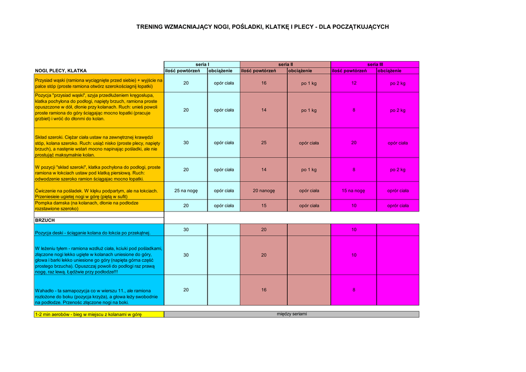 TRENING WZMACNIAJĄCY NOGI, POŚLADKI, KLATKĘ I PLECY - DLA POCZĄTKUJĄCYCH NOGI, PLECY, KLATKA Przysiad wąski (ramiona wyciągnięte przed siebie) + wyjście na palce stóp (proste ramiona otwórz szerokościagnij łopatki) Pozycja "przysiad wąski", szyja przedłużeniem kręgosłupa, klatka pochylona do podłogi, napięty brzuch, ramiona proste opuszczone w dół, dłonie przy kolanach. Ruch: unieś powoli proste ramiona do góry ściągając mocno łopatki (pracuje grzbiet) i wróć do dłonmi do kolan. Skład szeroki. Ciężar ciała ustaw na zewnętrznej krawędzi stóp, kolana szeroko. Ruch: usiąć nisko (proste plecy, napięty brzuch), a nastęnie wstań mocno napinając pośladki, ale nie prostująć maksymalnie kolan. W pozycji "skład szeroki", klatka pochylona do podłogi, proste ramiona w łokciach ustaw pod klatką piersiową. Ruch: odwodzenie szeroko ramion ściągajac mocno łopatki. Ćwiczenie na pośladek. W klęku podpartym, ale na łokciach. Przeniesieie ugietej nogi w górę (piętą w sufit) Pompka damska (na kolanach, dłonie na podłodze rozstawione szeroko) seria I ilość powtórzeń obciążenie ilość powtórzeń seria II obciążenie ilość powtórzeń 20 opór ciała 16 po 1 kg 12 po 2 kg 20 opór ciała 14 po 1 kg 8 po 2 kg 30 opór ciała 25 opór ciała 20 opór ciała 20 opór ciała 14 po 1 kg 8 po 2 kg 25 na nogę opór ciała 20 nanogę opór ciała 15 na nogę oprór ciała 20 opór ciała 15 opór ciała 10 oprór ciała BRZUCH Pozycja deski - ściąganie kolana do łokcia po przekątnej. W leżeniu tyłem - ramiona wzdłuż ciała, kciuki pod pośladkami, złączone nogi lekko ugięte w kolanach uniesione do góry, głowa i barki lekko uniesione go góry (napięta górna część prostego brzucha). Opuszczaj powoli do podłogi raz prawą nogę, raz lewą. Łędźwie przy podłodze!!! Wahadło - ta samapozycja co w wierszu 11., ale ramiona rozlożone do boku (pozycja krzyża), a głowa leży swobodnie na podłodze. Przenośc złączone nogi na boki. 1-2 min aerobów - bieg w miejscu z kolanami w górę seria III obciążenie 30 20 10 30 20 10 20 16 8 między seriami