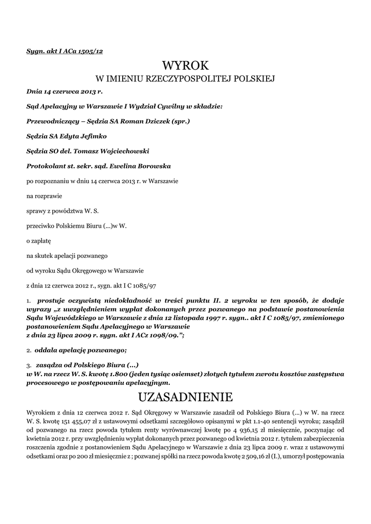 Sygn. akt I ACa 1505/12 WYROK W IMIENIU RZECZYPOSPOLITEJ POLSKIEJ Dnia 14 czerwca 2013 r. Sąd Apelacyjny w Warszawie I Wydział Cywilny w składzie: Przewodniczący – Sędzia SA Roman Dziczek (spr.) Sędzia SA Edyta Jefimko Sędzia SO del. Tomasz Wojciechowski Protokolant st. sekr. sąd. Ewelina Borowska po rozpoznaniu w dniu 14 czerwca 2013 r. w Warszawie na rozprawie sprawy z powództwa W. S. przeciwko Polskiemu Biuru (...)w W. o zapłatę na skutek apelacji pozwanego od wyroku Sądu Okręgowego w Warszawie z dnia 12 czerwca 2012 r., sygn. akt I C 1085/97 1. prostuje oczywistą niedokładność w treści punktu II. 2 wyroku w ten sposób, że dodaje wyrazy „z uwzględnieniem wypłat dokonanych przez pozwanego na podstawie postanowienia Sądu Wojewódzkiego w Warszawie z dnia 12 listopada 1997 r. sygn.. akt I C 1085/97, zmienionego postanowieniem Sądu Apelacyjnego w Warszawie z dnia 23 lipca 2009 r. sygn. akt I ACz 1098/09.”; 2. oddala apelację pozwanego; 3. zasądza od Polskiego Biura (...) w W. na rzecz W. S. kwotę 1.800 (jeden tysiąc osiemset) złotych tytułem zwrotu kosztów zastępstwa procesowego w postępowaniu apelacyjnym. UZASADNIENIE Wyrokiem z dnia 12 czerwca 2012 r. Sąd Okręgowy w Warszawie zasadził od Polskiego Biura (...) w W. na rzecz W. S. kwotę 151 455,07 zł z ustawowymi odsetkami szczegółowo opisanymi w pkt 1.1-40 sentencji wyroku; zasądził od pozwanego na rzecz powoda tytułem renty wyrównawczej kwotę po 4 936,15 zł miesięcznie, poczynając od kwietnia 2012 r. przy uwzględnieniu wypłat dokonanych przez pozwanego od kwietnia 2012 r. tytułem zabezpieczenia roszczenia zgodnie z postanowieniem Sądu Apelacyjnego w Warszawie z dnia 23 lipca 2009 r. wraz z ustawowymi odsetkami oraz po 200 zł miesięcznie z ; pozwanej spółki na rzecz powoda kwotę 2 509,16 zł (I.), umorzył postępowania tytułem renty na zwiększone potrzeby, poczynając od stycznia 1997 r. do dnia zapłaty; oddalił powództwo w pozostałej części i orzekł o kosztach procesu. Sąd Okręgowy przedmiotowym wyrokiem orzekał o żądaniu powoda w części wcześniej nie rozstrzygniętej, tj. o żądaniu zasądzenia renty z tytułu utraconych zarobków w kwotach stanowiących 4,6 krotność przeciętnego wynagrodzenia miesięcznego w danym kwartale, ogłaszanego przez GUS, wskazanych w piśmie procesowym z dnia 30 kwietnia 2012 r. przy uwzględnieniu wypłaconych kwot oraz na przyszłość i o żądaniu zasądzenia renty z tytułu zwiększonych potrzeb w kwotach po 2000 zł miesięcznie poczynając od stycznia 1997 r., a następnie po 2500 zł miesięcznie poczynając od stycznia 2000 r., po 3000 zł miesięcznie od stycznia 2004 r. i po 3500 zł miesięcznie od marca 2009 r. i na przyszłość. Sąd ten ustalił, że w dniu 17 października 1996 r. W. S. uległ wypadkowi komunikacyjnemu, którego sprawcą był obywatel Rumunii, a pojazd był ubezpieczony w zakresie oc obowiązującym w Polsce. Powód został przewieziony do szpitala po rozpoznaniu złamania lewej kości udowej, krwiaka powłok brzucha, złamania żeber po lewej stronie, wstrząśnienia mózgu. Przebywał w szpitalu w K. od 17 X 1996 r. do 9 listopada 1996 r., a następnie w W. od 14 maja 1997 r. do 6 lipca 1997 r. W czasie tego ostatniego pobytu rozpoznano u niego przepukliny pourazowe powłok brzusznych; wówczas też dokonano u niego przeszczepu kostnego talerza biodrowego. Trzeci pobyt w szpitalu miał miejsce w okresie 16 października 1997 r. do 4 grudnia 1997 r. z powodu zaburzenia zrostu kości udowej lewej, a czwarty od 4 lutego 1998 r. do 4 marca 1998 r. Powód poza urazami szczegółowo opisanymi przez Sąd pierwszej instancji utracił zdolność do pracy zarobkowej, ale nie wymagał opieki osób trzecich. U powoda stwierdzono m.in. 30% uszczerbku w związku ze złamaniem uda lewego, 10% uszczerbku z powodu pobrania przeszczepu z talerza biodrowego, 5% uszczerbku z powodu złamania żeber; z powodu obrażeń neurologicznych stwierdzono 30% uszczerbek na zdrowiu, a z powodu zaburzeń psychicznych i neurologicznych - 75 - 80% uszczerbku na zdrowiu. Łączny uszczerbek na zdrowiu u powoda wynosi 175- 180%. Sąd Okręgowy wskazał jakie kwoty zostały wypłacone powodowi w poszczególnych okresach przez ZUS z tytułu niezdolności do pracy; było to łącznie 91 935,46 zł. Ustalił także, że w okresie od 1997 r. do końca marca 2012 r. pozwany wypłacił powodowi tytułem renty tymczasowej kwotę 409 600 zł. Powód od maja 1994 r. do stycznia 1997 r. prowadził w R. działalność gospodarczą w zakresie naprawy i regeneracji układów wydechowych silników samochodowych, zatrudniał jednego pracownika, wynajmował lokal. Zarabiał miesięcznie ok. 2700 zł. Sąd pierwszej instancji przyjął, przy uwzględnieniu kwot tymczasowo wypłaconych powodowi w związku z udzielonym zabezpieczeniem, że w okresie od października 1996 r. do 31 marca 2012 r. uzyskałby z tytułu prowadzonej działalności łączny dochód 151 455,07 zł, przy uwzględnieniu przeciętnego wynagrodzenia w poszczególnych okresach i mnożnika 2,14. W zakresie pomocy osób trzecich, rehabilitacji i przyjmowania leków Sąd Okręgowy uznał za udowodnione wydatki w wysokości po 200 zł miesięcznie. Zdaniem Sądu pierwszej instancji żądanie zasadzenia renty mało co do zasady oparcie w dyspozycji art. 444 § 2 k.c., a kwotą podlegająca zasądzeniu powinna być kwota 151 455,07 zł za okres do 1 marca 2012 r., tj. do wydania opinii przez biegłego sądowego. Od kwietnia 2012 r. za właściwą kwotę renty z tytułu utraconych zarobków Sąd uznał kwotę 4 936,15 zł miesięcznie, przy uwzględnieniu wypłat tytułem zabezpieczenia. Kwota zasądzona miała oparcie w dyspozycji art. 444 § 2 k.c. i art. 361 § 2 k.c. Sąd odwołał si do mnożnika 2,14 i danych statystycznych o wysokości miesięcznego przeciętnego wynagrodzenia. Przy czym pomniejszył tak uzyskane kwoty o rentę z ZUS. Odwołał się także do opinii biegłeg