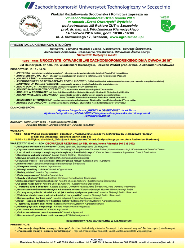 Wydział Kształtowania Środowiska i Rolnictwa zaprasza na VII Zachodniopomorski Dzień Dzień Owada 2016 w ramach „Drzwi Otwartych” Otwartych” Wydział Wydziału pod patronatem JM Rektora ZUT w Szczecinie prof. dr. dr. hab. inż inż. Wł Włodzimierza Kiernoż Kiernożyckiego 14 czerwca 2016 roku, godz. 10:00 - 16:00 ul. J. Słowackiego 17, Szczecin, www.agro.zut.edu.pl PREZENTACJA KIERUNKÓW STUDIÓW: Rolnictwo, Technika Rolnicza i Leśna, Ogrodnictwo, Ochrona Środowiska, Architektura Krajobrazu, Gospodarka Przestrzenna, Odnawialne Źródła Energii NOWOŚĆ: Medycyna Roślin 10:00 – 10:15 UROCZYSTE OTWARCIE „VII ZACHODNIOPOMORSKIEGO DNIA OWADA 2016” 2016” JM Rektor prof. dr hab. inż. Włodzimierz Kiernożycki, Dziekan WKŚiR prof. dr hab. Aleksander Brzóstowicz EKSPOZYCJE: 10:15 – 16:00 • „PP-TERRA - egzotyczny świat w terrarium” - ekspozycja żywych zwierząt z kolekcji Pawła Petrykowskiego • „MINISTERSTWO MOTYLI” - ekspozycja egzotycznych owadów z kolekcji Jacka Pałasiewicza (Poznań) • „OWADY LEŚNE” - Nadleśnictwo Trzebież • „ENERGOROWERY ORAZ WARSZTATY RECYKLINGOWE” - OSTOJA Ośrodek szkoleniowo - badawczy w zakresie energii odnawialnej • „ANTYMUCHA” Mateusz Paździurek - ekspozycja owadów tropikalnych i roślin owadożernych • „NOCNI ŁOWCY” - Akademickie Koło Chiropterologiczne PTOP Salamandra • „KOLEKCJA ROŚLIN OWADOŻERNYCH” - Studenckie Koło Entomologów i Terrarystów • „ROŚLINY W PROBÓWCE” - dr hab. inż. Danuta Kulpa, Katedra Genetyki, Hodowli i Biotechnologii Roślin • „OWADY W SŁUŻBIE CZŁOWIEKA” - prezentacja owadów użytkowych i sprzętu pszczelarskiego: Jerzy Grabski - Mistrz dyplomowany, Instruktor matek pszczelich • „NIEZBĘDNIK ENTOMOLOGA” - pokaz sprzętu entomologicznego, Studenckie Koło Entomologów i Terrarystów • „HOTELE DLA OWADÓW” - ochrona owadów w praktyce, Studenckie Koło Entomologów i Terrarystów DLA KONESERÓW: Wystawa fotograficzna „OWADY W OBIEKTYWIE” OBIEKTYWIE” Jacek Mazur Wystawa Fotograficzna „NOCNI ŁOWCY” OWCY” Magdalena Dzięgielewska, Karolina Ignaszak LEPIDOPTERARIUM ZABAWY I KONKURSY 10:00 – 15:00 (parking WKŚiR) : „Owadzie tatuaże” „Owadzi omnibus” „Owadzi kamuflaż” WYKŁADY: 11:50 – 12:30 Wykład dla młodzieży i dorosłych „Wykorzystanie owadó owadów i bezkrę bezkręgowcó gowców w medycynie i terapii” terapii” dr hab. inż. Arkadiusz Telesiński (parter, sala 58) 11:50 – 12:30 Wykład dla dzieci „Uzbrojone i niebezpieczne” niebezpieczne” dr inż. Grażyna Kaup (parter, Aula Auditorium Maximum) WARSZTATY 10:00 – 15:00 (OBOWIĄ OBOWIĄZUJE REZERWACJA TEL. dr hab. Iwona Adamska 501 335 052): „Budujemy eko-hotele dla owadów” Cezary Ignaszak, Stowarzyszenie „Za Horyzont” „Czy znasz to drzewo?” Koło Naukowe Dendrologów i Projektantów Terenów Zieleni; Katedra Meteorologii i Kształtowania Terenów Zieleni „Lecznicze i kosmetyczne wykorzystanie wybranych roślin łąkowych” Katedra Gleboznawstwa, Łąkarstwa i Chemii Środowiska „Bezpieczny wybuch wulkanu” Zakład Chemii Ogólnej i Ekologicznej „Barwne związki chemiczne” Zakład Chemii Ogólnej i Ekologicznej „Fizyka na wesoło – nie taki diabeł straszny jak go malują” Katedra Fizyki i Agrofizyki „Mikrokosmos” Zakład Mikrobiologii i Biotechnologii Środowiska „Warzywne owady” Katedra Ogrodnictwa „Niezwykłe rośliny ozdobne” Katedra Ogrodnictwa „Kwiaty jadalne” Katedra Ogrodnictwa „Zioła przyprawowe” Katedra Ogrodnictwa „Owady wokół nas” Katedra Ekologii, Ochrony i Kształtowania Środowiska „Mikroorganizmy pod mikroskopem” Katedra Ekologii, Ochrony i Kształtowania Środowiska „Co jedzą nasze rybki” Katedra Ekologii, Ochrony i Kształtowania Środowiska „Tworzymy cuda z odpadów” Katedra Ekologii, Ochrony i Kształtowania Środowiska, Koło Ochrony środowiska „Rozmnażanie roślin owadożernych w kulturach in vitro” Katedra Genetyki, Hodowli i Biotechnologii Roślin „Enzymy w organizmie człowieka, czyli jak trawimy spożywane pokarmy” Katedra Fizjologii Roślin i Biochemii „Widzialne niewidzialne – sekretne kształty i barwy roślin” Katedra Fizjologii Roślin i Biochemii „Krowa – pokaz i konkurs doju” Katedra Inżynierii Systemów Agrotechnicznych „Robot – jazda po trajektorii w kształcie motyla” Katedra Inżynierii Systemów Agrotechnicznych „Tajemniczy świat w skali mikro” Katedra Inżynierii Systemów Agrotechnicznych „Podstawy rysunku odręcznego” Katedra Projektowania Krajobrazu „Od ziarenka do bochenka” Katedra Agronomii „Co i po co rośnie na polach uprawnych” Katedra Agronomii „Różnorodność gatunkowa roślin uprawnych” Katedra Agronomii SZCZEGÓŁOWY PLAN WARSZTATÓW W ZAŁĄCZNIKU!!! PREZENTACJE: „Prezentacja ciągników i maszyn rolniczych” dla dzieci i młodzieży - Katedra Budowy i Użytkowania Urządzeń Technicznych (Hala Maszyn) „Prezentacja maszyn i sprzętu ogrodniczego” – mgr inż. Przemysław Tomczak; Jacek Jabłonowski (Hala wegetacyjna) KONTAKT: Magdalena Dzięgielewska tel. 91 449 63 83; Grażyna Kaup tel. 91 449 63 13; Iwona Adamska 501 335 052; e-mail: [email protected]