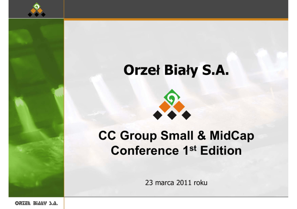 Orzeł Biały S.A. CC Group Small & MidCap Conference 1st Edition 23 marca 2011 roku Podsumowanie 2010 r. Najważniejsze dane finansowe za 2010 r. Przychody ze sprzedaży – 332,2 mln zł EBITDA* – 59,6 mln zł Zysk netto* – 40,7 mln zł Ożywienie na rynku motoryzacyjnym (Liczby sprzedanych i zarejestrowanych samochodów osobowych w 2010 r. wzrosły o odpowiednio 4,2% i 15,6% w stosunku do 2009 r.) Rekordowy rok 2010 oraz IV kwartał pod względem wolumenu przerobionego i sprzedanego ołowiu: 2010 r.: 48,1 tys. ton tj. o 23,4% więcej niż w 2009 r. IV kw.: 13,3 tys. ton tj. o 9,3% więcej niż w analogicznym okresie ubiegłego roku Wzrost średnich cen ołowiu na LME o 25% w 2010 r. / relatywna stabilizacja cen względem 2009 r. * Wynik skorygowany o zdarzenia jednorazowe w postaci utworzenia rezerwy w wysokości blisko 2,8 mln zł na koszty likwidacji majątku, która ma związek z rozpoczęciem planowanych inwestycji 2 Profil Spółki Największy recykler akumulatorów ołowiowych na polskim rynku Produkcja najwyższej jakości ołowiu rafinowanego oraz stopów ołowiu Integracja wiedzy i możliwości technologicznych - zdolność produkcji unikalnych stopów ołowiowych Bezpieczny model biznesu zapewniający stabilną marżę przy wahaniach cen surowców i kursów walut Działalność proekologiczna (certyfikaty ISO 9001:2000, ISO 14001:2004) Możliwość handlu ołowiem bezpośrednio na Londyńskiej Giełdzie Metali (LME) dzięki zarejestrowaniu marki ołowiu pod nazwą EAGLE 9997 Działalność na perspektywicznym rynku ściśle powiązanym z sektorem motoryzacji; oczekiwany wzrost zapotrzebowania na ołów rafinowany 3 Model biznesowy Pozyskanie surowca Magazynowanie surowca Cykl produkcyjny – recycling Produkcja polipropylenu i produktów z polipropylenu Wytop ołowiu - HUTA 6 miesięcy Rozdział złomu akumulatorowego - BREAKER Cykl obrotu Rafinacja – RAFINERIA Sprzedaż Dostawa Zmiany cen ołowiu na LME przekładają się zarówno na zmiany cen sprzedawanego ołowiu przez spółkę, jak i zmiany cen zakupywanych surowców. Marża – w średnim i długim terminie większy wpływ na marżę ma wolumen przerobionych i sprzedanych produktów niż poziom cen ołowiu na LME 4 Wolumeny sprzedaży produktów Wolumeny sprzedaży ołowiu rafinowanego i polipropylenu 1Q 2009 – 4Q 2010 (dane w tonach) 38986 48111 14000 12160 12000 10000 11754 10053 8455 8318 1Q 09 2Q 09 8000 12561 13287 10509 Zarówno IV kwartał 2010 r., jak i cały 2010 r. były rekordowe pod względem wolumenu przerobionego i sprzedanego ołowiu rafinowanego TOP 6 wśród europejskich hut dedykowanych do przetopu ołowiu pochodzącego z recyklingu 6000 4000 2000 0 3Q 09 4Q 09 1Q 10 2Q 10 3Q 10 4Q 10 Wolumeny sprzedaży ołowiu rafinowanego (t) 1000 800 835 682 733 694 654 600 602 737 354 400 200 0 1Q 09 2Q 09 3Q 09 4Q 09 1Q 10 2Q 10 3Q 10 4Q 10 Wolumeny sprzedaży polipropylenu (t) Wysoka sprzedaż produktów z polipropylenu – w tym sezonie ponad 130 tys. sprzedanych łopat do odśnieżania oraz 285 tys. wiader budowlanych 5 Tendencje rynkowe Ożywienie na rynku motoryzacyjnym: Liczba wyprodukowanych akumulatorów: w 2010 r. wyprodukowano 7697 tys. akumulatorów, czyli o ponad 27% więcej niż w roku poprzednim* Liczba sprzedanych i zarejestrowanych samochodów osobowych w 2010 r. wyniosła odpowiednio 333,5 tys. i 315,1 tys., co oznacza wzrost o 4,2% i 15,6% w stosunku do 2009 r.** Restrykcyjna polityka ochrony środowiska prowadzona przez UE – dalsze zaostrzenia m. in. poprzez Komisję Helsińską (HELCOM) oraz Decyzje UE Tendencje konsolidacyjne na globalnym rynku recyklingu akumulatorów – zarówno w układzie poziomym, jak i pionowym Wyścig światowych recyklerów w zakresie inwestycji innowacyjnych – szczególnie w zakresie innowacji redukujących koszty procesu oraz poprawiających ochronę środowiska, a także dostosowujących stopy ołowiu do potrzeb akumulatorów „start & stop” 6 * Źródło: GUS ** na podstawie danych ACEA i IBRM Samar Dobre perspektywy rynku Produkcja akumulatorów kwasowo-ołowiowych w Polsce (w ‘000 sztuk) 10000 6289 6045 2008 2009 Rosnąca produkcja akumulatorów… 7697 5000 0 Źródło: Dane GUS …z perspektywami wzrostu, co odzwierciedla oczekiwane zwiększenie zapotrzebowania na ołów rafinowany 2010 Konsumpcja ołowiu rafinowanego w Polsce w latach 2003-2011 (dane w ‘000 ton) 120 100 80 60 40 20 0 73 81 87 84 2003 2004 2005 2006 Źródła: Lead Monitor, styczeń 2011 101 99 2007 2008 82 2009 105 110 2010 2011 Prognoza 7 Wzrost udziału Spółki w polskim rynku ołowiu 2006 r. Orzeł Biały S.A. 2010 r. Orzeł Biały S.A. Dane IGMNiR, raporty okresowe spółek giełdowych, 2010 - wg danych za 9 m-cy 2010. 8 Dobre perspektywy rynku Dynamika rejestracji nowych samochodów (rok 2006 = 100, Źródło Eurostat) Liczba samochodów zarejestrowanych w Polsce Legenda: (w ‘000 sztuk) 25000 20000 15000 14367 14644 15777 2004 2005 2006 17110 18790 19292 2008 2009 10000 5000 0 2007 Liczba samochodów na 100 mieszkańców w 2008 r. Polski rynek samochodów 70 60 nie jest nasycony w 50 porównaniu do krajów 40 30 Europy Zachodniej 20 53 55 57 62 50 Polska Holandia Niemcy Francja Hiszpania 10 0 9 Strategia rozwoju Zwiększanie udziału wysoko przetworzonych produktów, zapewniających najwyższą premię handlową (nowoczesne stopy do zaawansowanych technologicznie pojazdów) oraz zwiększających bezpieczeństwo współpracy z kontrahentami Nowe homologacje produktów „upper market” na rynki zachodnioeuropejskie Dalsza redukcja kosztów zmiennych poprzez 3letni plan inwestycyjny Zwiększanie wydajności pracy (utrzymanie zatrudnienia przy wzroście produkcji) Budowa magazynu wyrobów gotowych (dostawy just in time dla klientów Spółki) 10 Wyniki finansowe 2008 – 2010 Przychody ze sprzedaży (w mln zł) 350 300 332,2 263,4 198,5 250 200 150 100 50 0 2008 dane skonsolidowane (w mln zł) Zysk operacyjny Zysk netto 2009 2010 2008 2009 2010 2009 / 2010 Zmiana 4