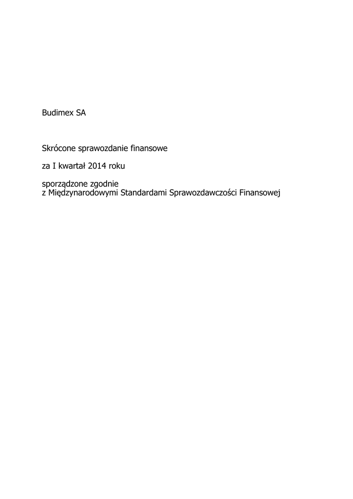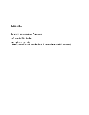 Budimex SA Skrócone sprawozdanie finansowe za I kwartał 2014 roku sporządzone zgodnie z Międzynarodowymi Standardami Sprawozdawczości Finansowej BUDIMEX SA Skrócone sprawozdanie finansowe za I kwartał 2014 roku sporządzone zgodnie z MSSF Sprawozdanie z sytuacji finansowej 31.03.2014 31.12.2013 1.01.2013 (tys. zł) (tys. zł) 58 383 62 713 84 079 Nieruchomości inwestycyjne 1 898 3 124 3 368 Wartości niematerialne 3 557 2 886 1 210 712 940 712 940 763 401 9 796 9 796 18 596 8 470 8 445 21 498 30 395 29 813 25 919 (tys. zł) Aktywa trwałe (długoterminowe) Rzeczowe aktywa trwałe Inwestycje w podmiotach zależnych Inwestycje w podmiotach stowarzyszonych Inne aktywa finansowe Kaucje z tytułu umów o budowę Długoterminowe rozliczenia międzyokresowe Aktywa z tytułu odroczonego podatku dochodowego Aktywa trwałe (długoterminowe) ogółem 4 379 4 392 4 096 317 655 320 564 293 757 1 147 473 1 154 673 1 215 924 Aktywa obrotowe (krótkoterminowe) Zapasy 111 042 84 850 118 793 Należności z tytułu dostaw i usług oraz pozostałe należności 384 950 461 292 332 423 Kaucje z tytułu umów o budowę Kwoty należne od obiorców z tytułu umów o budowę Należności z tytułu bieżącego podatku dochodowego 27 213 29 850 67 211 144 435 137 441 222 889 - - 651 18 29 1 460 238 600 238 600 - 9 482 3 164 - 820 235 1 112 254 1 038 436 13 645 12 820 8 255 1 749 620 2 080 300 1 790 118 Aktywa obrotowe (krótkoterminowe) ogółem 1 749 620 2 080 300 1 790 118 SUMA AKTYWÓW 2 897 093 3 234 973 3 006 042 Pochodne instrumenty finansowe Inwestycje w jednostkach podporządkowanych Inne aktywa finansowe Środki pieniężne i ich ekwiwalenty Krótkoterminowe rozliczenia międzyokresowe Komisja Nadzoru Finansowego 1 BUDIMEX SA Skrócone sprawozdanie finansowe za I kwartał 2014 roku sporządzone zgodnie z MSSF 31.03.2014 31.12.2013 1.01.2013 (tys. zł) (tys. zł) (tys. zł) 145 848 145 848 145 848 Nadwyżka ze sprzedaży akcji powyżej ich wartości nominalnej 80 199 80 199 227 835 Pozostałe kapitały rezerwowe 58 867 58 867 56 899 Kapitał własny Kapitał podstawowy Różnice kursowe z przeliczenia oddziałów zagranicznych 5 505 5 486 5 492 313 935 297 435 (42 573) 604 354 587 835 393 501 14 531 17 044 27 740 Kaucje z tytułu umów o budowę 150 717 152 294 155 387 Rezerwy na zobowiązania długoterminowe i inne obciążenia 126 049 125 307 113 930 Zobowiązania z tytułu świadczeń emerytalnych i podobnych 3 264 3 264 2 542 294 561 297 909 299 599 Zyski/ (straty) zatrzymane Kapitał własny ogółem Zobowiązania Zobowiązania długoterminowe Kredyty, pożyczki i inne zewnętrzne źródła finansowania Zobowiązania długoterminowe ogółem Zobowiązania krótkoterminowe Kredyty, pożyczki i inne zewnętrzne źródła finansowania 18 389 18 165 17 695 Zobowiązania z tytułu dostaw i usług oraz pozostałe zobowiązania 834 891 1 115 719 1 202 122 Kaucje z tytułu umów o budowę 162 980 179 697 218 454 Kwoty należne odbiorcom z tytułu umów o budowę 610 902 688 159 549 447 Otrzymane zaliczki Rezerwy na zobowiązania krótkoterminowe i inne obciążenia Zobowiązania z tytułu bieżącego podatku dochodowego Zobowiązania z tytułu świadczeń emerytalnych i podobnych Pochodne instrumenty finansowe 70 273 59 346 55 341 127 969 115 746 106 757 - 15 478 - 879 879 741 312 440 243 167 696 150 194 156 005 3 887 5 406 6 137 1 998 178 2 349 229 2 312 942 Zobowiązania krótkoterminowe ogółem 1 998 178 2 349 229 2 312 942 Zobowiązania ogółem 2 292 739 2 647 138 2 612 541 SUMA KAPITAŁU WŁASNEGO I ZOBOWIĄZAŃ 2 897 093 3 234 973 3 006 042 Wartość księgowa (tys. zł) Liczba akcji 604 354 587 835 393 501 25 530 098 25 530 098 25 530 098 23,67 23,03 15,41 Krótkoterminowe rozliczenia międzyokresowe kosztów Krótkoterminowe rozliczenia międzyokresowe przychodów Wartość księgowa na jedną akcję (w zł.) Komisja Nadzoru Finansowego 2 BUDIMEX SA Skrócone sprawozdanie finansowe za I kwartał 2014 roku sporządzone zgodnie z MSSF Rachunek zysków i strat Okres 3 miesięcy zakończony 31 marca 2014 roku 2013 roku (tys. zł) (tys. zł) 655 430 674 119 (585 204) (622 784) Zysk brutto ze sprzedaży 70 226 51 335 Koszty sprzedaży (2 555) (2 431) (38 015) (34 037) Działalność kontynuowana Przychody netto ze sprzedaży produktów i usług oraz towarów i materiałów Koszty sprzedanych produktów i usług oraz towarów i materiałów Koszty ogólnego zarządu Pozostałe przychody operacyjne Pozostałe koszty operacyjne Zysk (strata) z pochodnych instrumentów finansowych Zysk z działalności operacyjnej Przychody finansowe 5 804 5 903 (13 954) (5 306) (35) (430) 21 471 15 034 6 161 47 830 Koszty finansowe (5 853) (6 178) Zysk brutto 21 779 56 686 Podatek dochodowy (5 279) (3 810) Zysk netto z działalności kontynuowanej 16 500 52 876 - - 16 500 52 876 0,65 2,07 Zysk (strata) netto z działalności zaniechanej Zysk netto za okres Podstawowy i rozwodniony zysk przypadający akcjonariuszom na akcję (w zł.) Komisja Nadzoru Finansowego 3 BUDIMEX SA Skrócone sprawozdanie finansowe za I kwartał 2014 roku sporządzone zgodnie z MSSF Sprawozdanie z całkowitych dochodów Okres 3 miesięcy zakończony 31 marca 2014 roku 2013 roku (tys. zł) (tys. zł) 16 500 53 291 - (415) 16 500 52 876 19 51 - - Zyski (straty) aktuarialne - - Podatek odroczony dotyczący składników innych całkowitych dochodów, które nie zostaną następnie przeklasyfikowane na zyski lub straty - - 19 51 16 519 52 927 Zysk netto wykazany poprzednio Korekty MSSF Zysk netto za okres wg MSSF Inne całkowite dochody, które: Zostaną następnie przeklasyfikowane na zyski lub straty po spełnieniu określonych warunków: Różnice kursowe z wyceny oddziałów zagranicznych Podatek odroczony dotyczący składników innych całkowitych dochodów, które zostaną następnie przeklasyfikowane na zyski lub straty Nie zostaną następnie przeklasyfikowane na zyski lub straty: Inne całkowite dochody netto Całkowite dochody za okres Ko