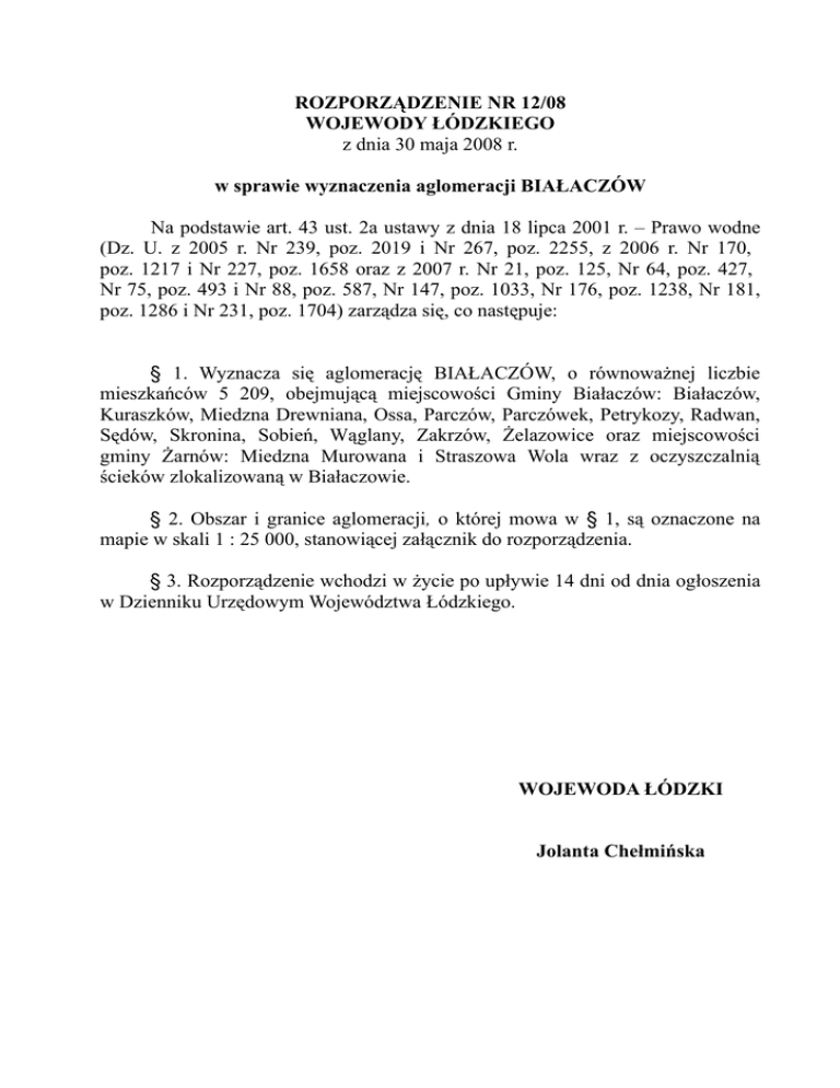 ROZPORZĄDZENIE NR 12/08 WOJEWODY ŁÓDZKIEGO z dnia 30 maja 2008 r. w sprawie wyznaczenia aglomeracji BIAŁACZÓW Na podstawie art. 43 ust. 2a ustawy z dnia 18 lipca 2001 r. – Prawo wodne (Dz. U. z 2005 r. Nr 239, poz. 2019 i Nr 267, poz. 2255, z 2006 r. Nr 170, poz. 1217 i Nr 227, poz. 1658 oraz z 2007 r. Nr 21, poz. 125, Nr 64, poz. 427, Nr 75, poz. 493 i Nr 88, poz. 587, Nr 147, poz. 1033, Nr 176, poz. 1238, Nr 181, poz. 1286 i Nr 231, poz. 1704) zarządza się, co następuje: § 1. Wyznacza się aglomerację BIAŁACZÓW, o równoważnej liczbie mieszkańców 5 209, obejmującą miejscowości Gminy Białaczów: Białaczów, Kuraszków, Miedzna Drewniana, Ossa, Parczów, Parczówek, Petrykozy, Radwan, Sędów, Skronina, Sobień, Wąglany, Zakrzów, Żelazowice oraz miejscowości gminy Żarnów: Miedzna Murowana i Straszowa Wola wraz z oczyszczalnią ścieków zlokalizowaną w Białaczowie. § 2. Obszar i granice aglomeracji, o której mowa w § 1, są oznaczone na mapie w skali 1 : 25 000, stanowiącej załącznik do rozporządzenia. § 3. Rozporządzenie wchodzi w życie po upływie 14 dni od dnia ogłoszenia w Dzienniku Urzędowym Województwa Łódzkiego. WOJEWODA ŁÓDZKI Jolanta Chełmińska UZASADNIENIE do rozporządzenia Wojewody Łódzkiego w sprawie wyznaczenia aglomeracji BIAŁACZÓW W celu wypełnienia zobowiązań Rzeczypospolitej Polskiej, przyjętych w Traktacie Akcesyjnym Polski do Unii Europejskiej, w części dotyczącej dyrektywy 91/271/EWG w sprawie oczyszczania ścieków komunalnych, został sporządzony przez Ministerstwo Środowiska, a następnie zatwierdzony przez rząd RP w dniu 16 grudnia 2003 r., Krajowy program oczyszczania ścieków komunalnych (KPOŚK), który określa plan inwestycyjny w dziedzinie gospodarki wodno-ściekowej, jaki musi zostać zrealizowany przez Polskę, aby osiągnąć wymagane efekty ekologiczne. Program ten zawiera wykaz aglomeracji oraz niezbędnych przedsięwzięć w zakresie budowy, rozbudowy i/lub modernizacji zbiorczych sieci kanalizacyjnych oraz oczyszczalni ścieków komunalnych, także terminy ich realizacji dla wywiązania się z zobowiązań wobec Unii Europejskiej. Ustawa z dnia 18 lipca 2001 r. Prawo wodne (Dz. U. z 2005 r. Nr 239, poz. 2019 ze zm.) wprowadziła w art. 43 ust. 2 definicję aglomeracji, czyli terenu, na którym zaludnienie lub działalność gospodarcza są wystarczająco skoncentrowane, aby ścieki komunalne były zbierane i przekazywane do oczyszczalni ścieków komunalnych. Aglomeracje o wielkości powyżej 2000 równoważnych mieszkańców powinny być wyposażone zgodnie z ww. ustawą w kanalizację i oczyszczalnie ścieków. Artykuł 43 ust. 2a ustawy Prawo wodne z dnia 18 lipca 2001 r. zobowiązuje wojewodów do wyznaczania granic i obszarów aglomeracji, wykazanych w KPOŚK, w drodze aktu prawa miejscowego, po zasięgnięciu opinii zarządu województwa i zainteresowanych gmin. Z dniem 1 stycznia 2005 r. weszło w życie rozporządzenie Ministra Środowiska z dnia 22 grudnia 2004 r. w sprawie sposobu wyznaczania obszaru i granic aglomeracji ( Dz. U. Nr 283, poz. 2841 oraz z 2006 r. Nr 199, poz. 1468), które określa sposób postępowania przy ich wyznaczaniu. Przy piśmie z dnia 14 kwietnia 2008 roku Wójt Gminy Białaczów przedłożył do Wojewody projekt planu aglomeracji pod nazwą „Projekt planu aglomeracji „Białaczów”. Projekt planu, po zweryfikowaniu przez Wojewodę, pod kątem spełnienia wymogów określonych w rozporządzeniu Ministra Środowiska z dnia 22 grudnia 2004 r., został zgodnie z § 4. ust. 2 cyt. wyżej rozporządzenia, pozytywnie zaopiniowany Uchwałą Nr 700/08 Zarządu Województwa Łódzkiego z dnia 21 maja 2008 roku, Uchwałą Nr XV/102/2008 Rady Gminy Białaczów z dnia 26 maja 2008 roku oraz Uchwałą Nr XVII/82/2008 Rady Gminy Żarnów z dnia 23 maja 2008 roku. Aglomeracja Białaczów położona jest na terenie gminy Białaczów i części gminy Żarnów w powiecie opoczyńskim, w południowo - wschodniej części województwa łódzkiego. Łączna powierzchnia Gminy Białaczów wynosi 114 km2, a dwóch obrębów z Gminy Żarnów 1,01 km2. Gmina Białaczów posiada walory i możliwości rozwoju turystyki oraz agroturystyki mogące pozytywnie wpływać na jej rozwój gospodarczy. Posiada również dobrze rozwiniętą siecią dróg. W jej skład wchodzą: droga wojewódzka nr 726 Rawa Mazowiecka - Żarnów oraz drogi powiatowe o łącznej długości 49,52 km i drogi gminne o łącznej długości 40,12 km. W skład aglomeracji Białaczów wchodzi 14 miejscowości z gminy Białaczów: Białaczów, Kuraszków, Miedzna Drewniana, Ossa, Parczów, Parczówek, Petrykozy, Radwan, Sędów, Skronina, Sobień, Wąglany, Zakrzów, Żelazowice oraz dwie miejscowości z terenu gminy Żarnów: Miedzna Murowana i Straszowa Wola. Na obszarze objętym zakresem planowanej rozbudowy systemu kanalizacji sanitarnej na stałe zamieszkuje 6 825 osób. Istniejące gospodarstwa agroturystyczne świadczą obsługę całoroczną. Łącznie zapewniają kwatery dla 25 osób na dobę. Stanica Harcerska położona w miejscowości Miedzna Drewniana w bezpośrednim sąsiedztwie zbiornika „Miedzna”, w okresie maj - wrzesień w organizowanych turnusach, przyjmuje 120 osób na dobę. Powyższe założenia pozwalają na określenie liczby turystów na około 145 osób na dobę. Ponadto wieloletnie prognozy szacunkowe uwzględniające zapisy Planu Zagospodarowania Przestrzennego Gminy i Studium Uwarunkowań i Kierunków Zagospodarowania Przestrzennego pozwalają na przyłączenie do sieci kanalizacji sanitarnej 1 626 działek, co w efekcie końcowym daje zwiększenie liczby osób korzystających z sieci kanalizacji sanitarnej o 5 691 osób. Zakłady przemysłowe i większe zakłady pracy skupione są głównie w miejscowościach Parczówek, Żelazowice, Petrykozy, Miedzna Drewniana, Białaczów. Zakłady przemysłowe odprowadzają ścieki o charakterze komunalnym. Łączna ilość ścieków dowo