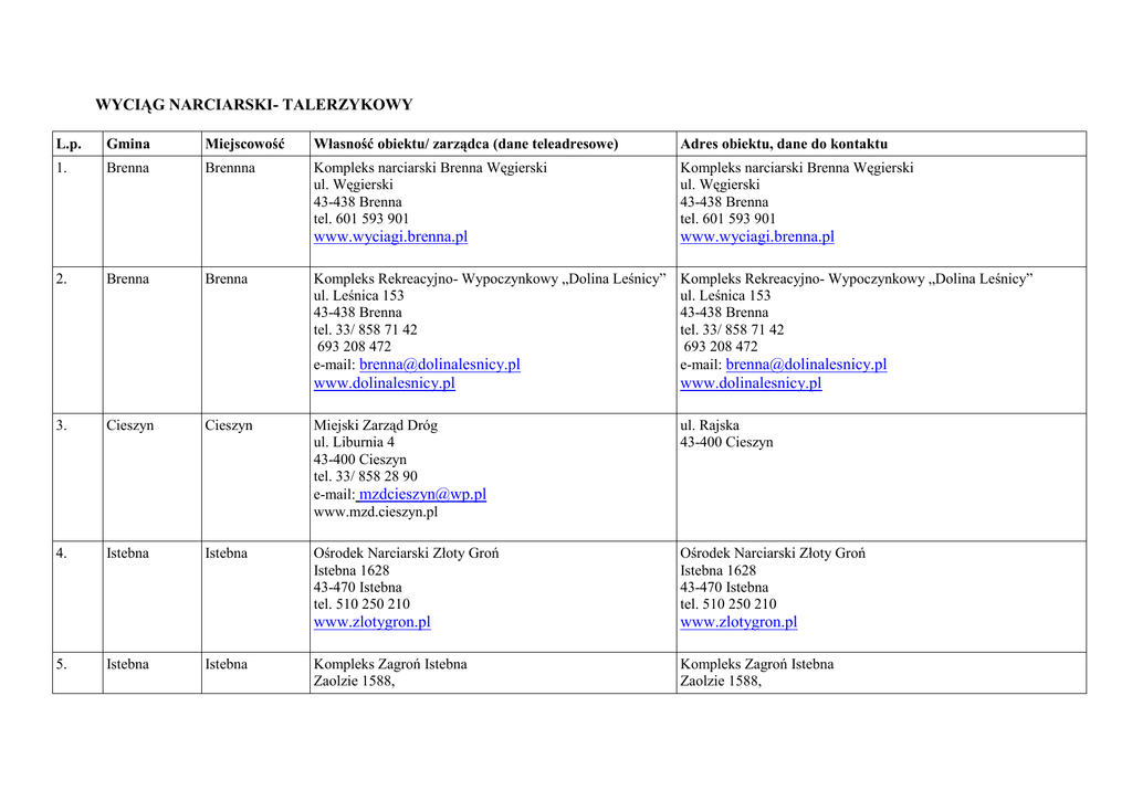 WYCIĄG NARCIARSKI- TALERZYKOWY L.p. Gmina Miejscowość Własność obiektu/ zarządca (dane teleadresowe) Adres obiektu, dane do kontaktu 1. Brenna Brennna Kompleks narciarski Brenna Węgierski ul. Węgierski 43-438 Brenna tel. 601 593 901 Kompleks narciarski Brenna Węgierski ul. Węgierski 43-438 Brenna tel. 601 593 901 www.wyciagi.brenna.pl www.wyciagi.brenna.pl Kompleks Rekreacyjno- Wypoczynkowy „Dolina Leśnicy” ul. Leśnica 153 43-438 Brenna tel. 33/ 858 71 42 693 208 472 e-mail: [email protected] Kompleks Rekreacyjno- Wypoczynkowy „Dolina Leśnicy” ul. Leśnica 153 43-438 Brenna tel. 33/ 858 71 42 693 208 472 e-mail: [email protected] www.dolinalesnicy.pl www.dolinalesnicy.pl 2. Brenna Brenna 3. Cieszyn Cieszyn Miejski Zarząd Dróg ul. Liburnia 4 43-400 Cieszyn tel. 33/ 858 28 90 e-mail: [email protected] www.mzd.cieszyn.pl ul. Rajska 43-400 Cieszyn 4. Istebna Istebna Ośrodek Narciarski Złoty Groń Istebna 1628 43-470 Istebna tel. 510 250 210 Ośrodek Narciarski Złoty Groń Istebna 1628 43-470 Istebna tel. 510 250 210 www.zlotygron.pl www.zlotygron.pl Kompleks Zagroń Istebna Zaolzie 1588, Kompleks Zagroń Istebna Zaolzie 1588, 5. Istebna Istebna 43-470 Istebna tel. 33/ 483 20 34 e-mail:[email protected] 43-470 Istebna tel. 33/ 483 20 34 e-mail:[email protected] www.istebna.org www.istebna.org „Szus” Koniaków 680 43-474 Koniaków tel. 516 858 906 e-mail: [email protected] www.szus.com.pl 6. Istebna Koniaków „Szus” Koniaków 680 43-474 Koniaków tel. 516 858 906 e-mail: [email protected] www.szus.com.pl 7. Ustroń Ustroń 5 wyciągów bd 8. Wisła Wisła- Nowa Osada Właściciel: Mariusz Pilch ul. Wypoczynkowa 43-460 Wisła tel: 600 505 455 604 272 509 601 516 849 Beskid ul. Wypoczynkowa 43-460 Wisła tel: 600 505 455 604 272 509 601 516 849 www.wyciag-beskid.pl www.wyciag-beskid.pl Właściciel: Aniela Sikora tel. 33/ 855 36 41 606 581 086 e-mail: [email protected] Bochnia tel. 33/ 855 36 41 606-581-086 e-mail: [email protected] 9. Wisła Wisła- Malinka 10. Wisła Wisła- Centrum Właściciel: Paweł Poloczek ul. Bukowa 16B 43-460 Wisła tel. 33/ 855 24 70 33/ 855 19 93 Bukowa ul. Bukowa 16B 43-460 Wisła tel. 33/ 855 24 70 33/ 855 19 93 11. 12. 13. 14. Wisła Wisła Wisła Wisła Wisła- Malinka 609 752 751 e-mail: [email protected] 609 752 751 e-mail: [email protected] www.noclegiwisla.eu www.noclegiwisla.eu Właściciel: Pensjonat „Ogrodzisko” ul. Malinka 8 43-460 Wisła tel. 33/ 855 36 07 801 006 001 e-mail: [email protected] Cieńków ul. Malinka 8 43-460 Wisła tel. 33/ 855 36 07 801 006 001 e-mail: [email protected] www.cienkownarty.pl www.cienkownarty.pl Wisła- Jawornik Właściciel: Bodeko Hotele Sp. zo.o. ul. Jawornik 52A 43-460 Wisła tel. 33/ 856 41 00 e-mail: [email protected] Wisła- Malinka Wisła Kiczera ul. Jawornik 52A 43-460 Wisła tel. 33/ 856 41 00 e-mail: [email protected] www.hotelstok.pl www.hotelstok.pl Właściciel: Janusz Palion ul. Malinka 43-460 Wisła tel. 504 102 979 e-mail: [email protected] Klepki ul. Malinka 43-460 Wisła tel. 504 102 979 e-mail: [email protected] www.klepki.wisla.pl www.klepki.wisla.pl Własność: Krzysztof Hatlas ul. Malinka 42A 43-460 Wisła tel. 506 056 564 e-mail: [email protected] Na Polanie Extreme ul. Malinka 42A 43-460 Wisła tel. 506 056 564 e-mail: [email protected] 15. 16. 17. Wisła Wisła Wisła Wisła- Czarne Wisła- Nowa Osada Właściciel: Art Jura- Bartek Kalinowski ul. Czarna Wisełka 8 43-460 Wisła tel. 33/ 855 37 15 697 555 097 e-mail: [email protected] Na Przysłopiu ul. Czarna Wisełka 8 43-460 Wisła tel. 33/ 855 37 15 697 555 097 e-mail: [email protected] www.wisla.info.pl www.wisla.info.pl Ośrodek Narciarski NOWA OSADA S.C. ul. Partyzantów 24 43-460 Wisła tel. 33/ 855 92 85 607983768 e-mail: [email protected] Nowa Osada- Wróblonki ul. Partyzantów 24 43-460 Wisła tel. 33/ 855 92 85 607983768 e-mail: [email protected] www.zima.nowaosada.pl www.zima.nowaosada.pl Wisła- Centrum Andrzej Poleczek ul. Partecznik 6 43-460 Wisła tel. 33/ 855 28 50 33/ 855 18 44 e-mail: [email protected] www.partecznik.bo.pl 18. Wisła Wisła- Kopydło Barbara Kędzior tel. 33/ 855 86 22 609 514 813 e-mail: [email protected] www.pasieki.wisla.pl 19. Wisła Wisła- Jawornik Seweryn Kwaśny ul. Cieślarów 15 A Partecznik ul. Partecznik 6 43-460 Wisła tel. 33/ 855 28 50 33/ 855 18 44 e-mail: [email protected] www.partecznik.bo.pl Pasieki tel. 33/ 855 86 22 609 514 813 e-mail: [email protected] www.pasieki.wisla.pl Rowienki ul. Cieślarów 15 A 43-460 Wisła tel. 33/ 855 30 26 606 499 878 e-mail: [email protected] 43-460 Wisła tel. 33/ 855 30 26 606 499 878 e-mail: [email protected] www.rowienki.pl www.rowienki.pl Mirosław Gomola, Mariusz Cieślar ul. Kędziorowska 12 43-460 Wisła tel. 33/ 855 36 25 Sarajewo ul. Kędziorowska 12 43-460 Wisła tel. 33/ 855 36 25 20. Wisła Wisła- Malinka 21. Wisła Wisła- Kopydło Krzysztof Byrt ul. Siglanów 43-460 Wisła tel. 785 046 071 609 828 824 e-mail: [email protected] www.siglany.wisla.pl 22. 23. Wisła Wisła Siglany ul. Siglanów 43-460 Wisła tel. 785 046 071 609 828 824 e-mail: [email protected] www.siglany.wisla.pl Wisła- Jawornik Wagart Warszawa Sp. zo.o. ul. Zawiszy Czarnego 2 40-872 Katowice tel. 32/ 250 62 90 32/ 608 00 28 e- mail: [email protected] www.soszow.pl Soszów ul. Cieślarów 30 43-460 Wisła tel. 33/ 855 28 32 33/ 474 23 95 e- mail: [email protected] Wisła- Łabajów Witold Pruski ul. Zjazdowa 11 43-460 Wisła tel. 33/ 855 32 04 33/ 855 32 52 e-mail: [email protected] Stożek ul. Zjazdowa 11 43-460 Wisła tel. 33/ 855 32 04 33/ 855 32 52 e-mail: [email protected] www.soszow.pl 24. 25. Wisła Wisła Wisła- Głębce Wisła- Malinka www.stozek.narty.pl www.stozek.narty.pl Mirosław Kędzior ul. Głębce 32 D 43-460 Wisła tel. 33/ 855 14 95 602 648 832 e-mail: [email protected] Zajazd Głębce ul. Głębce 32 D 43-460 Wisła tel. 33/ 855 14 95 602 648 832 e-mail: [email protected] www.zajazdglebce.pl www.zajazdglebce.pl Władys