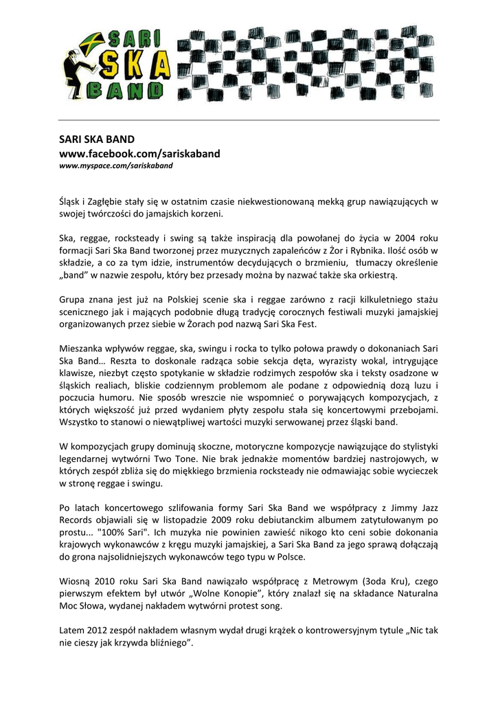 SARI SKA BAND www.facebook.com/sariskaband www.myspace.com/sariskaband Śląsk i Zagłębie stały się w ostatnim czasie niekwestionowaną mekką grup nawiązujących w swojej twórczości do jamajskich korzeni. Ska, reggae, rocksteady i swing są także inspiracją dla powołanej do życia w 2004 roku formacji Sari Ska Band tworzonej przez muzycznych zapaleńców z Żor i Rybnika. Ilość osób w składzie, a co za tym idzie, instrumentów decydujących o brzmieniu, tłumaczy określenie „band” w nazwie zespołu, który bez przesady można by nazwać także ska orkiestrą. Grupa znana jest już na Polskiej scenie ska i reggae zarówno z racji kilkuletniego stażu scenicznego jak i mających podobnie długą tradycję corocznych festiwali muzyki jamajskiej organizowanych przez siebie w Żorach pod nazwą Sari Ska Fest. Mieszanka wpływów reggae, ska, swingu i rocka to tylko połowa prawdy o dokonaniach Sari Ska Band… Reszta to doskonale radząca sobie sekcja dęta, wyrazisty wokal, intrygujące klawisze, niezbyt często spotykanie w składzie rodzimych zespołów ska i teksty osadzone w śląskich realiach, bliskie codziennym problemom ale podane z odpowiednią dozą luzu i poczucia humoru. Nie sposób wreszcie nie wspomnieć o porywających kompozycjach, z których większość już przed wydaniem płyty zespołu stała się koncertowymi przebojami. Wszystko to stanowi o niewątpliwej wartości muzyki serwowanej przez śląski band. W kompozycjach grupy dominują skoczne, motoryczne kompozycje nawiązujące do stylistyki legendarnej wytwórni Two Tone. Nie brak jednakże momentów bardziej nastrojowych, w których zespół zbliża się do miękkiego brzmienia rocksteady nie odmawiając sobie wycieczek w stronę reggae i swingu. Po latach koncertowego szlifowania formy Sari Ska Band we współpracy z Jimmy Jazz Records objawiali się w listopadzie 2009 roku debiutanckim albumem zatytułowanym po prostu... "100% Sari". Ich muzyka nie powinien zawieść nikogo kto ceni sobie dokonania krajowych wykonawców z kręgu muzyki jamajskiej, a Sari Ska Band za jego sprawą dołączają do grona najsolidniejszych wykonawców tego typu w Polsce. Wiosną 2010 roku Sari Ska Band nawiązało współpracę z Metrowym (3oda Kru), czego pierwszym efektem był utwór „Wolne Konopie”, który znalazł się na składance Naturalna Moc Słowa, wydanej nakładem wytwórni protest song. Latem 2012 zespół nakładem własnym wydał drugi krążek o kontrowersyjnym tytule „Nic tak nie cieszy jak krzywda bliźniego”. Album jest zupełnie inny niż poprzedni i pokazuje jak szeroko poza ramy ska i reggae zespół potrafi wyść. Każdy utwór jest inny, na płycie nie ma powtarzalności a słychać w nim wpływy różnej muzyki, przykładem niech jest tango, muzyka bałkańska czy nawet disco lat osiemdziesiątych. Jednym słowem mieszanka wybuchowa na której każdy znajdzie coś dla siebie. Zespół od samego początku jest znany z bardzo żywiołowych, energetycznych koncertów podczas których charyzmatyczny i spontaniczny wokalista potrafi porwać do zabawy każdego. Dlatego też zespół często gości na znanych festiwalach, chociażby na Przystanku Woodstock. Skład zespołu: Sylwester "Sylwo" Wrzesiński - wokal Adam "Adaś" Student - perkusja Stanisław "Student" Student - klawisze Łukasz "Malin" Maliszewski - gitara Kornel "Kolo" Król - bas Mateusz "Manti" Szewczyk - saksofon tenorowy i sopranowy Karol "Kaurb" Urbański - puzon Michał "Walter" Strycharczyk - waltornia
