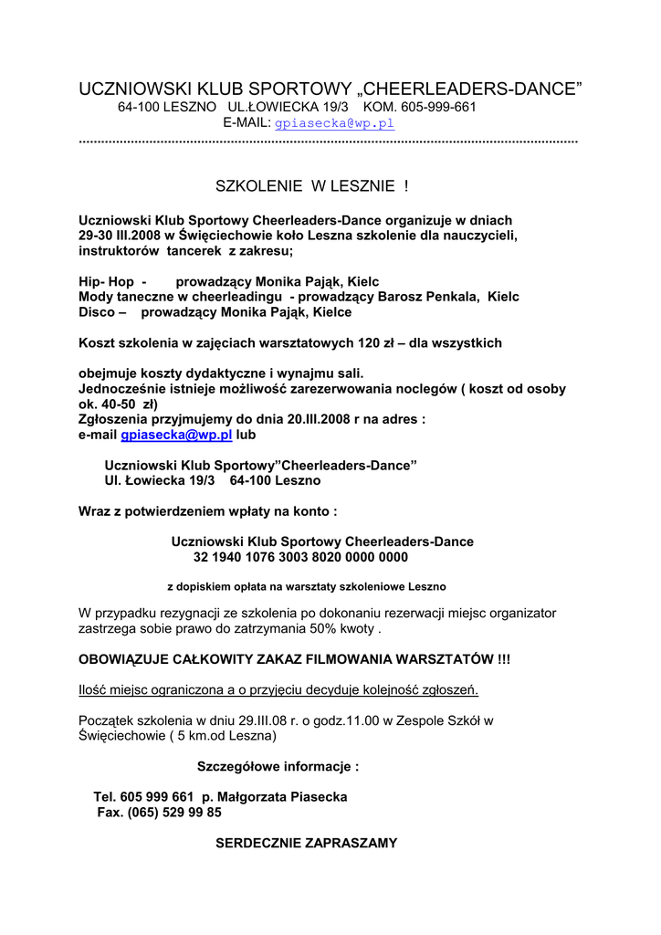 UCZNIOWSKI KLUB SPORTOWY „CHEERLEADERS-DANCE” 64-100 LESZNO UL.ŁOWIECKA 19/3 KOM. 605-999-661 E-MAIL: [email protected] ....................................................................................................................................... SZKOLENIE W LESZNIE ! Uczniowski Klub Sportowy Cheerleaders-Dance organizuje w dniach 29-30 III.2008 w Święciechowie koło Leszna szkolenie dla nauczycieli, instruktorów tancerek z zakresu; Hip- Hop prowadzący Monika Pająk, Kielc Mody taneczne w cheerleadingu - prowadzący Barosz Penkala, Kielc Disco – prowadzący Monika Pająk, Kielce Koszt szkolenia w zajęciach warsztatowych 120 zł – dla wszystkich obejmuje koszty dydaktyczne i wynajmu sali. Jednocześnie istnieje moŜliwość zarezerwowania noclegów ( koszt od osoby ok. 40-50 zł) Zgłoszenia przyjmujemy do dnia 20.III.2008 r na adres : e-mail [email protected] lub Uczniowski Klub Sportowy”Cheerleaders-Dance” Ul. Łowiecka 19/3 64-100 Leszno Wraz z potwierdzeniem wpłaty na konto : Uczniowski Klub Sportowy Cheerleaders-Dance 32 1940 1076 3003 8020 0000 0000 z dopiskiem opłata na warsztaty szkoleniowe Leszno W przypadku rezygnacji ze szkolenia po dokonaniu rezerwacji miejsc organizator zastrzega sobie prawo do zatrzymania 50% kwoty . OBOWIĄZUJE CAŁKOWITY ZAKAZ FILMOWANIA WARSZTATÓW !!! Ilość miejsc ograniczona a o przyjęciu decyduje kolejność zgłoszeń. Początek szkolenia w dniu 29.III.08 r. o godz.11.00 w Zespole Szkół w Święciechowie ( 5 km.od Leszna) Szczegółowe informacje : Tel. 605 999 661 p. Małgorzata Piasecka Fax. (065) 529 99 85 SERDECZNIE ZAPRASZAMY PLAN WARSZTATÓW: SOBOTA ( 29.III 2008 R.) 11.00 – 12.30 12.45 - 13.45 DISCO W CHEERLEADINGU MODY TANECZNE W CHEERLEADINGU 13.45 - 15.15 Przerwa 15.15 – 16.45 17.00- 18.00 HIP-HOP MODY TANECZNE W CHEERLEADINGU ................................................................................................................... NIEDZIELA (30.III.2008 R) 9.00 - 10.30 HIP- HOP w cheerleadingu 10.45- 11.45 MODY TANECZNE w cheerleadingu 12.00 – 13.45 FUNKY 14.00 – 15.00 MODY TANECZNE .................................................................................................................... ZAPRASZAMY WARSZTATY SZKOLENIOWE LESZNO 29-30.III.2008 KARTA ZGŁOSZENIA Imię i nazwisko .......................................................................................... Adres zamieszkania .................................................................................. ................................................................................................................... Telefon ............................................................................................... Dane do rachunku ..................................................................................... .................................................................................................................... . Proszę o zarezerwowanie : ................... noclegów