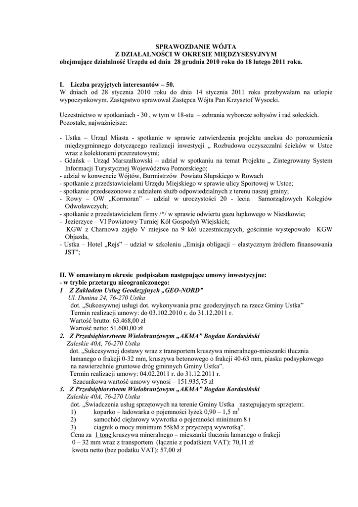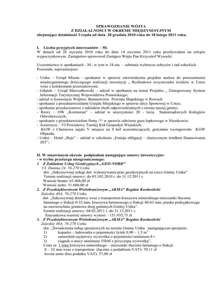 SPRAWOZDANIE WÓJTA Z DZIAŁALNOŚCI W OKRESIE MIĘDZYSESYJNYM obejmujące działalność Urzędu od dnia 28 grudnia 2010 roku do 18 lutego 2011 roku. I. Liczba przyjętych interesantów – 50. W dniach od 28 stycznia 2010 roku do dnia 14 stycznia 2011 roku przebywałam na urlopie wypoczynkowym. Zastępstwo sprawował Zastępca Wójta Pan Krzysztof Wysocki. Uczestnictwo w spotkaniach - 30 , w tym w 18-stu – zebrania wyborcze sołtysów i rad sołeckich. Pozostałe, najwaŜniejsze: - Ustka – Urząd Miasta - spotkanie w sprawie zatwierdzenia projektu aneksu do porozumienia międzygminnego dotyczącego realizacji inwestycji „ Rozbudowa oczyszczalni ścieków w Ustce wraz z kolektorami przerzutowymi; - Gdańsk – Urząd Marszałkowski – udział w spotkaniu na temat Projektu „ Zintegrowany System Informacji Turystycznej Województwa Pomorskiego; - udział w konwencie Wójtów, Burmistrzów Powiatu Słupskiego w Rowach - spotkanie z przedstawicielami Urzędu Miejskiego w sprawie ulicy Sportowej w Ustce; - spotkanie przedsezonowe z udziałem słuŜb odpowiedzialnych z terenu naszej gminy; - Rowy – OW „Kormoran” – udział w uroczystości 20 - lecia Samorządowych Kolegiów Odwoławczych; - spotkanie z przedstawicielem firmy /*/ w sprawie odwiertu gazu łupkowego w Niestkowie; - Jezierzyce – VI Powiatowy Turniej Kół Gospodyń Wiejskich; KGW z Charnowa zajęło V miejsce na 9 kół uczestniczących, gościnnie występowało KGW Objazda, - Ustka – Hotel „Rejs” – udział w szkoleniu „Emisja obligacji – elastycznym źródłem finansowania JST”; II. W omawianym okresie podpisałam następujące umowy inwestycyjne: - w trybie przetargu nieograniczonego: 1 Z Zakładem Usług Geodezyjnych „GEO-NORD” Ul. Dunina 24, 76-270 Ustka dot. „Sukcesywnej usługi dot. wykonywania prac geodezyjnych na rzecz Gminy Ustka” Termin realizacji umowy: do 03.102.2010 r. do 31.12.2011 r. Wartość brutto: 63.468,00 zł Wartość netto: 51.600,00 zł 2. Z Przedsiębiorstwem WielobranŜowym „AKMA” Bogdan Kordasiński Zaleskie 40A, 76-270 Ustka dot. „Sukcesywnej dostawy wraz z transportem kruszywa mineralnego-mieszanki tłucznia łamanego o frakcji 0-32 mm, kruszywa betonowego o frakcji 40-63 mm, piasku podsypkowego na nawierzchnie gruntowe dróg gminnych Gminy Ustka”. Termin realizacji umowy: 04.02.2011 r. do 31.12.2011 r. Szacunkowa wartość umowy wynosi – 151.935,75 zł 3. Z Przedsiębiorstwem WielobranŜowym „AKMA” Bogdan Kordasiński Zaleskie 40A, 76-270 Ustka dot. „Świadczenia usług sprzętowych na terenie Gminy Ustka następującym sprzętem:. 1) koparko – ładowarka o pojemności łyŜek 0,90 – 1,5 m3 2) samochód cięŜarowy wywrotka o pojemności minimum 8 t 3) ciągnik o mocy minimum 55kM z przyczepą wywrotką”. Cena za 1 tonę kruszywa mineralnego – mieszanki tłucznia łamanego o frakcji 0 – 32 mm wraz z transportem (łącznie z podatkiem VAT): 70,11 zł kwota netto (bez podatku VAT): 57,00 zł Cena za 1 tonę kruszywa betonowego o frakcji 40 – 63 mm wraz z transportem (łącznie z podatkiem VAT): 24,60 zł kwota netto (bez podatku VAT): 20,00 zł Cena za 1 tonę piasku podsypkowego wraz z transportem (łącznie z podatkiem VAT): 22,14 zł kwota netto (bez podatku VAT): 18,00 zł Termin realizacji umowy: do 04.02.2011 r. do 31.12.2011 Łączna szacunkowa wartość umowy wynosi : 164.512,50 zł brutto 4. Z Przedsiębiorstwem WielobranŜowym „AKMA” Bogdan Kordasiński Zaleskie 40A, 76-270 Ustka dot. „Sukcesywnej wg indywidualnych zleceń usługi remontowej w zakresie: mechanicznego profilowania dróg gminnych przy uŜyciu równiarki samojezdnej na terenie Gminy Ustka w 2011 roku”. Termin realizacji umowy: 04.02.2011 r. – 31.12.2011 r. wartość brutto za 1 godz. pracy równiarki: 97,17 zł kwota netto (bez podatku VAT): 79,00 zł Łączna szacunkowa wartość umowy nie moŜe przekroczyć: 70.000,00 zł brutto Zamieszczenie ogłoszenia o przetargach w Biuletynie Informacji Publicznej Gminy Ustka oraz na stronie internetowej Urzędu Zamówień Publicznych. 1. Wykonywanie wycen nieruchomości na rzecz Gminy Ustka w 2011 r. (ponownie) 2. Opracowanie planów zagospodarowania przestrzennego dla obrębu geodezyjnego Grabno oraz dla części obrębu geodezyjnego Wytowno – Gmina Ustka. Przetargi będące w toku postępowania: 1. „Budowa boiska wielofunkcyjnego dla dzieci i młodzieŜy wraz z piłkochwytami na działce nr 465/2 w obrębie geodezyjnym Przewłoka, gmina Ustka”. 2.„Sukcesywna dostawa wraz z transportem: kruszywa mineralnego – mieszanki tłucznia łamanego o frakcji 0-32 mm, piasku podsypkowego, betonu towarowego B-25, tarcicy iglastej klasy III oraz usługa sprzętowa przy wykonaniu nawierzchni betonowych dróg gminnych w m. Wodnica (dz. nr 229) i Machowino (dz. nr 165, 12/2)”. 3..„Budowa oświetlenia zewnętrznego w miejscowości Modła Gmina Ustka”. Ponadto: 1. Opracowałam sprawozdanie do Urzędu Marszałkowskiego z realizacji przebudowy ul. Armii Krajowej, Grota Roweckiego w ramach Narodowego Programu Przebudowy Dróg Lokalnych na 2010 r. 2. Dokonałam przeglądu gwarancyjnego przebudowy ul. Armii Krajowej, Grota Roweckiego. (termin usunięcia wszystkich usterek 15.05.2011 r.) 3. ZłoŜyłam wniosek do Agencji Nieruchomości Rolnych o dofinansowanie przebudowy ul. Poziomkowej w m. Grabno. 4. Przygotowałam dokumentację przetargową na opracowanie projektu chodnika łączącego m. Przewłoka i m. Zapadłe oraz do cmentarza w m. MoŜdŜanowo. 6. ZłoŜyłam wnioski do Urzędu Marszałkowskiego o dofinansowanie modernizacji drogi transportu rolnego w m. Wodnca (Zielona Dolina) i w m. Machowino (Machowino Kolonia Zachodnia 8. Przygotowałam materiały do ogłoszenia przetargu na budowę oświetlenia ulicznego w miejscowości Modła. Zmiana warunków przyłączenia. III. Z zakresu przeciwdziałania alkoholizmowi i narkomanii: 1. Zorganizowałam zajęcia opiekuńczo-wychowawcze i socjoterapeutyczne w świetlicy 