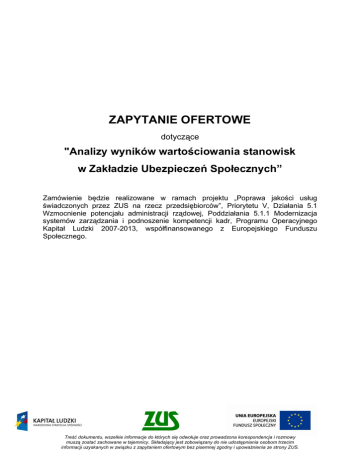 ZAPYTANIE OFERTOWE dotyczące "Analizy wyników wartościowania stanowisk w Zakładzie Ubezpieczeń Społecznych” Zamówienie będzie realizowane w ramach projektu „Poprawa jakości usług świadczonych przez ZUS na rzecz przedsiębiorców”, Priorytetu V, Działania 5.1 Wzmocnienie potencjału administracji rządowej, Poddziałania 5.1.1 Modernizacja systemów zarządzania i podnoszenie kompetencji kadr, Programu Operacyjnego Kapitał Ludzki 2007-2013, współfinansowanego z Europejskiego Funduszu Społecznego. Treść dokumentu, wszelkie informacje do których się odwołuje oraz prowadzona korespondencja i rozmowy muszą zostać zachowane w tajemnicy. Składający jest zobowiązany do nie udostępniania osobom trzecim informacji uzyskanych w związku z zapytaniem ofertowym bez pisemnej zgodny i upoważnienia ze strony ZUS. Zapytanie ofertowe dotyczące "Analizy wyników wartościowania stanowisk w Zakładzie Ubezpieczeń Społecznych” Strona 1 z 4 ___________________________________________________________________________________________________________________________________________________________________________________________________________ 1. Ogólne informacje dotyczące przedmiotu zapytania ofertowego Zakład Ubezpieczeń Społecznych (ZUS) zaprasza do przedłożenia oferty cenowej na przeprowadzenie analizy wyników wartościowania stanowisk pracy w ZUS. Niniejsze zapytanie będzie służyło oszacowaniu wartości przedmiotu zamówienia do przeprowadzenia postępowania o udzielenie zamówienia publicznego w trybie przetargu nieograniczonego. 2. Przedmiot zamówienia Przedmiotem zamówienia będzie przeprowadzenie szczegółowych hierarchicznych analiz wyników wartościowania dla wszystkich stanowisk w Zakładzie Ubezpieczeń Społecznych w zakresie: 1) rozkładów wartościowania w kryteriach: Analiza 1. Doświadczenie zawodowe do Wymagana samodzielność i oczekiwany stopień specjalizacji w wykonywanych zadaniach, Analiza 2. Doświadczenie zawodowe do Odpowiedzialność za realizację zadań przez współpracowników lub podległy personel + Liczba podległych lub koordynowanych pracowników, Analiza 3. Wykształcenie do Odpowiedzialność za realizację zadań przez współpracowników lub podległy personel + Liczba podległych lub koordynowanych pracowników, Analiza 4. Umiejętności personalne do Odpowiedzialność za realizację zadań przez współpracowników lub podległy personel + Liczba podległych lub koordynowanych pracowników, Analiza 5. Wymagana samodzielność i oczekiwany stopień specjalizacji w wykonywanych zadaniach do Doświadczenie zawodowe, Analiza 6. Złożoność zadań i kreatywność do Odpowiedzialność za realizację zadań przez współpracowników lub podległy personel + Liczba podległych lub koordynowanych pracowników, Analiza 7. Wymagana samodzielność i oczekiwany stopień specjalizacji w wykonywanych zadaniach do Złożoność zadań i kreatywność, Analiza 8. Złożoność zadań i kreatywność do Umiejętności personalne, Analiza 9. Złożoność zadań i kreatywność do Wymagana samodzielność i oczekiwany stopień specjalizacji w wykonywanych zadaniach, ______________________________________________________________________________________ Zapytanie ofertowe dotyczące "Analizy wyników wartościowania stanowisk w Zakładzie Ubezpieczeń Społecznych” Strona 2 z 4 ___________________________________________________________________________________________________________________________________________________________________________________________________________ Analiza 10. Złożoność zadań i kreatywność do Odpowiedzialność za realizację zadań przez współpracowników lub podległy personel + Liczba podległych lub koordynowanych pracowników, Analiza 11. Złożoność zadań i kreatywność do Wpływ stanowiska na decyzje + Typ wpływu stanowiska pracy na decyzje, Analiza 12. Odpowiedzialność za realizację zadań przez współpracowników lub podległy personel + Liczba podległych lub koordynowanych pracowników do Doświadczenie zawodowe, Analiza 13. Odpowiedzialność za realizację zadań przez współpracowników lub podległy personel + Liczba podległych lub koordynowanych pracowników do Umiejętności personalne, Analiza 14. Odpowiedzialność za realizację zadań przez współpracowników lub podległy personel + Liczba podległych lub koordynowanych pracowników do Wymagana samodzielność i oczekiwany stopień specjalizacji w wykonywanych zadaniach, Analiza 15. Odpowiedzialność za realizację zadań przez współpracowników lub podległy personel + Liczba podległych lub koordynowanych pracowników do Złożoność zadań i kreatywność, Analiza 16. Odpowiedzialność za realizację zadań przez współpracowników lub podległy personel + Liczba podległych lub koordynowanych pracowników do Wpływ stanowiska na decyzje + Typ wpływu stanowiska pracy na decyzje. 2) zachowania prawidłowej relacji komórek realizujących zadania statutowe ZUS do komórek wspierających, 3) porównania struktury organizacyjnej obowiązującej w Zakładzie z wynikami przeprowadzonego wartościowania celem zdiagnozowania ewentualnych dysfunkcji organizacyjnych, 4) porównania hierarchii stanowisk w ZUS (zgodnie z wynikami wartościowania) z hierarchią adekwatnych stanowisk w innych państwowych jednostkach organizacyjnych (Zamawiający zastrzega sobie możliwość wpływu na wybór w/w jednostek uwzględnionych w analizie). 3. W odpowiedzi prosimy o podanie: 1) ceny przeprowadzenia analizy o podanym wyżej (wraz z zestawieniem wszystkich przewidywanych kosztów), zakresie 2) informacji na temat dotychczasowych doświadczeń oraz osiągnięć w zakresie przeprowadzania wartościowania stanowisk pracy lub audytu procesu wartościowania, ______________________________________________________________________________________ Zapytanie ofertowe dotyczące "Analizy wyników wartościowania stanowisk w Zak