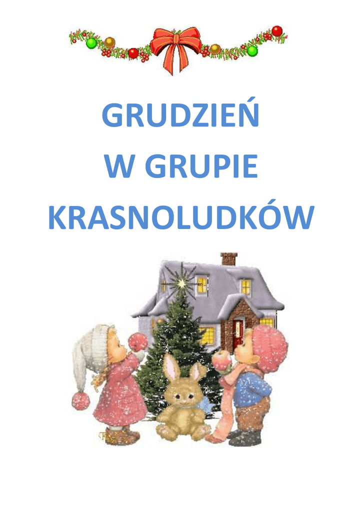 GRUDZIEŃ W GRUPIE KRASNOLUDKÓW Grudzień już za nami. Był to miesiąc pełen wrażeń, który na pewno długo pozostanie w naszej pamięci. Z racji tego że poznajemy różne zawody, odwiedził nas tata Kryspina, który jest górnikiem. Ciekawie opowiedział nam o swojej pracy no i miał galowy mundur, który bardzo nam się podobał. Pokazał nam również zdjęcia kopalni i górników oraz przeczytał opowiadanie „O rozgniewanym węgielku”, z którego dowiedzieliśmy się jak bardzo pożyteczny jest węgiel. Podziękowaliśmy gościowi za przybycie, wręczając mu obrazek, a później z naszą pani układaliśmy historyjkę obrazkową pt. „W kopalni”. Teraz już wiemy, jak wygląda i na czym polega praca górnika. Z niecierpliwością oczekiwaliśmy dnia, w którym miał przybyć do nas Mikołaj. W tym czasie, podróżowaliśmy na biegun północny poprzez różne ćwiczenia i zabawy ruchowe. Odgadywaliśmy także zabawki za pomocą dotyku. Aby w naszej sali zawitała świąteczna atmosfera, przygotowaliśmy i ustroiliśmy lampkami i bombkami choinkę. Teraz już tylko pozostało nam oczekiwać Mikołaja. Gdy nadszedł ten upragniony dzień, byliśmy pełni emocji. Przywitaliśmy naszego gościa piosenką „Witaj Mikołaju”, a później w kółeczku śpiewaliśmy i bawiliśmy się razem z nim przy piosence „Mikołaj jedzie samochodem”, której nauczyła nas Pani Magda na rytmice. Każdy z nas otrzymał prezent i mamy także wspólne zdjęcie z Mikołajem. Ale to nie był koniec niespodzianek, gość przyniósł nam również dużo prezentów dla całej naszej grupy, były to wspaniałe zabawki takie jak: lalki, wózek, kołyska, toaletka, klocki, samochody, pociąg z torami kolejowymi, zestaw majsterkowicza i puzzle. Dziękując za podarki pożegnaliśmy Mikołaja, który obiecał nam że przyjdzie za rok, oczywiście jak będziemy grzeczni. Pełni wrażeń, od razu przystąpiliśmy do zabawy naszymi nowymi zabawkami, to był naprawdę super dzień. Po tej wizycie w dalszym ciągu kontynuowaliśmy temat dotyczący naszego gościa w czerwonej czapce. Bawiliśmy się przy piosence „Mikołajkowe sanie”. Stworzyliśmy nawet orkiestrę, pięknie grając na janczarach i trójkątach. Udało nam się również wykleić sylwetę Mikołaja plasteliną i watą, a nasze prace podziwiać mogli rodzice. Podczas kolejnych grudniowych dni, poruszaliśmy świąteczną tematykę. Rozwiązywaliśmy zagadki słowne i uczestniczyliśmy w wielu ciekawych zabawach. Trwały też owocne przygotowania do wspólnej wigilijki z rodzicami – nauka piosenek, wierszyków i tańców oraz przygotowywanie świątecznych kartek. Spotkanie wigilijkowe przebiegło w miłej atmosferze. W pięknych strojach pokazaliśmy naszym bliskim, czego nauczyliśmy się w przedszkolu. Nasz występ nagrodzony został gromkimi brawami, a my złożyliśmy świąteczne życzenia. Aby nasza choinka była jeszcze piękniejsza, wspólnie z rodzicami wykonaliśmy kolorowy łańcuch, dekorując nim zielone drzewko. Następnego dnia wysłuchaliśmy też opowieści „Historia choinki” i rozmawialiśmy na temat jej treści. Samodzielnie ułożyliśmy także własną z trzech trójkątów na kartce i ozdobiliśmy bombkami. Potrafimy również zaśpiewać piosenkę „Przyszła choinka”, przy której bawiliśmy się wesoło. Chcieliśmy także samodzielnie wykonać ozdoby na nasze drzewko, więc ostro zabraliśmy się do pracy. Ale najpierw nasza pani pokazała nam obrazki pięknie przystrojonych choinek w różnorodny, barwny i ciekawy sposób. Udało nam się zrobić wiele kolorowych ozdób z papieru i samodzielnie powiesić na gałązkach choinki. Opowiedzieliśmy także o przygotowaniach przedświątecznych w naszych domach. Słuchając opowiadania „Borys pomaga mamie”, każdy z nas zrozumiał jak ważne jest pomaganie naszym rodzicom i to nie tylko w przygotowaniach do świąt. Aby rozwijać nasze umiejętności matematyczne, segregowaliśmy bombki według kształtu i koloru oraz poznaliśmy nową figurę geometryczną – koło. Próbowaliśmy odszukać koła w naszej sali i szło nam to całkiem nieźle. Podczas nauki rysowania nowo poznanej figury geometrycznej, utrwaliliśmy ją dokładniej. Święta zbliżały się już wielkimi krokami, a my bawiliśmy się w najlepsze przy piosence „Świąteczne aniołki”. Nie zabrakło też ćwiczeń i zabaw w formie opowieści ruchowej „Świąteczne porządki” oraz innych zabaw muzycznych. Wydzieraliśmy również bombki kawałkami kolorowego papieru, to technika którą już dobrze znamy. Przybyli do nas, jak co miesiąc goście z „Małej Filharmonii”, którzy zaprezentowali nam pięknym sopranowym głosem kolędy i zapoznali z całą nutką. Po tej miłej wizycie, dowiedzieliśmy się na podstawie historyjki obrazkowej o tradycji przyjmowania niespodziewanego gościa podczas wigilii. Odpoczywając grzecznie na leżaczkach, wysłuchaliśmy też wielu ciekawych świątecznych opowieści. Kontynuując nasz temat, nauczyliśmy się piosenki „Idą święta”, którą zilustrowaliśmy ruchem. Z racji tego ze bardzo lubimy zajęcia plastyczne, każdy a nas wykonał aniołka, wyklejając go włóczką, serwetkami i wyciętymi elementami. Dzień przed wigilią poruszyliśmy temat świątecznego stołu, oglądając piękne obrusy, obrazki i słuchając wiersza „Świąteczny stół”. Ten magiczny czas, upłynął nam bardzo szybko i z uśmiechem znów przyszliśmy do przedszkola. Opowiedzieliśmy naszej pani o gwiazdkowych prezentach oraz mile spędzonych świętach. Następnie rozpoczęliśmy noworoczną tematykę, słuchając wiersza „Nowy Rok”. Poznaliśmy też cztery pory roku, nawet potrafimy co nieco powiedzieć o każdej z nich. Były również zabawy i ćwiczenia rytmiczne przy „Piosence noworocznej”. Oglądaliśmy różne kalendarze od najmniejszych po największe, aby dowiedzieć się co oznaczają umieszczone na nich cyferki oraz inne niez