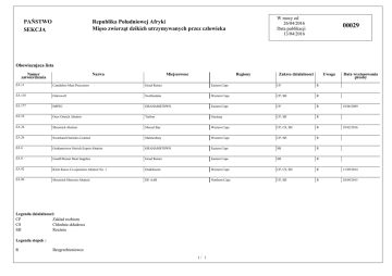 PAŃSTWO SEKCJA W mocy od 26/04/2016 Data publikacji 13/04/2016 Republika Południowej Afryki Mięso zwierząt dzikich utrzymywanych przez człowieka 00029 Obowiazujaca lista Numer zatwierdzenia Nazwa Miejscowosc Regiony Zakres dzialalnosci Uwaga Data wystosowania prosby ZA 11 Camdeboo Meat Processors Graaf Reinet Eastern Cape CP R ZA 118 Ostriswell Swellendam Western Cape CP, SH R ZA 177 IMPEC GRAHAMSTOWN Eastern Cape CP R ZA 19 Oryx Ostrich Abattoir Tarlton Gauteng CP, SH R ZA 24 Mosstrich Abattoir Mossel Bay Western Cape CP, CS, SH R ZA 26 Swartland Ostriches Limited Malmesbury Western Cape CP, SH R ZA 6 Grahamstown Ostrich Export Abattoir GRAHAMSTOWN Eastern Cape SH R ZA 8 Graaff-Reinet Meat Supplies Graaf Reinet Eastern Cape SH R ZA 92 Klein Karoo Co-operation Abattoir No. 1 Oudtshoorn Western Cape CP, CS, SH R 11/09/2014 ZA 96 Mosstrich Moreson Abattoir DE AAR Northern Cape CP, SH R 28/09/2015 Legenda dzialalnosci: CP Zakład rozbioru CS Chłodnia składowa SH Rzeźnia Legenda stopek : R Bezgrzebieniowce 1/ 1 18/06/2009 29/02/2016