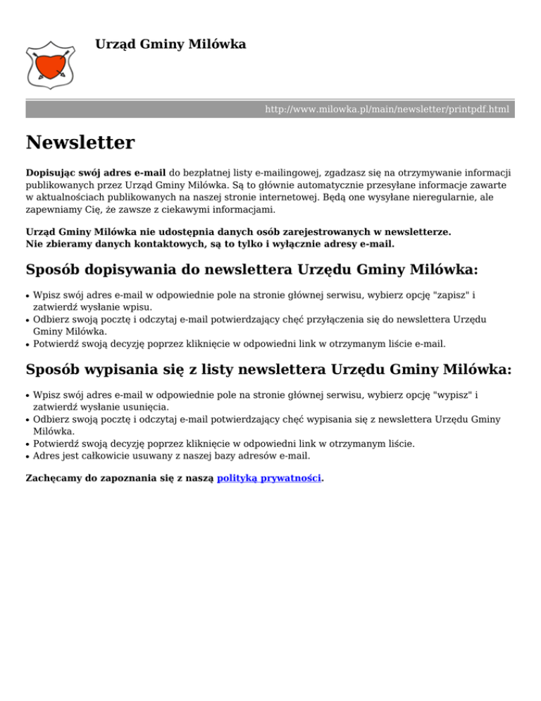 Urząd Gminy Milówka http://www.milowka.pl/main/newsletter/printpdf.html Newsletter Dopisując swój adres e-mail do bezpłatnej listy e-mailingowej, zgadzasz się na otrzymywanie informacji publikowanych przez Urząd Gminy Milówka. Są to głównie automatycznie przesyłane informacje zawarte w aktualnościach publikowanych na naszej stronie internetowej. Będą one wysyłane nieregularnie, ale zapewniamy Cię, że zawsze z ciekawymi informacjami. Urząd Gminy Milówka nie udostępnia danych osób zarejestrowanych w newsletterze. Nie zbieramy danych kontaktowych, są to tylko i wyłącznie adresy e-mail. Sposób dopisywania do newslettera Urzędu Gminy Milówka: ● ● ● Wpisz swój adres e-mail w odpowiednie pole na stronie głównej serwisu, wybierz opcję "zapisz" i zatwierdź wysłanie wpisu. Odbierz swoją pocztę i odczytaj e-mail potwierdzający chęć przyłączenia się do newslettera Urzędu Gminy Milówka. Potwierdź swoją decyzję poprzez kliknięcie w odpowiedni link w otrzymanym liście e-mail. Sposób wypisania się z listy newslettera Urzędu Gminy Milówka: ● ● ● ● Wpisz swój adres e-mail w odpowiednie pole na stronie głównej serwisu, wybierz opcję "wypisz" i zatwierdź wysłanie usunięcia. Odbierz swoją pocztę i odczytaj e-mail potwierdzający chęć wypisania się z newslettera Urzędu Gminy Milówka. Potwierdź swoją decyzję poprzez kliknięcie w odpowiedni link w otrzymanym liście. Adres jest całkowicie usuwany z naszej bazy adresów e-mail. Zachęcamy do zapoznania się z naszą polityką prywatności.