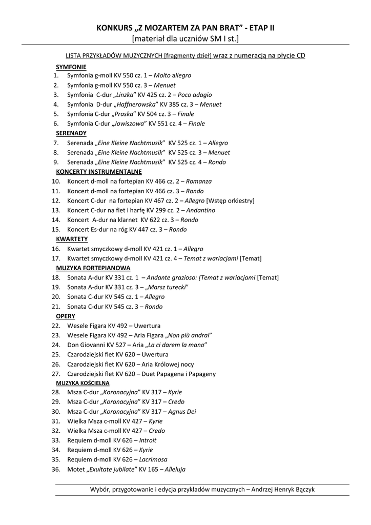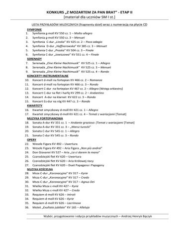 KONKURS „Z MOZARTEM ZA PAN BRAT” - ETAP II [materiał dla uczniów SM I st.] LISTA PRZYKŁADÓW MUZYCZNYCH [fragmenty dzieł] wraz z numeracją na płycie CD SYMFONIE 1. Symfonia g-moll KV 550 cz. 1 – Molto allegro 2. Symfonia g-moll KV 550 cz. 3 – Menuet 3. Symfonia C-dur „Linzka” KV 425 cz. 2 – Poco adagio 4. Symfonia D-dur „Haffnerowska” KV 385 cz. 3 – Menuet 5. Symfonia C-dur „Praska” KV 504 cz. 3 – Finale 6. Symfonia C-dur „Jowiszowa” KV 551 cz. 4 – Finale SERENADY 7. Serenada „Eine Kleine Nachtmusik” KV 525 cz. 1 – Allegro 8. Serenada „Eine Kleine Nachtmusik” KV 525 cz. 3 – Menuet 9. Serenada „Eine Kleine Nachtmusik” KV 525 cz. 4 – Rondo KONCERTY INSTRUMENTALNE 10. Koncert d-moll na fortepian KV 466 cz. 2 – Romanza 11. Koncert d-moll na fortepian KV 466 cz. 3 – Rondo 12. Koncert C-dur na fortepian KV 467 cz. 2 – Allegro [Wstęp orkiestry] 13. Koncert C-dur na flet i harfę KV 299 cz. 2 – Andantino 14. Koncert A-dur na klarnet KV 622 cz. 3 – Rondo 15. Koncert Es-dur na róg KV 447 cz. 3 – Rondo KWARTETY 16. Kwartet smyczkowy d-moll KV 421 cz. 1 – Allegro 17. Kwartet smyczkowy d-moll KV 421 cz. 4 – Temat z wariacjami [Temat] MUZYKA FORTEPIANOWA 18. Sonata A-dur KV 331 cz. 1 – Andante grazioso: [Temat z wariacjami [Temat] 19. Sonata A-dur KV 331 cz. 3 – „Marsz turecki” 20. Sonata C-dur KV 545 cz. 1 – Allegro 21. Sonata C-dur KV 545 cz. 3 – Rondo OPERY 22. Wesele Figara KV 492 – Uwertura 23. Wesele Figara KV 492 – Aria Figara „Non più andrai” 24. Don Giovanni KV 527 – Aria „La ci darem la mano” 25. Czarodziejski flet KV 620 – Uwertura 26. Czarodziejski flet KV 620 – Aria Królowej nocy 27. Czarodziejski flet KV 620 – Duet Papagena i Papageny MUZYKA KOŚCIELNA 28. 29. 30. 31. 32. 33. 34. 35. 36. Msza C-dur „Koronacyjna” KV 317 – Kyrie Msza C-dur „Koronacyjna” KV 317 – Credo Msza C-dur „Koronacyjna” KV 317 – Agnus Dei Wielka Msza c-moll KV 427 – Kyrie Wielka Msza c-moll KV 427 – Credo Requiem d-moll KV 626 – Introit Requiem d-moll KV 626 – Kyrie Requiem d-moll KV 626 – Lacrimosa Motet „Exultate jubilate” KV 165 – Alleluja Wybór, przygotowanie i edycja przykładów muzycznych – Andrzej Henryk Bączyk