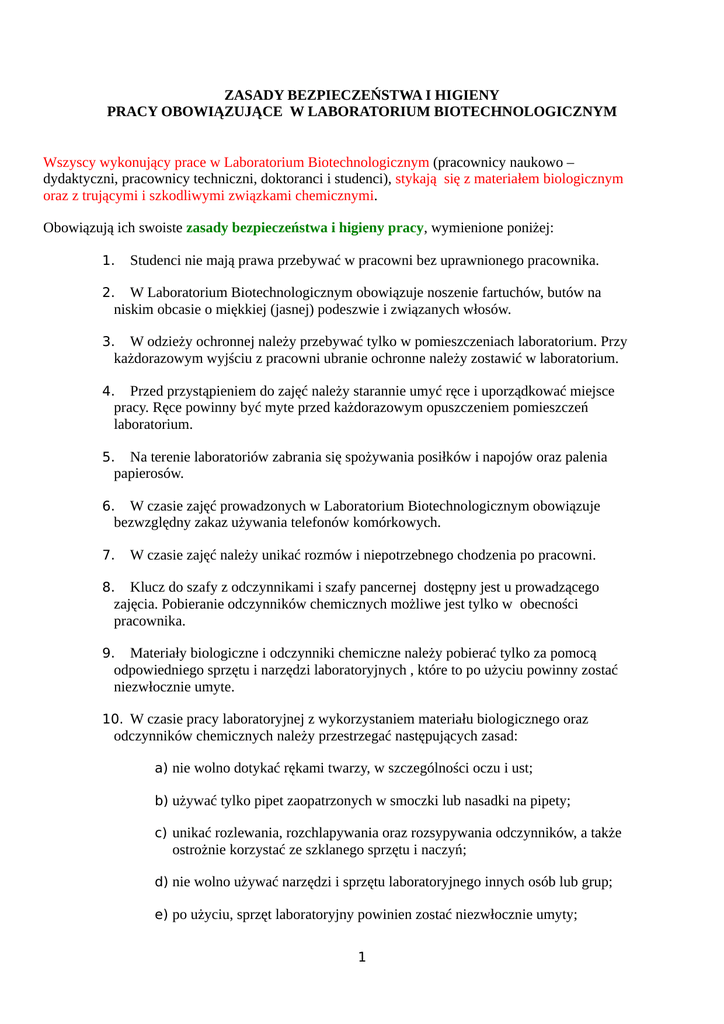 ZASADY BEZPIECZEŃSTWA I HIGIENY PRACY OBOWIĄZUJĄCE W LABORATORIUM BIOTECHNOLOGICZNYM Wszyscy wykonujący prace w Laboratorium Biotechnologicznym (pracownicy naukowo – dydaktyczni, pracownicy techniczni, doktoranci i studenci), stykają się z materiałem biologicznym oraz z trującymi i szkodliwymi związkami chemicznymi. Obowiązują ich swoiste zasady bezpieczeństwa i higieny pracy, wymienione poniżej: 1. Studenci nie mają prawa przebywać w pracowni bez uprawnionego pracownika. W Laboratorium Biotechnologicznym obowiązuje noszenie fartuchów, butów na niskim obcasie o miękkiej (jasnej) podeszwie i związanych włosów. 2. W odzieży ochronnej należy przebywać tylko w pomieszczeniach laboratorium. Przy każdorazowym wyjściu z pracowni ubranie ochronne należy zostawić w laboratorium. 3. Przed przystąpieniem do zajęć należy starannie umyć ręce i uporządkować miejsce pracy. Ręce powinny być myte przed każdorazowym opuszczeniem pomieszczeń laboratorium. 4. Na terenie laboratoriów zabrania się spożywania posiłków i napojów oraz palenia papierosów. 5. W czasie zajęć prowadzonych w Laboratorium Biotechnologicznym obowiązuje bezwzględny zakaz używania telefonów komórkowych. 6. 7. W czasie zajęć należy unikać rozmów i niepotrzebnego chodzenia po pracowni. Klucz do szafy z odczynnikami i szafy pancernej dostępny jest u prowadzącego zajęcia. Pobieranie odczynników chemicznych możliwe jest tylko w obecności pracownika. 8. Materiały biologiczne i odczynniki chemiczne należy pobierać tylko za pomocą odpowiedniego sprzętu i narzędzi laboratoryjnych , które to po użyciu powinny zostać niezwłocznie umyte. 9. 10. W czasie pracy laboratoryjnej z wykorzystaniem materiału biologicznego oraz odczynników chemicznych należy przestrzegać następujących zasad: a) nie wolno dotykać rękami twarzy, w szczególności oczu i ust; b) używać tylko pipet zaopatrzonych w smoczki lub nasadki na pipety; c) unikać rozlewania, rozchlapywania oraz rozsypywania odczynników, a także ostrożnie korzystać ze szklanego sprzętu i naczyń; d) nie wolno używać narzędzi i sprzętu laboratoryjnego innych osób lub grup; e) po użyciu, sprzęt laboratoryjny powinien zostać niezwłocznie umyty; 1 f) prace z substancjami trującymi, żrącymi i lotnymi należy wykonywać pod wyciągiem w rękawiczkach, okularach lub masce ochronnej; w trakcie pracy używany sprzęt laboratoryjny musi pozostawać pod wyciągiem; g) przed przystąpieniem do pracy w pokoju jałowym stoły laboratoryjne oraz sprzęt przetrzeć środkiem dezynfekcyjnym, a powietrze zdezynfekować promieniowaniem UV; h) chronić wzrok i skórę przed szkodliwym promieniowaniem podczas korzystania z lamp emitujących promieniowanie UV. 11. W przypadku awarii sprzętu lub wypadku (do których zalicza się także zbicie naczynia, rozlanie lub rozsypanie odczynnika chemicznego na stół laboratoryjny, podłogę lub odzież), należy natychmiast powiadomić osobę prowadzącą zajęcia lub pracownika laboratorium. 12. W laboratoriach znajdują się apteczki zaopatrzone w leki i sprzęt niezbędny do pierwszej pomocy. Należy postępować stosownie do sytuacji: a) przy zanieczyszczeniach jamy ustnej, wypluć odczynnik chemiczny lub materiał biologiczny i obficie przepłukać jamę ustną dużą ilością wody; b) w przypadku poparzenia oka, oczodół przemyć obficie wodą a następnie zasięgnąć porady lekarskiej; c) przy oparzeniach skóry zasadami lub kwasami, przede wszystkim zmyć dokładnie strumieniem zimnej wody po czym ewentualnie usunąć zanieczyszczoną odzież, następnie w zależności od rodzaju obrażeń zasięgnąć porady lekarskiej; d) w przypadku skaleczenia ranę odkazić roztworem wody utlenionej i nałożyć opatrunek. 13. Urządzenia techniczne powinny być utrzymywane w nienagannej czystości i zaopatrzone w instrukcje dotyczące sposobu ich użycia. 14. Po zakończeniu zajęć należy starannie uporządkować miejsce pracy: a) umyć sprzęt i wyłączyć z sieci aparaty elektryczne; b) przetrzeć blat stołu wodą i wytrzeć do sucha; c) zdjąć ubranie ochronne i umyć ręce. W PRZYPADKU JAKICHKOLWIEK WĄTPLIWOŚCI PODCZAS WYKONYWANIA ĆWICZENIA – PYTAĆ PROWADZĄCEGO ZAJĘCIA ! 2