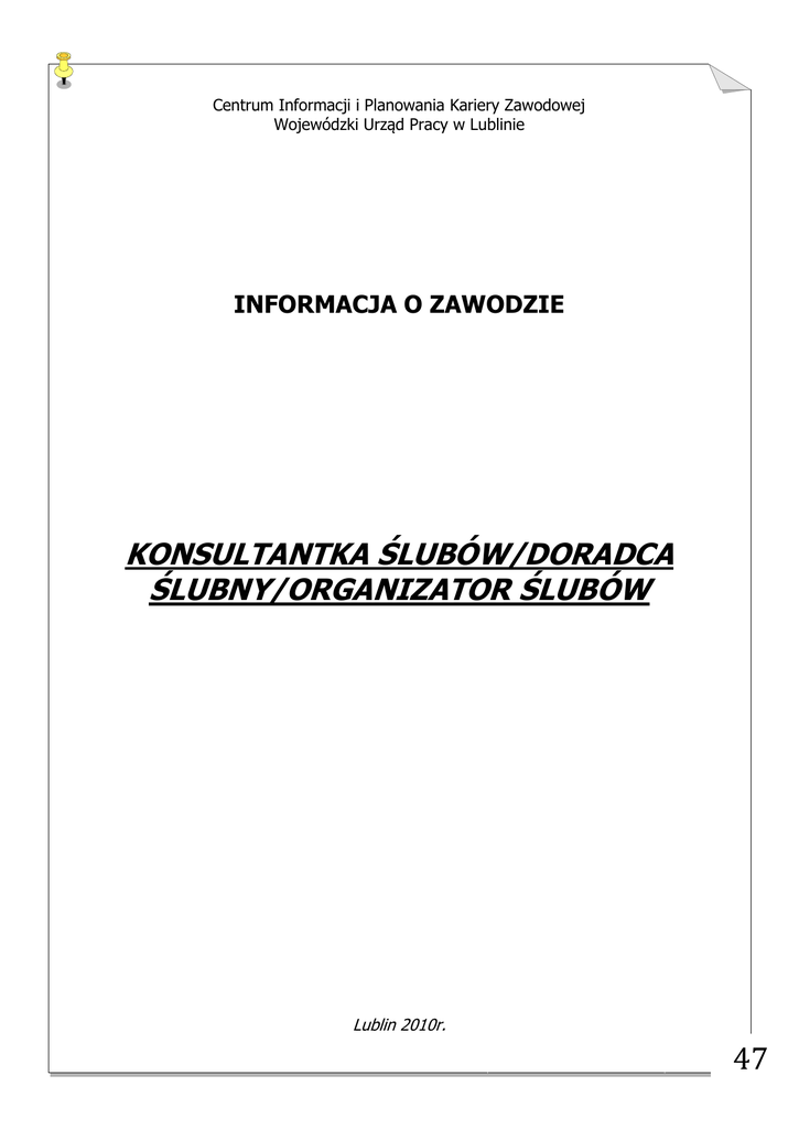 Centrum Informacji i Planowania Kariery Zawodowej Wojewódzki Urząd Pracy w Lublinie INFORMACJA O ZAWODZIE KONSULTANTKA ŚLUBÓW/DORADCA ŚLUBNY/ORGANIZATOR ŚLUBÓW Lublin 2010r. 47 Zawód: Konsultantka ślubów/doradca ślubny/ organizator ślubów Jest to niezależny doradca wynajmowany przez parę młodą w celu zorganizowania i aranżacji ceremonii ślubnych oraz uroczystości weselnych. Jest specjalistą w swojej dziedzinie, znającym branżę ślubno – weselną. Osoba taka potrafi zaplanować i zorganizować uroczystość, korzystając przy tym z usług sprawdzonych podwykonawców (catering, oprawa muzyczna, fotografia, dekoracje itp.). Działa w imieniu Młodej Pary, negocjując z usługodawcami najwyższą jakość usług i najniższe ceny oraz podpisuje umowy. Sprawia, że przygotowania ślubne nie są trudne i czasochłonne. Jest także doskonałym koordynatorem, dzięki któremu wszystko gotowe jest na czas. Również jest doradcą finansowym, który pracuje w ramach wcześniej określonego budżetu ślubnego i dba by budżet ten nie został przekroczony. Umie sprawnie zarządzać procesem organizacji, a w dniu ślubu czuwa nad przygotowaniami oraz przebiegiem przyjęcia. Konsultant prowadzi zwykle własną działalność gospodarczą. Każdy kto chce być wedding plannerem na pewno musi liczyć się z tym, że bardzo dużo czasu spędzi poza domem. W sezonie będzie pracował niemalże w każdy weekend. Natomiast poza sezonem, w miesiącach zimowych i wczesnowiosennych, jest czas na spotkania z klientami, podpisywanie umów itp. Wymagania zawodowe: Konsultant ślubny zna zdecydowaną większość wykonawców oraz ma rozeznanie na temat jakości usług świadczonych przez poszczególne firmy. W swojej ofercie posiada te najlepsze, za które może ręczyć. Posiada wiedzę o aktualnych trendach. Spędza zazwyczaj sporo czasu na zgłębianiu aktualnych stylów w modzie ślubnej oraz trendów w organizacji wesel. Konsultant musi być też trochę psychologiem, który potrafi załagodzić konflikt i pogodzić skłóconą parę. Predyspozycje zawodowe: Dobry konsultant ślubny powinien posiadać umiejętności interpersonalne, które pomogą mu w pracy. Podstawą jest dobra komunikacja. Niezbędne są umiejętności negocjacyjne, które przydają się w kontaktach z klientami i podwykonawcami. Konsultant często musi rozwiązywać trudne problemy, dlatego nie może ulegać stresowi, zwłaszcza w sytuacjach kryzysowych. Poza tym konsultant ślubny powinien być cierpliwy, punktualny, uczciwy, kreatywny, zaangażowany i pozytywnie nastawiony do ludzi. Zatem liczą się przede wszystkim predyspozycje zawodowe, a nie wykształcenie. 48 Zarobki: Najczęściej wynagrodzenie konsultanta zależy od budżetu weselnego i wynosi 10 – 30% weselnych wydatków. Wynagrodzenie zależy od regionu Polski i najczęściej waha się między 6.000 a 12.000 złotych za jedną imprezę. Opracowano na podstawie źródeł: http://pl.wikipedia.org/wiki/Konsultant_%C5%9Blubny http://www.mobilnekobiety.pl/przedsiebiorcza/praca//zobacz/konsultantka-slubna-cala-prawao-zawodzie/ 49