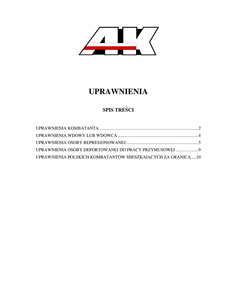 UPRAWNIENIA SPIS TREŚCI UPRAWNIENIA KOMBATANTA .......................................................................................2 UPRAWNIENIA WDOWY LUB WDOWCA .......................................................................4 UPRAWNIENIA OSOBY REPRESJONOWANEJ................................................................5 UPRAWNIENIA OSOBY DEPORTOWANEJ DO PRACY PRZYMUSOWEJ ....................9 UPRAWNIENIA POLSKICH KOMBATANTÓW MIESZKAJĄCYCH ZA GRANICĄ ....10 UPRAWNIENIA KOMBATANTA 1. Kombatanci wraz z emeryturą lub rentą otrzymują co miesiąc: dodatek kombatancki ryczałt energetyczny dodatek kompensacyjny 2. Korzystają z ulg taryfowych 50% przy przejazdach miejskimi środkami komunikacji miejskiej, 37% w komunikacji krajowej przy przejazdach: 1 i 2 klasą pociągów osobowych i pośpiesznych oraz w 2 klasie pociągów innych niŜ osobowe i pośpieszne - na podstawie biletów jednorazowych, autobusami w komunikacji zwykłej i przyspieszonej - na podstawie biletów jednorazowych. 3. Kombatanci korzystają z pierwszeństwa do: środowiskowej opieki socjalnej w miejscu zamieszkania uzyskania miejsc w domach pomocy społecznej opieki zdrowotnej. 4. Okresy działalności kombatanckiej zalicza się do okresów zatrudnienia, od których zaleŜy przyznanie lub wysokość świadczeń przysługujących pracownikom od pracodawcy. Kombatantom pozostającym w zatrudnieniu przysługuje prawo do zwiększenia urlopu wypoczynkowego o 10 dni roboczych ile korzystają z urlopu w wymiarze nie przekraczającym 26 dni roboczych w roku. Kombatanci mogą na swój wniosek przejść na emeryturę po osiągnięciu 55 lat przez kobietę i 60 lat przez męŜczyznę, jeŜeli mają okres zatrudnienia wymagany do uzyskania emerytury. Rozwiązanie stosunku pracy z kombatantem w okresie 2 lat przed osiągnięciem wieku uprawniającego do wcześniejszego przejścia na emeryturę wymaga zgody starosty. Kombatantom, którzy łącznie spełniają następujące warunki: nie posiadają prawa do Ŝadnych świadczeń rentowych lub emerytalnych ani prawa do uposaŜenia w stanie spoczynku albo uposaŜenia rodzinnego, nie osiągają dochodów z tytułu pracy, pozarolniczej działalności gospodarczej podlegającej ubezpieczeniu społecznemu lub z tytułu rolniczej działalności gospodarczej podlegającej obowiązkowemu ubezpieczeniu rolników, osiągnęły wiek dla kobiet - 55 lat, dla męŜczyzn - 60 lat 5. 6. 7. 8. 2 przysługuje świadczenie w wysokości dodatku kombatanckiego oraz ryczałt energetyczny, dodatek kompensacyjny i 37% ulga taryfowa w komunikacji międzymiastowej. Jak uzyskać uprawnienia kombatanta Decyzje o przyznaniu uprawnień kombatanckich wydaje Kierownik Urzędu do Spraw Kombatantów i Osób Represjonowanych na podstawie: udokumentowanego wniosku zainteresowanej osoby, oraz rekomendacji stowarzyszenia właściwego dla określonego rodzaju działalności kombatanckiej. Uwaga: Rekomendacje udzielane są bezpłatnie, nie ma teŜ obowiązku zapisywania się do stowarzyszenia. Do wniosku naleŜy dołączyć: wypełniony czytelnie i podpisany kwestionariusz, Ŝyciorys za szczególnym uwzględnieniem działalności kombatanckiej, 2 aktualne fotografie legitymacyjne (opisane na odwrocie imieniem, nazwiskiem i datą urodzenia), kserokopię dowodu osobistego (w przypadku starych formularzy dowodów kopie stron zawierających dane osobowe, serię i numer dokumentu oraz strony zawierające adres zamieszkania), odcinek emerytury lub renty, dowody potwierdzające działalność kombatancką (np. dokumenty pochodzące z okresu działalności kombatanckiej; zaświadczenia właściwych instytucji, urzędów i archiwów; publikacje; opinie środowiska kombatanckiego; dowodem w sprawie mogą być równieŜ oświadczenia świadków), rekomendację wniosku wystawioną przez stowarzyszenie właściwe dla określonego rodzaju działalności kombatanckiej, osoby działające przez pełnomocników powinny równieŜ dołączyć odpowiednie pełnomocnictwo. Uwaga: wszystkie kopie dokumentów powinny być poświadczone za zgodność z oryginałem. Poświadczenia moŜe dokonać notariusz, urząd administracji rządowej lub samorządowej, upowaŜniony przedstawiciel stowarzyszenia kombatanckiego. 3 UPRAWNIENIA WDOWY LUB WDOWCA Wdowom lub wdowcom - emerytom i rencistom oraz osobom pobierającym uposaŜenie w stanie spoczynku lub uposaŜenie rodzinne - pozostałym po kombatantach i innych osobach uprawnionych przysługuje: ryczałt energetyczny dodatek kompensacyjny ulga taryfowa w wysokości 37% w komunikacji krajowej przy przejazdach: 1 i 2 klasą pociągów osobowych i pośpiesznych oraz w 2 klasie pociągów innych niŜ osobowe i pośpieszne - na podstawie biletów jednorazowych, autobusami w komunikacji zwykłej i przyspieszonej - na podstawie biletów jednorazowych. Jak uzyskać uprawnienia wdowy lub wdowca Decyzje o przyznaniu uprawnień przysługujących wdowom lub wdowcom pozostałym po kombatantach i innych osobach uprawnionych wydaje Kierownik Urzędu do Spraw Kombatantów i Osób Represjonowanych na podstawie udokumentowanego wniosku osoby zainteresowanej. Do wniosku naleŜy dołączyć: wypełniony czytelnie i podpisany kwestionariusz, odpis aktu zgonu małŜonka, odpis aktu małŜeństwa, 2 aktualne fotografie legitymacyjne (opisane na odwrocie imieniem, nazwiskiem i datą urodzenia) dowód posiadanie statusu emeryta lub rencisty kserokopię dowodu osobistego (w przypadku starych formularzy dowodów kopie stron zawierających dane osobowe, serię i numer dokumentu oraz strony zawierające adres zamieszkania), kserokopię: - zaświadczenia o uprawnieniach zmarłego współmałŜonka lub - legitymacji kombatanckiej zmarłego współmałŜonka lub 4 - dowody potwierdzające działalność kombatancką bądź doznane represje - gdy zmarły małŜonek nie posiadał przyznanych uprawnień, rekomendację właściwego stowarzyszenia zrzeszającego kombatantów bądź osoby represjonowane, osoby działające przez
