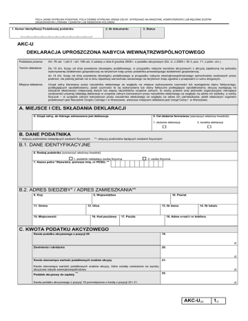 POLA JASNE WYPEŁNIA PODATNIK, POLA CIEMNE WYPEŁNIA URZĄD CELNY. WYPEŁNIAĆ NA MASZYNIE, KOMPUTEROWO LUB RĘCZNIE DUŻYMI DRUKOWANYMI LITERAMI, CZARNYM LUB NIEBIESKIM KOLOREM. 1. Numer Identyfikacji Podatkowej podatnika 2. Nr dokumentu 3. Status AKC-U DEKLARACJA UPROSZCZONA NABYCIA WEWNĄTRZWSPÓLNOTOWEGO Podstawa prawna: Art. 78 ust. 1 pkt 3 i art. 106 ust. 2 ustawy z dnia 6 grudnia 2008 r. o podatku akcyzowym (Dz. U. z 2009 r. Nr 3, poz. 11, z późn. zm.). Termin składania: Do 10 dni, licząc od dnia powstania obowiązku podatkowego, w przypadku nabycia wyrobów akcyzowych z akcyzą zapłaconą na potrzeby wykonywanej działalności gospodarczej na terytorium kraju przez podatnika prowadzącego działalność gospodarczą; do 14 dni, licząc od dnia powstania obowiązku podatkowego w przypadku nabycia wewnątrzwspólnotowego samochodów osobowych przez podmiot, nie później jednak niż w dniu rejestracji samochodu osobowego na terytorium kraju zgodnie z przepisami o ruchu drogowym. Miejsce składania: Urząd celny kierowany przez naczelnika właściwego ze względu na miejsce wykonywania czynności lub wystąpienia stanu faktycznego, podlegających opodatkowaniu; jeżeli czynności te są wykonywane lub stany faktyczne podlegające opodatkowaniu akcyzą występują na obszarze właściwości miejscowej dwóch lub więcej naczelników urzędów celnych, to osoby prawne oraz jednostki organizacyjne niemające osobowości prawnej składają deklaracje w urzędzie celnym kierowanym przez naczelnika właściwego ze względu na adres ich siedziby, a osoby fizyczne – w urzędzie celnym kierowanym przez naczelnika właściwego ze względu na adres ich zamieszkania; jeżeli właściwym organem podatkowym jest Naczelnik Urzędu Celnego I w Warszawie, wówczas miejscem składania jest Urząd Celny I w Warszawie. A. MIEJSCE I CEL SKŁADANIA DEKLARACJI 4. Urząd celny, do którego adresowana jest deklaracja 5. Cel złożenia formularza (zaznaczyć właściwy kwadrat): 1. złożenie deklaracji 2. korekta deklaracji B. DANE PODATNIKA *- dotyczy podmiotów niebędących osobami fizycznymi **- dotyczy podmiotów będących osobami fizycznymi B.1. DANE IDENTYFIKACYJNE 6. Rodzaj podatnika (zaznaczyć właściwy kwadrat) 1. podatnik niebędący osobą fizyczną 7. Nazwa pełna */Nazwisko, pierwsze imię, nr PESEL ** 2. osoba fizyczna B.2. ADRES SIEDZIBY* / ADRES ZAMIESZKANIA** 8. Kraj 9. Województwo 11. Gmina 10. Powiat 12. Ulica 15. Miejscowość 16. Kod pocztowy 13. Nr domu 17. Poczta 14. Nr lokalu 18. Adres e-mail i nr telefonu C. KWOTA PODATKU AKCYZOWEGO Kwota podatku akcyzowego z pozycji 65 19. Zwolnienia i obniżenia 20. Kwota stanowiąca wartość podatkowych znaków akcyzy 21. zł zł Kwota stanowiąca wartość podatkowych znaków akcyzy, które zostały naniesione na wyroby akcyzowe nabyte wewnątrzwspólnotowo. Podatek akcyzowy do zapłaty *** zł 22. Kwota podatku akcyzowego z pozycji 19 pomniejszona o kwotę z pozycji 20 i 21. zł AKC-U(4) 1/3 POLA JASNE WYPEŁNIA PODATNIK, POLA CIEMNE WYPEŁNIA URZĄD CELNY. WYPEŁNIAĆ NA MASZYNIE, KOMPUTEROWO LUB RĘCZNIE DUŻYMI DRUKOWANYMI LITERAMI, CZARNYM LUB NIEBIESKIM KOLOREM. D. OBLICZENIE KWOT PODATKU AKCYZOWEGO OD POSZCZEGÓLNYCH WYROBÓW AKCYZOWYCH ORAZ OD SAMOCHODÓW OSOBOWYCH Lp. a Nazwa wyrobów akcyzowych oraz samochodów osobowych, dla których ustalono odrębne stawki podatkowe (w przypadku samochodów osobowych – podać markę, model, rok produkcji, pojemność skokową silnika i nr nadwozia) b 23. Data powstania obowiązku 1) podatkowego (dzień-miesiąc-rok) c 24. 25. 26. 27. 28. 29. 30. 31. 32. 33. 34. 35. 36. 37. 38. 39. 40. 41. 42. 43. 44. 45. 46. 47. 48. 49. 50. 51. 52. 53. 54. 55. 56. 57. 58. 59. 60. 61. 62. 63. 64. Razem: AKC-U(4) Podstawa obliczenia 2) podatku Ośmiocyfrowy kod CN d Kwota podatku w zł exf Stawka podatku e f g 65. 2/3 POLA JASNE WYPEŁNIA PODATNIK, POLA CIEMNE WYPEŁNIA URZĄD CELNY. WYPEŁNIAĆ NA MASZYNIE, KOMPUTEROWO LUB RĘCZNIE DUŻYMI DRUKOWANYMI LITERAMI, CZARNYM LUB NIEBIESKIM KOLOREM. E. OŚWIADCZENIE PODATNIKA LUB OSOBY REPREZENTUJĄCEJ PODATNIKA Oświadczam, że są mi znane przepisy Kodeksu karnego skarbowego o odpowiedzialności za podanie danych niezgodnych z rzeczywistością. 66. Imię 67. Nazwisko 68. Data wypełnienia deklaracji (dzień – miesiąc – rok) - 69. Podpis (i pieczątka) podatnika lub osoby reprezentującej podatnika - 70. Numer telefonu i adres e-mail podatnika lub osoby reprezentującej podatnika F. ADNOTACJE URZĘDU CELNEGO 71. Uwagi urzędu celnego 72. Identyfikator przyjmującego formularz *** 1) 2) 73. Podpis przyjmującego formularz Pouczenie: W przypadku niewpłacenia w obowiązującym terminie kwoty z poz. 22 lub wpłacenia jej w niepełnej wysokości, niniejsza deklaracja stanowi podstawę do wystawienia tytułu wykonawczego, zgodnie z przepisami ustawy z dnia 17 czerwca 1966 r. o postępowaniu egzekucyjnym w administracji (Dz. U. z 2005 r. Nr 229, poz. 1954, z późn. zm.). Objaśnienia: Datę powstania obowiązku podatkowego w przypadku nabycia wewnątrzwspólnotowego samochodu osobowego niezarejestrowanego wcześniej na terytorium kraju zgodnie z przepisami o ruchu drogowym określa się na podstawie art. 101 ust. 2 ustawy z dnia 6 grudnia 2008 r. o podatku akcyzowym (Dz. U. z 2009 r. Nr 3, poz. 11, z późn. zm.). W przypadku kilogramów i hektolitrów ilość podaje się z dokładnością do dwóch miejsc po przecinku, w przypadku tysięcy litrów, tysięcy kilogramów i tysięcy sztuk - z dokładnością do trzech miejsc po przecinku, a w przypadku gigadżuli - z dokładnością do jednego miejsca po przecinku. Podstawy opodatkowania (wyrażone kwotowo) i kwoty podatków zaokrągla się do pełnych złotych w ten sposób, że końcówki kwot wynoszące mniej niż 50 groszy pomija się, a końcówki kwot wynoszące 50 i więcej groszy podwyższa się do pełnych złotych – zgodnie z art. 63 § 1 ustawy z dnia 29 sierpnia 1997 r. – Ordynacja podatkowa (