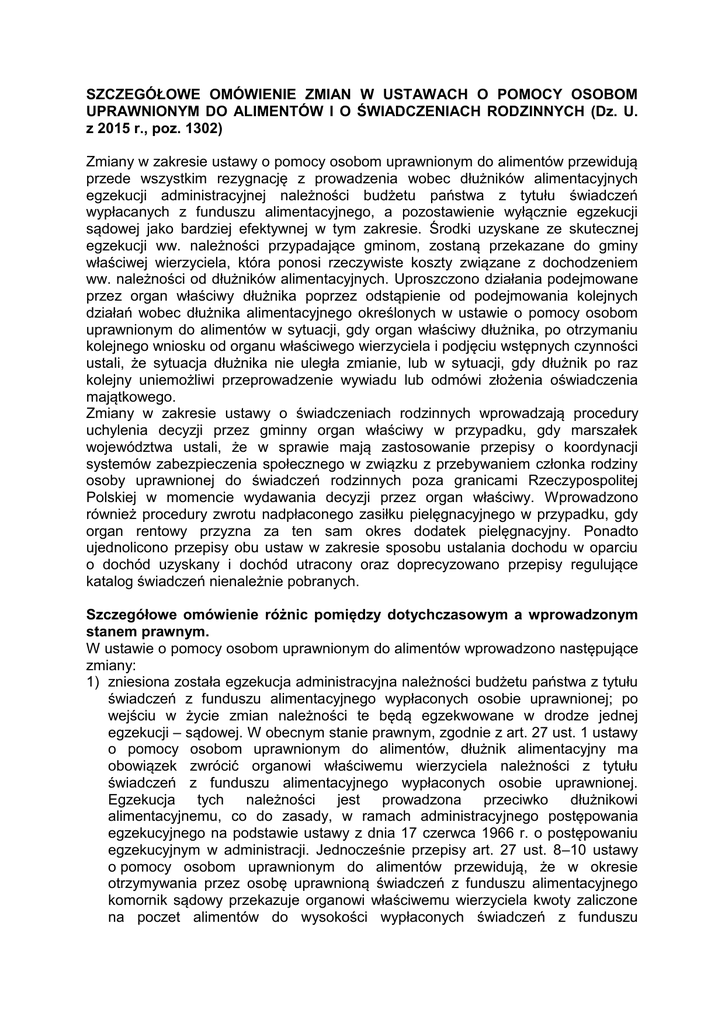 SZCZEGÓŁOWE OMÓWIENIE ZMIAN W USTAWACH O POMOCY OSOBOM UPRAWNIONYM DO ALIMENTÓW I O ŚWIADCZENIACH RODZINNYCH (Dz. U. z 2015 r., poz. 1302) Zmiany w zakresie ustawy o pomocy osobom uprawnionym do alimentów przewidują przede wszystkim rezygnację z prowadzenia wobec dłużników alimentacyjnych egzekucji administracyjnej należności budżetu państwa z tytułu świadczeń wypłacanych z funduszu alimentacyjnego, a pozostawienie wyłącznie egzekucji sądowej jako bardziej efektywnej w tym zakresie. Środki uzyskane ze skutecznej egzekucji ww. należności przypadające gminom, zostaną przekazane do gminy właściwej wierzyciela, która ponosi rzeczywiste koszty związane z dochodzeniem ww. należności od dłużników alimentacyjnych. Uproszczono działania podejmowane przez organ właściwy dłużnika poprzez odstąpienie od podejmowania kolejnych działań wobec dłużnika alimentacyjnego określonych w ustawie o pomocy osobom uprawnionym do alimentów w sytuacji, gdy organ właściwy dłużnika, po otrzymaniu kolejnego wniosku od organu właściwego wierzyciela i podjęciu wstępnych czynności ustali, że sytuacja dłużnika nie uległa zmianie, lub w sytuacji, gdy dłużnik po raz kolejny uniemożliwi przeprowadzenie wywiadu lub odmówi złożenia oświadczenia majątkowego. Zmiany w zakresie ustawy o świadczeniach rodzinnych wprowadzają procedury uchylenia decyzji przez gminny organ właściwy w przypadku, gdy marszałek województwa ustali, że w sprawie mają zastosowanie przepisy o koordynacji systemów zabezpieczenia społecznego w związku z przebywaniem członka rodziny osoby uprawnionej do świadczeń rodzinnych poza granicami Rzeczypospolitej Polskiej w momencie wydawania decyzji przez organ właściwy. Wprowadzono również procedury zwrotu nadpłaconego zasiłku pielęgnacyjnego w przypadku, gdy organ rentowy przyzna za ten sam okres dodatek pielęgnacyjny. Ponadto ujednolicono przepisy obu ustaw w zakresie sposobu ustalania dochodu w oparciu o dochód uzyskany i dochód utracony oraz doprecyzowano przepisy regulujące katalog świadczeń nienależnie pobranych. Szczegółowe omówienie różnic pomiędzy dotychczasowym a wprowadzonym stanem prawnym. W ustawie o pomocy osobom uprawnionym do alimentów wprowadzono następujące zmiany: 1) zniesiona została egzekucja administracyjna należności budżetu państwa z tytułu świadczeń z funduszu alimentacyjnego wypłaconych osobie uprawnionej; po wejściu w życie zmian należności te będą egzekwowane w drodze jednej egzekucji – sądowej. W obecnym stanie prawnym, zgodnie z art. 27 ust. 1 ustawy o pomocy osobom uprawnionym do alimentów, dłużnik alimentacyjny ma obowiązek zwrócić organowi właściwemu wierzyciela należności z tytułu świadczeń z funduszu alimentacyjnego wypłaconych osobie uprawnionej. Egzekucja tych należności jest prowadzona przeciwko dłużnikowi alimentacyjnemu, co do zasady, w ramach administracyjnego postępowania egzekucyjnego na podstawie ustawy z dnia 17 czerwca 1966 r. o postępowaniu egzekucyjnym w administracji. Jednocześnie przepisy art. 27 ust. 8–10 ustawy o pomocy osobom uprawnionym do alimentów przewidują, że w okresie otrzymywania przez osobę uprawnioną świadczeń z funduszu alimentacyjnego komornik sądowy przekazuje organowi właściwemu wierzyciela kwoty zaliczone na poczet alimentów do wysokości wypłaconych świadczeń z funduszu alimentacyjnego wyegzekwowane wraz z odsetkami od dłużnika w ramach egzekucji sądowej. Należności budżetu państwa z tytułu świadczeń z funduszu alimentacyjnego wypłaconych osobie uprawnionej ściągane są zatem w praktyce w ramach dwóch egzekucji: administracyjnej i sądowej. Po wprowadzeniu zmian, należności te będą egzekwowane w ramach jednej egzekucji – sądowej. W konsekwencji, nie będzie już wydawana decyzja administracyjna w sprawie zwrotu przez dłużnika alimentacyjnego należności z tytułu otrzymanych przez osobę uprawnioną świadczeń z funduszu alimentacyjnego ani przeprowadzane czynności konieczne do wszczęcia egzekucji administracyjnej, jak wystawienie i doręczenie tytułu wykonawczego. Po wprowadzeniu zmian organ egzekucyjny prowadzący egzekucję sądową (jest to najczęściej komornik sądowy) będzie ściągał należności budżetu państwa na podstawie decyzji przyznającej osobie uprawnionej świadczenia z funduszu alimentacyjnego przekazanej mu przez organ właściwy wierzyciela. Z uwagi na powyższe zmiany, wprowadzono przepisy przejściowe: przepis o umorzeniu administracyjnych postępowań egzekucyjnych wszczętych na dotychczasowych zasadach wraz z przepisem umożliwiającym dokończenie prowadzonej już przez administracyjne organy egzekucyjne egzekucji administracyjnej, w których wszczęto egzekucję z: nieruchomości, ruchomości, wierzytelności pieniężnej lub innego prawa majątkowego, przepis ustalający dla organów właściwych wierzyciela trzymiesięczny termin od dnia otrzymania postanowienia o umorzeniu administracyjnego postępowania egzekucyjnego, na wystąpienie z wnioskiem do organu egzekucyjnego o wszczęcie lub przyłączenie się do egzekucji sądowej należności budżetu państwa przypadających od dłużnika z tytułu świadczeń wypłaconych z funduszu alimentacyjnego (dotychczas egzekwowanych w drodze egzekucji administracyjnej); 2) zniesiony został podział środków z egzekucji należności z tytułu świadczeń z funduszu alimentacyjnego wypłaconych osobie uprawnionej między gminę wierzyciela i gminę dłużnika; po wejściu w życie zmian, cała 40% kwota środków z egzekucji tych należności będzie stanowić dochód własny gminy wierzyciela. W obecnym stanie prawnym, zgodnie z art. 27 ust. 4 i 5 ustawy o pomocy osobom uprawnionym do alimentów, w przypadku gdy organ właściwy wierzyciela i organ właściwy dłużnika nie są tym samym organem, dzielą między sobą 40% wyegzekwowanej kwoty tych należności. Organ właściwy wierzy