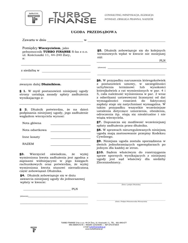 Spółka Z O.O. CONSULTING, WINDYKACJA, EGZKUCJA WYWIAD, OBSŁUGA PRAWNA, NADZÓR UGODA PRZEDSĄDOWA Zawarta w dniu ___________________ w _________________________________________ Pomiędzy Wierzycielem, jako pełnomocnik TURBO FINANSE S-ka z o.o. ul. Kościuszki 11, 44-240 Żory, a: §5. Dłużnik zobowiązuje się do kolejnych terminowych wpłat w kwocie nie mniejszej niż: PLN (słownie) zz siedzibą w ___________________________________________ zwanym dalej Dłużnikiem. § 1. W myśl postanowień niniejszej ugody strony ustalają zasady spłaty zadłużenia wynikającego z: § 2. Dłużnik potwierdza, że na dzień podpisania niniejszej ugody, jego zadłużenie względem wierzyciela wynosi: §6. W przypadku naruszenia któregokolwiek z postanowień umowy, w szczególności uchybienia terminowi lub wysokości którejkolwiek z rat wymienionych w par. 4 i 5, cała należność wymieniona w par. 2 wraz z odsetkami ustawowymi liczonymi od dat wymagalności roszczeń do faktycznej zapłaty staje się natychmiast wymagalna. W takim przypadku wszystkie wcześniejsze ustalenia dotyczące umorzenia, obniżenia, odroczenia itp. stają się nieaktualne i nie wiążą wierzyciela. Nota główna §7. Dopuszcza się możliwość wcześniejszej spłaty zadłużenia przez dłużnika. Nota odsetkowa §8. W sprawach nieuregulowanych niniejszą ugodą mają zastosowanie przepisy Kodeksu Cywilnego. Inne koszty §9. Niniejsza ugoda została sporządzona w dwóch jednobrzmiących egzemplarzach po jednym dla każdej ze stron. RAZEM §3. Wierzyciel oświadcza, że wyżej wymieniona kwota zadłużenia jest zgodna z zapisami widniejącymi w jego księgach rachunkowych oraz potwierdza, że wyżej wymieniona kwota stanowi nierozliczoną część zobowiązań Dłużnika. §4. Dłużnik zobowiązuje się w dniu zawarcia niniejszej ugody do jednorazowej wpłaty w kwocie: §10. Sądem właściwym do rozstrzygania spraw spornych wynikających z niniejszej ugody jest sąd właściwy dla siedziby Zleceniosbiorcy. _________________________________________ (Data i podpis Dłużnika) ______________________________ PLN (słownie) ______________________________________ ___________________________________________ _______________________________________________________________________________________ (Data i Podpis Pełnomocnika Wierzyciela) TURBO FINANSE S-ka z o.o. 44-24 Żory, Ul. Kosciuszki 11, TEL. 661-840-677 KRS 0000414170 :: REGON 122525640 :: NIP 6751473819 e-mail [email protected] www.turbofinanse.pl