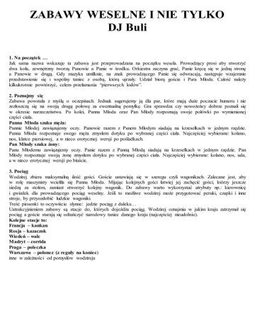 ZABAWY WESELNE I NIE TYLKO DJ Buli 1. Na początek … Jak sama nazwa wskazuje ta zabawa jest przeprowadzana na początku wesela. Prowadzący prosi aby stworzyć dwa koła, zewnętrzny tworzą Panowie a Panie w środku. Orkiestra zaczyna grać, Panie kręcą się w jedną stronę a Panowie w drugą. Gdy muzyka umilknie, na znak prowadzącego Panie się odwracają, następuje wzajemnie przedstawienie się i wspólny taniec z osobą, którą ujrzały. Udział biorą goście i Para Młoda. Całość należy kilkukrotnie powtórzyć, celem przełamania “pierwszych lodów”. 2. Poznajmy się Zabawa powstała z myślą o oczepinach. Jednak sugerujemy ją dla par, które mają duże poczucie humoru i nie zezłoszczą się na swoją drugą połowę za ewentualną pomyłkę. Gra sprawdza czy nowożeńcy dobrze poznali się w okresie narzeczeństwa. Po kolei, Panna Młoda oraz Pan Młody rozpoznają swoje połówki po wymienionej części ciała. Panna Młoda szuka męża: Pannie Młodej zawiązujemy oczy. Panowie razem z Panem Młodym siadają na krzesełkach w jednym rzędzie. Panna Młoda rozpoznaje swego męża zmysłem dotyku po wybranej części ciała. Najczęściej wybierane: kolano, nos, klatce piersiowej, a w nieco erotycznej wersji po pośladkach. Pan Młody szuka żony: Panu Młodemu zawiązujemy oczy. Panie razem z Panną Młodą siadają na krzesełkach w jednym rzędzie. Pan Młody rozpoznaje swoją żonę zmysłem dotyku po wybranej części ciała. Najczęściej wybierane: kolano, nos, uda, a w nieco erotycznej wersji po biuście. 3. Pociąg Wodzirej zbiera maksymalną ilość gości. Goście ustawiają się w szeregu czyli wagonikach. Zalecane jest, aby w rolę maszynisty wcieliła się Panna Młoda. Mijając kolejnych gości łatwiej jej zachęcić gości, którzy jeszcze siedzą za stołem, zamiast stworzyć kolejny wagonik. Do zabawy warto wykorzystać atrybuty np.: kierownicę i gwizdek dla prowadzącego pociąg weselny. Jeśli to możliwe wodzirej może przygotować peruki, czapki i inne stroje, by przyozdobić ludzkie wagoniki. Treść piosenki to oczywiście słynne: jedzie pociąg z daleka… Uatrakcyjnieniem zabawy są stacje do, których dojeżdża pociąg. Wodzirej oznajmia w jakim kraju zatrzymał się pociąg a goście starają się odtańczyć narodowy taniec danego kraju (najczęściej nieudolnie). Kolejne stacje to: Francja – kankan Rosja – kazaczok Wiedeń – walc Madryt – corrida Praga – poleczka Warszawa – polonez (z reguły na koniec) inne w zależności od pomysłów wodzireja 4. Fanty z krzesełkami Idealna ilość uczestników zabawy – od pięciu do dziesięciu. Jest to urozmaicona wersja krzesełek. Zadaniem graczy jest przynoszenie fantów wymienionych przez prowadzącego imprezę. Zabawę zaczyna od najprostszych fantów: zapałki, zegarki, szminki, paski od spodni, buty, staniki, dzbany, marynarki, świece. Uczestnicy mogą usiąść na krześle tylko wtedy gdy znajdą wymagany przedmiot. Osoba, która ostatnia doniesie przedmiot, odpada z gry i zabiera z sobą krzesełko Gdy zmniejsza się liczba uczestników zabawy weselnej podnosimy poprzeczkę żądając coraz bardziej wyszukanych przedmiotów. Wodzirej wydaje polecenie przyniesienia: gaśnicy, największego garnka z kuchni, koła od samochodu, teścia (gdy zostały trzy osoby) i innych ciekawych atrybutów. By zabawa miała swój punkt centralny, fanty powinny być znoszone w jedno miejsce np. na środek sali lub obok stołu Panny i Pana Młodego. Zabawa wypada zwykle lepiej gdy mężczyźni kosztowali już weselnego alkoholu. Łatwiej przychodzi im śmiałość w zdobywaniu fantów, zwłaszcza gdy poziom trudności się zwiększa. 5. Świstaki Tworzymy dwa zespoły po 4 osoby. Zbierzcie zespoły ze strony Pana Młodego i Panny Młodej by zaostrzyć rywalizację. W takim zestawieniu dużo łatwiej o doping dla uczestników zabawy weselnej. Zespoły siadają naprzeciwko siebie (dwa rzędy po cztery krzesła). Wygrywa zespół, który pierwszy wykona zadanie. Zadania wykonywane są po kolei przez każdego z członków drużyny. Po wykonaniu zadania osoba daje sygnał koledze z drużyny, że ta może już zacząć swoje zadanie (klepiąc ją po plecach). Oto zadania: Pierwsza osoba z każdej drużyny je banana. Gdy wykonana zadanie klepię osobę nr 2. Gość weselny nr 2 zjada 2 kawałki dużego ciasta. Gość weselny nr 3 pompuje balon tak, aby pękł. Gość weselny nr 4 ma oczywiście najtrudniejsze i najśmieszniejsze zadanie. Musi zjeść pół szklanki bułki tartej, a następnie…zagwizdać sto lat młodej parze. Pozornie zadanie wygląda na banalne, ale takie wcale nie jest. Dobra zabawa gwarantowana. Bułka tarta wysusza ślinę i przez około 2-3 minuty żaden mężczyzna nie będzie dał rady zagwizdać! Ważną rolę odgrywa prowadzący, który może wykorzystać pełen wachlarz komentarzy w stosunku do dorosłego pana, który nawet nie potrafi zagwizdać… Kto pierwszy ten lepszy! 6. Zbieranie na wózek W zabawie obowiązkowo bierze udział Panna Młoda i Pan Młody. Każdy kto chce zatańczyć z Panną lub Panem Młodym musi wnieść opłatę. Pieniądze zbierają najczęściej świadkowie. Grę można urozmaicić oznajmiając, że grę wygrywa ten, który ostatni zatańczy z Panną Młodą. Goście weselni przebijają swoje stawki odbijając młodą żonę z tańca na taniec. Zebrane pieniądze Para Młoda przeznacza na symboliczny wózek dla nienarodzonego niemowlaka. Wymagana świetna kondycja Panny Młodej gdyż chętnych jest zazwyczaj wielu! 7. Taniec na gazecie Do zabawy zapraszamy od kilku do kilkunastu par. Każdej rozdajemy duży format rozłożonej gazety tej samej wielkości. Pary zaczynają tańczyć. Pary odpadają z gry, gdy wypadną poza swój kawałek gazety. Muzyka przygrywa różne melodie. Co jakiś czas składamy gazetę na pół podnosząc w ten sposób poziom trudności. Tańczymy do momentu aż na parkiecie zostanie 1 para na jak najmniejszym ka