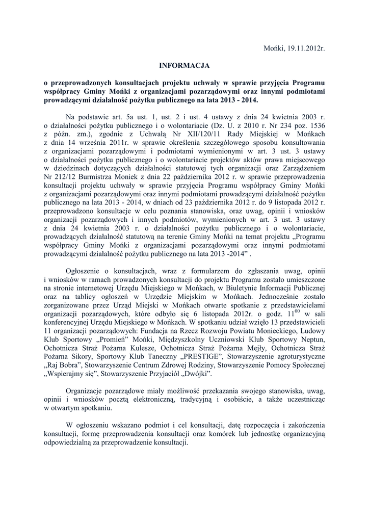 Mońki, 19.11.2012r. INFORMACJA o przeprowadzonych konsultacjach projektu uchwały w sprawie przyjęcia Programu współpracy Gminy Mońki z organizacjami pozarządowymi oraz innymi podmiotami prowadzącymi działalność pożytku publicznego na lata 2013 - 2014. Na podstawie art. 5a ust. 1, ust. 2 i ust. 4 ustawy z dnia 24 kwietnia 2003 r. o działalności pożytku publicznego i o wolontariacie (Dz. U. z 2010 r. Nr 234 poz. 1536 z późn. zm.), zgodnie z Uchwałą Nr XII/120/11 Rady Miejskiej w Mońkach z dnia 14 września 2011r. w sprawie określenia szczegółowego sposobu konsultowania z organizacjami pozarządowymi i podmiotami wymienionymi w art. 3 ust. 3 ustawy o działalności pożytku publicznego i o wolontariacie projektów aktów prawa miejscowego w dziedzinach dotyczących działalności statutowej tych organizacji oraz Zarządzeniem Nr 212/12 Burmistrza Moniek z dnia 22 października 2012 r. w sprawie przeprowadzenia konsultacji projektu uchwały w sprawie przyjęcia Programu współpracy Gminy Mońki z organizacjami pozarządowymi oraz innymi podmiotami prowadzącymi działalność pożytku publicznego na lata 2013 - 2014, w dniach od 23 października 2012 r. do 9 listopada 2012 r. przeprowadzono konsultacje w celu poznania stanowiska, oraz uwag, opinii i wniosków organizacji pozarządowych i innych podmiotów, wymienionych w art. 3 ust. 3 ustawy z dnia 24 kwietnia 2003 r. o działalności pożytku publicznego i o wolontariacie, prowadzących działalność statutową na terenie Gminy Mońki na temat projektu „Programu współpracy Gminy Mońki z organizacjami pozarządowymi oraz innymi podmiotami prowadzącymi działalność pożytku publicznego na lata 2013 -2014” . Ogłoszenie o konsultacjach, wraz z formularzem do zgłaszania uwag, opinii i wniosków w ramach prowadzonych konsultacji do projektu Programu zostało umieszczone na stronie internetowej Urzędu Miejskiego w Mońkach, w Biuletynie Informacji Publicznej oraz na tablicy ogłoszeń w Urzędzie Miejskim w Mońkach. Jednocześnie zostało zorganizowane przez Urząd Miejski w Mońkach otwarte spotkanie z przedstawicielami organizacji pozarządowych, które odbyło się 6 listopada 2012r. o godz. 1100 w sali konferencyjnej Urzędu Miejskiego w Mońkach. W spotkaniu udział wzięło 13 przedstawicieli 11 organizacji pozarządowych: Fundacja na Rzecz Rozwoju Powiatu Monieckiego, Ludowy Klub Sportowy „Promień” Mońki, Międzyszkolny Uczniowski Klub Sportowy Neptun, Ochotnicza Straż Pożarna Kulesze, Ochotnicza Straż Pożarna Mejły, Ochotnicza Straż Pożarna Sikory, Sportowy Klub Taneczny „PRESTIGE”, Stowarzyszenie agroturystyczne „Raj Bobra”, Stowarzyszenie Centrum Zdrowej Rodziny, Stowarzyszenie Pomocy Społecznej „Wspierajmy się”, Stowarzyszenie Przyjaciół „Dwójki”. Organizacje pozarządowe miały możliwość przekazania swojego stanowiska, uwag, opinii i wniosków pocztą elektroniczną, tradycyjną i osobiście, a także uczestnicząc w otwartym spotkaniu. W ogłoszeniu wskazano podmiot i cel konsultacji, datę rozpoczęcia i zakończenia konsultacji, formę przeprowadzenia konsultacji oraz komórek lub jednostkę organizacyjną odpowiedzialną za przeprowadzenie konsultacji. W wyznaczonym terminie przeprowadzenia konsultacji zarówno wypełniając formularz, jak i poprzez uczestnictwo w otwartym spotkaniu nie zgłoszono żadnych uwag, opinii i wniosku do przedstawionego projektu uchwały. W celu podjęcia do realizacji projekt uchwały w sprawie przyjęcia Programu współpracy Gminy Mońki z organizacjami pozarządowymi oraz innymi podmiotami prowadzącymi działalność pożytku publicznego na lata 2013 - 2014, powyższy projekt zostanie wniesiony pod obrady najbliższej sesji Rady Miejskiej w Mońkach. Burmistrz Moniek mgr Zbigniew Karwowski