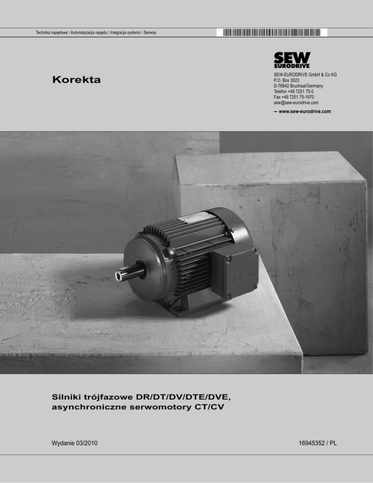 Technika napędowa \ Automatyzacja napędu \ Integracja systemu \ Serwisy Korekta SEW-EURODRIVE GmbH & Co KG P.O. Box 3023 D-76642 Bruchsal/Germany Telefon +49 7251 75-0 Fax +49 7251 75-1970 [email protected] www.sew-eurodrive.com Silniki trójfazowe DR/DT/DV/DTE/DVE, asynchroniczne serwomotory CT/CV Wydanie 03/2010 16945352 / PL Korekta Podłączenie silnika poprzez złącze wtykowe IS 1 1 Korekta WSKAZÓWKA Do instrukcji obsługi "Silniki trójfazowe DR/DV/DT/DTE/DVE, asynchroniczne serwomotory CT/CV" (nr katalogowy 11291745, wydanie 08/2004) dostępne są uzupełnienia zawarte w niniejszym arkuszu z korektą. Korekta odnosi się do wymienionych poniżej rozdziałów: • • Rozdział 5.12: "Podłączenie silnika poprzez złącze wtykowe IS", strona 17 Rozdział 6.1: "Warunki, które należy spełnić przed uruchomieniem", strona 28 Prosimy zastosować podane tu dane. Niniejsza dokumentacja nie zastępuje wymienionej instrukcji obsługi. 1.1 Podłączenie silnika poprzez złącze wtykowe IS Dolna część złącza IS okablowana jest już całkowicie fabrycznie, łącznie z wyprowadzeniami dodatkowymi jak np. prostownik hamulca. Górna część wtyczki IS jest częścią wyposażenia i musi zostać podłączona zgodnie ze schematem. OSTRZEŻENIE! Brak uziemienia wskutek błędnego montażu. Śmierć lub ciężkie uszkodzenia ciała. • • 1.2 Należy bezwzględnie przestrzegać podczas instalacji wskazówek bezpieczeństwa z rozdziału 2 w danej instrukcji obsługi! Śruby mocujące złącza wtykowego IS dociągnąć fachowo z siłą 2 Nm (17.7 lb-in), ponieważ te śruby odpowiedzialne są również za styk przewodu ochronnego. Warunki, które należy spełnić przed uruchomieniem Przed uruchomieniem należy upewnić się, czy układ zwalniania ręcznego z blokadą posiada odpowiednie dopuszczenia. 2 Korekta – Silniki trójfazowe DR/DV/DT/DTE/DVE, asynchroniczne serwomotory CT/CV