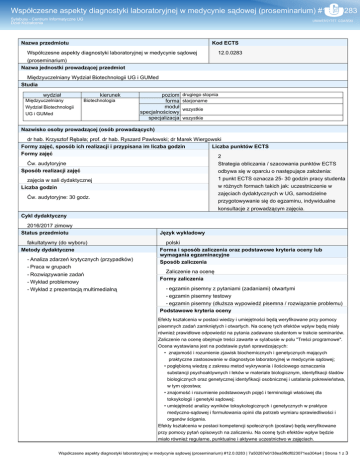 Współczesne aspekty diagnostyki laboratoryjnej w medycynie sądowej (proseminarium) #12.0.0283 Sylabusy - Centrum Informatyczne UG Dział Kształcenia Nazwa przedmiotu Kod ECTS Współczesne aspekty diagnostyki laboratoryjnej w medycynie sądowej 12.0.0283 (proseminarium) Nazwa jednostki prowadzącej przedmiot Międzyuczelniany Wydział Biotechnologii UG i GUMed Studia wydział Międzyuczelniany Wydział Biotechnologii UG i GUMed kierunek Biotechnologia poziom forma moduł specjalnościowy specjalizacja drugiego stopnia stacjonarne wszystkie wszystkie Nazwisko osoby prowadzącej (osób prowadzących) dr hab. Krzysztof Rębała; prof. dr hab. Ryszard Pawłowski; dr Marek Wiergowski Formy zajęć, sposób ich realizacji i przypisana im liczba godzin Liczba punktów ECTS Formy zajęć 2 Ćw. audytoryjne Sposób realizacji zajęć Strategia obliczania / szacowania punktów ECTS odbywa się w oparciu o następujące założenia: 1 punkt ECTS oznacza 25- 30 godzin pracy studenta zajęcia w sali dydaktycznej Liczba godzin w różnych formach takich jak: uczestniczenie w zajęciach dydaktycznych w UG, samodzielne przygotowywanie się do egzaminu, indywidualne konsultacje z prowadzącym zajęcia. Ćw. audytoryjne: 30 godz. Cykl dydaktyczny 2016/2017 zimowy Status przedmiotu fakultatywny (do wyboru) Metody dydaktyczne - Analiza zdarzeń krytycznych (przypadków) - Praca w grupach - Rozwiązywanie zadań - Wykład problemowy - Wykład z prezentacją multimedialną Język wykładowy polski Forma i sposób zaliczenia oraz podstawowe kryteria oceny lub wymagania egzaminacyjne Sposób zaliczenia Zaliczenie na ocenę Formy zaliczenia - egzamin pisemny z pytaniami (zadaniami) otwartymi - egzamin pisemny testowy - egzamin pisemny (dłuższa wypowiedź pisemna / rozwiązanie problemu) Podstawowe kryteria oceny Efekty kształcenia w postaci wiedzy i umiejętności będą weryfikowane przy pomocy pisemnych zadań zamkniętych i otwartych. Na ocenę tych efektów wpływ będą miały również prawidłowe odpowiedzi na pytania zadawane studentom w trakcie seminariów. Zaliczenie na ocenę obejmuje treści zawarte w sylabusie w polu "Treści programowe". Ocena wystawiana jest na podstawie pytań sprawdzających: • znajomość i rozumienie zjawisk biochemicznych i genetycznych mających praktyczne zastosowanie w diagnostyce laboratoryjnej w medycynie sądowej; • pogłębioną wiedzę z zakresu metod wykrywania i ilościowego oznaczania substancji psychoaktywnych i leków w materiale biologicznym, identyfikacji śladów biologicznych oraz genetycznej identyfikacji osobnicznej i ustalania pokrewieństwa, w tym ojcostwa; • znajomość i rozumienie podstawowych pojęć i terminologii właściwej dla toksykologii i genetyki sądowej; • umiejętność analizy wyników toksykologicznych i genetycznych w praktyce medyczno-sądowej i formułowania opinii dla potrzeb wymiaru sprawiedliwości i organów ścigania. Efekty kształcenia w postaci kompetencji społecznych (postaw) będą weryfikowane przy pomocy pytań opisowych na zaliczeniu. Na ocenę tych efektów wpływ będzie miało również regularne, punktualne i aktywne uczestnictwo w zajęciach. Współczesne aspekty diagnostyki laboratoryjnej w medycynie sądowej (proseminarium) #12.0.0283 | 7a50287e6138ea5f6df023071ea304a4 | Strona 1 z 3 Współczesne aspekty diagnostyki laboratoryjnej w medycynie sądowej (proseminarium) #12.0.0283 Sylabusy - Centrum Informatyczne UG Dział Kształcenia Sposób weryfikacji założonych efektów kształcenia Efekty kształcenia w postaci wiedzy i umiejętności będą weryfikowane przy pomocy pisemnych zadań zamkniętych i otwartych. Na ocenę tych efektów wpływ będą miały również prawidłowe odpowiedzi na pytania zadawane studentom w trakcie seminariów. Efekty kształcenia w postaci kompetencji społecznych (postaw) będą weryfikowane przy pomocy pytań opisowych na zaliczeniu. Na ocenę tych efektów wpływ będzie miało również regularne, punktualne i aktywne uczestnictwo w zajęciach. Określenie przedmiotów wprowadzających wraz z wymogami wstępnymi A. Wymagania formalne - B. Wymagania wstępne Biochemia, genetyka, biologia molekularna Cele kształcenia W toku zajęć student: K_W01 - pozna i zrozumie zjawiska biochemiczne i genetyczne mające praktyczne zastosowanie w diagnostyce laboratoryjnej w medycynie sądowej, pozna ich znaczenie w badaniach toksykologicznych i genetycznych dla potrzeb wymiaru sprawiedliwości i organów ścigania K_W02 - posiądzie pogłębioną wiedzę z zakresu metod wykrywania i ilościowego oznaczania substancji psychoaktywnych i leków w materiale biologicznym, identyfikacji śladów biologicznych oraz genetycznej identyfikacji osobniczej i ustalania pokrewieństwa, w tym ojcostwa K_U06 - pozna język naukowy, w tym specjalistyczną terminologię i aparat pojęciowy właściwy dla toksykologii i genetyki sądowej oraz pokrewnych dziedzin i dyscyplin naukowych wykorzystywanych w praktyce medyczno-sądowej K_K01 - posiądzie świadomość potrzeby stałego doskonalenia, aktualizowania wiedzy i podnoszenia kwalifikacji w pracy laboratoryjnej w zakresie toksykologii i genetyki sądowej K_K03 - nabędzie umiejętność efektywnego planowania pracy związanej z opracowaniami z zakresu diagnostyki laboratoryjnej w medycynie sądowej Treści programowe W programie zajęć znajdują się zagadnienia z zakresu współczesnych metod laboratoryjnych w medycynie sądowej, a w szczególności: • podstawowych zagadnień z toksykologii sądowej, w tym pojęcia trucizn, referencyjnych stężeń terapeutycznych, toksycznych i śmiertelnych; • podstawowych technik analizy toksykologicznej; • wiedzy z zakresu najczęściej spotykanych zatruć przypadkowych, samobójczych i zbrodniczych; • problematyki substancji psychoaktywnych spotykanych w przeszłości i obecnie, w tym tzw. dopalaczy i substancji psychoaktywnych nowej generacji; • uwarunkowań prawnych dotyczących zażywania u